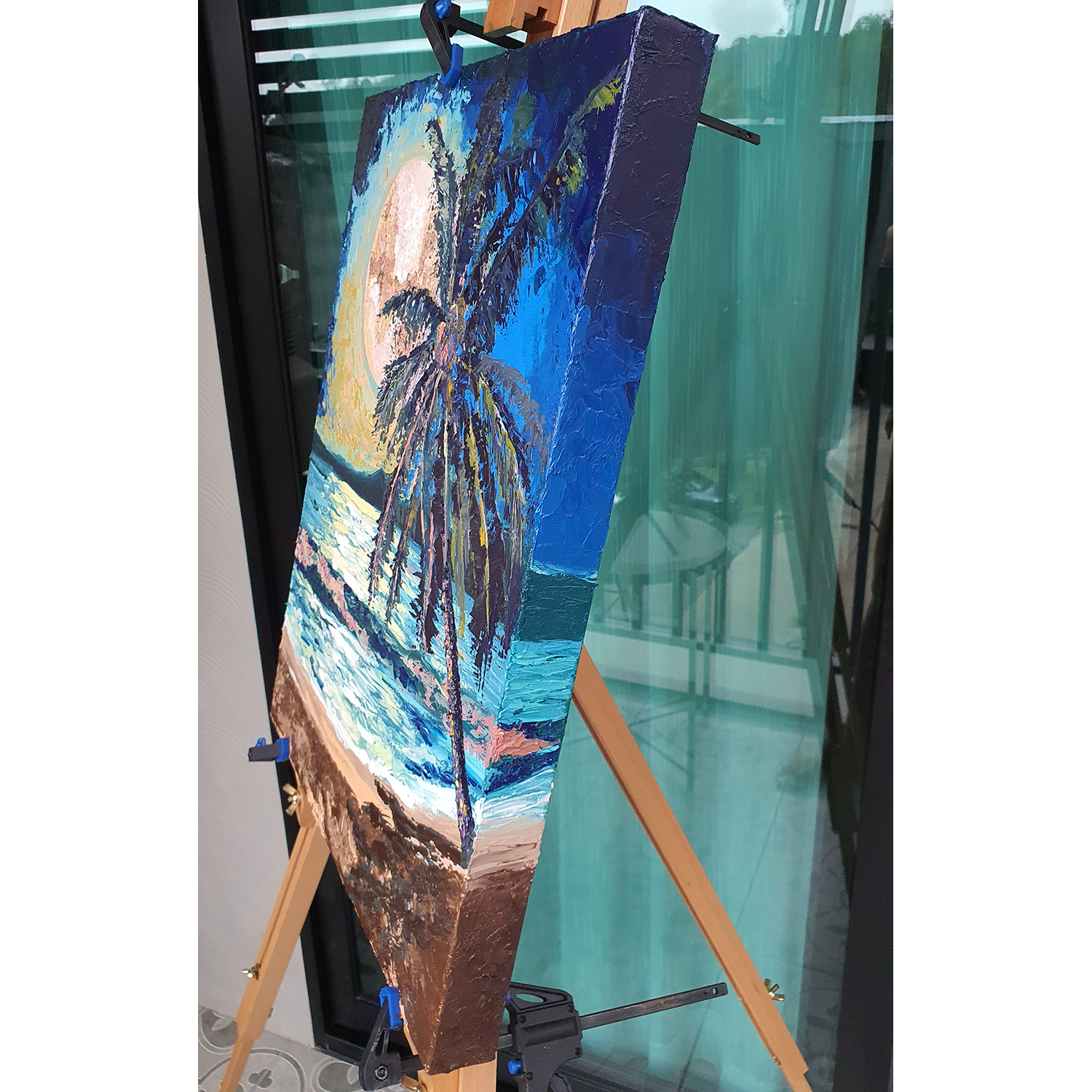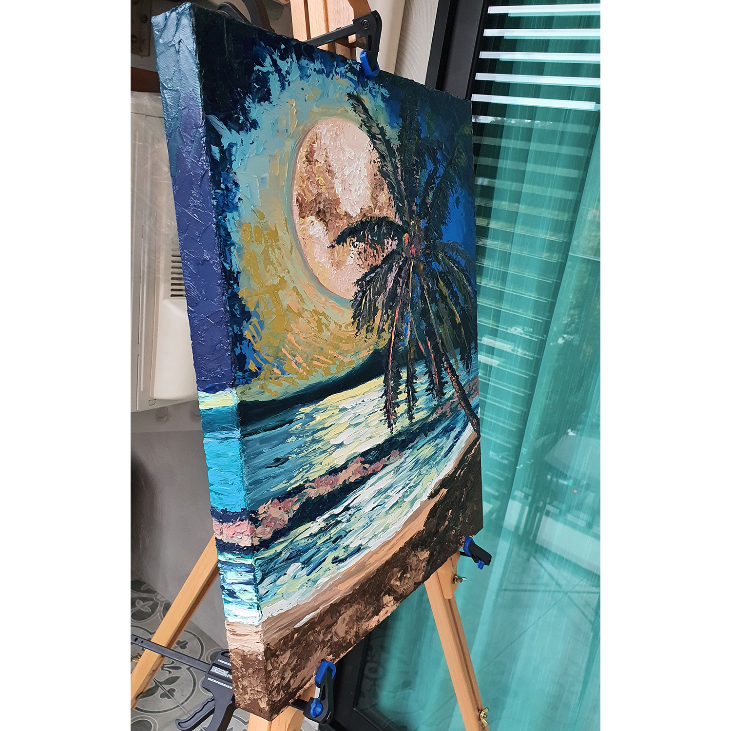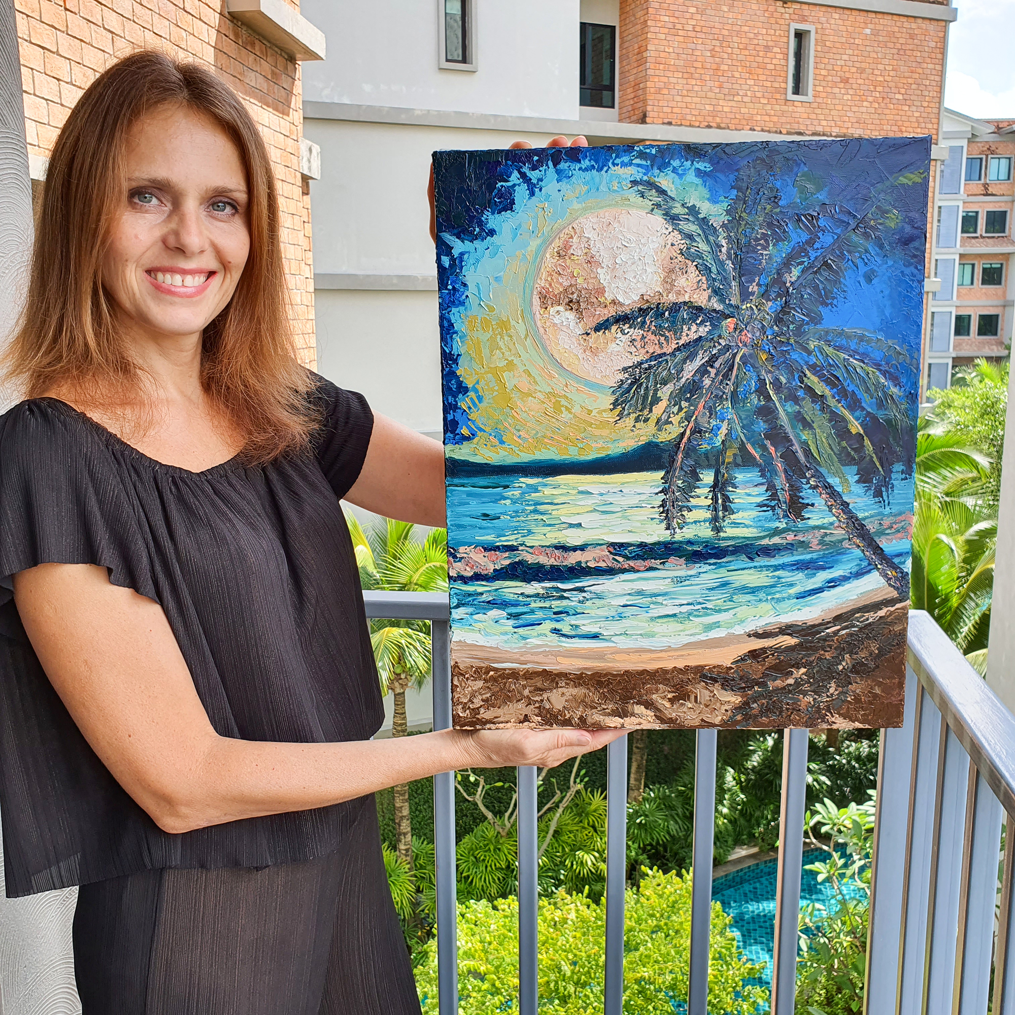 “Seascape with a Palm Tree under the Moon” is an original large-scale oil painting inspired by the magical atmosphere of tropical seaside evenings. Living close to the ocean, I am constantly surrounded by its beauty and ever-changing light, and this painting reflects those peaceful moments when day slowly turns into night.
