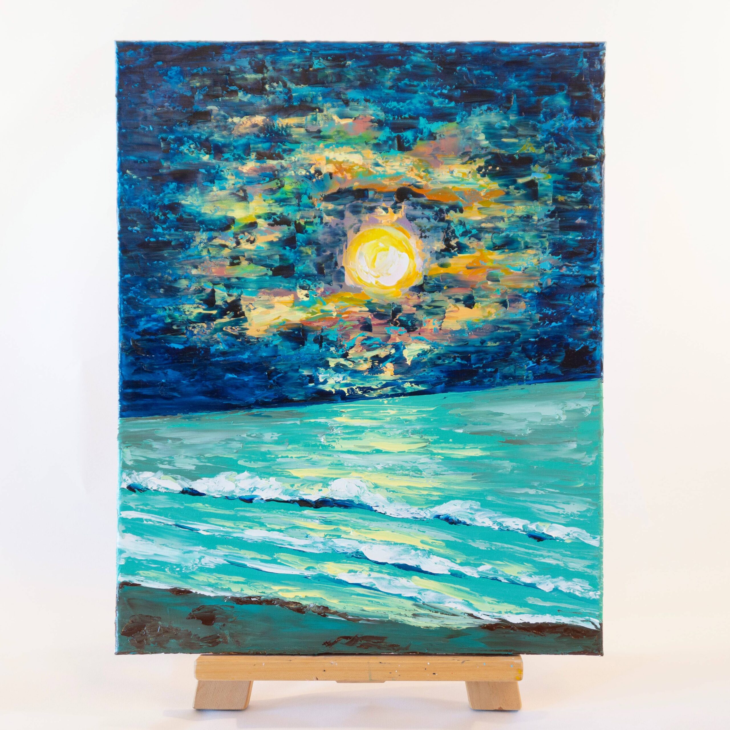 “Seascape with Moonlit Sky” is an original oil painting capturing the quiet poetry of the ocean under moonlight. A luminous moon rises above the horizon, casting a shimmering path of light across the dark, moving water and transforming the sea into a reflective, almost dreamlike landscape.