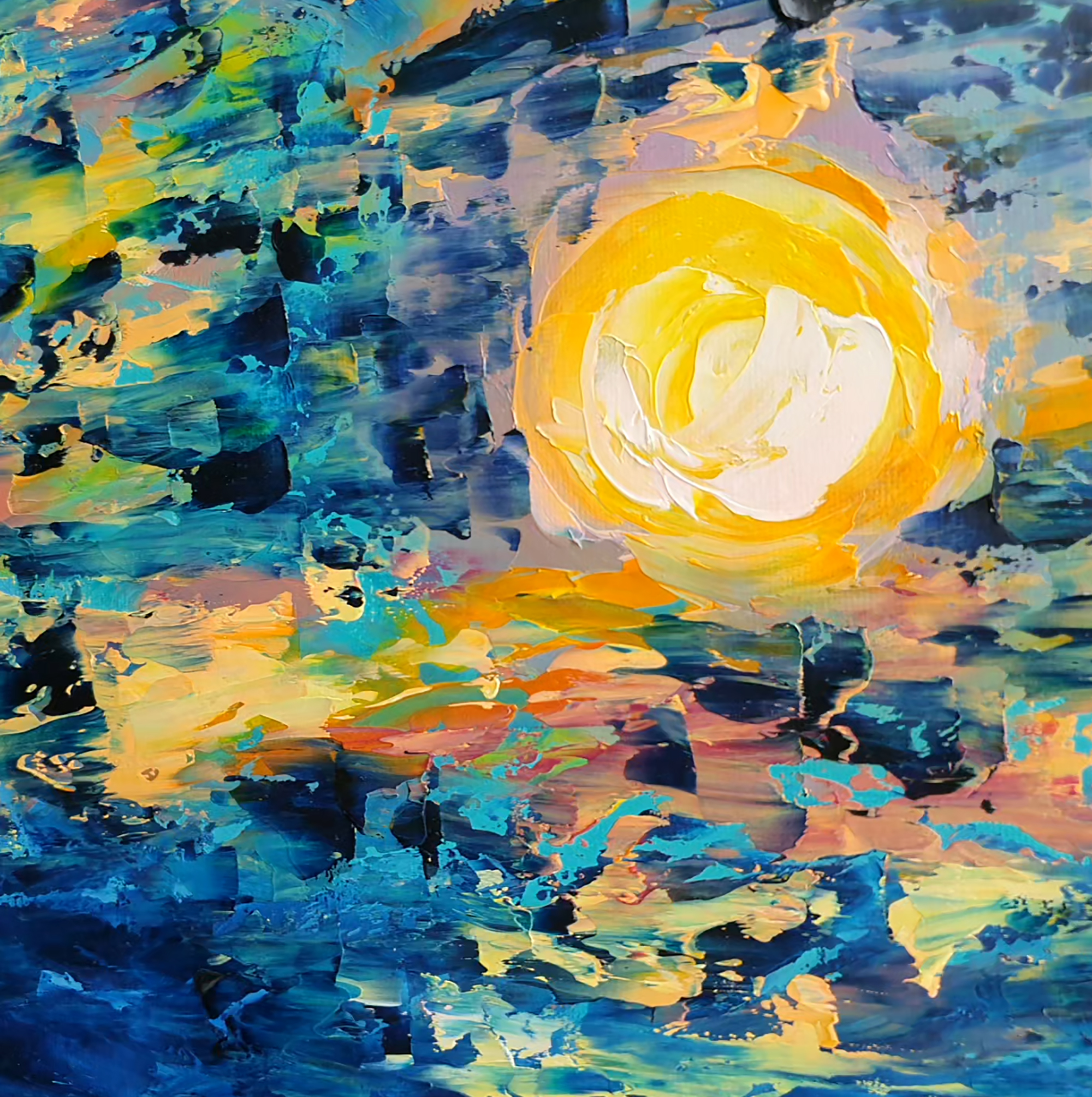 The painting explores the dialogue between light and depth: layered tones of blue and silver create a sense of space and movement, while the glowing reflection on the water becomes the central visual rhythm of the composition.