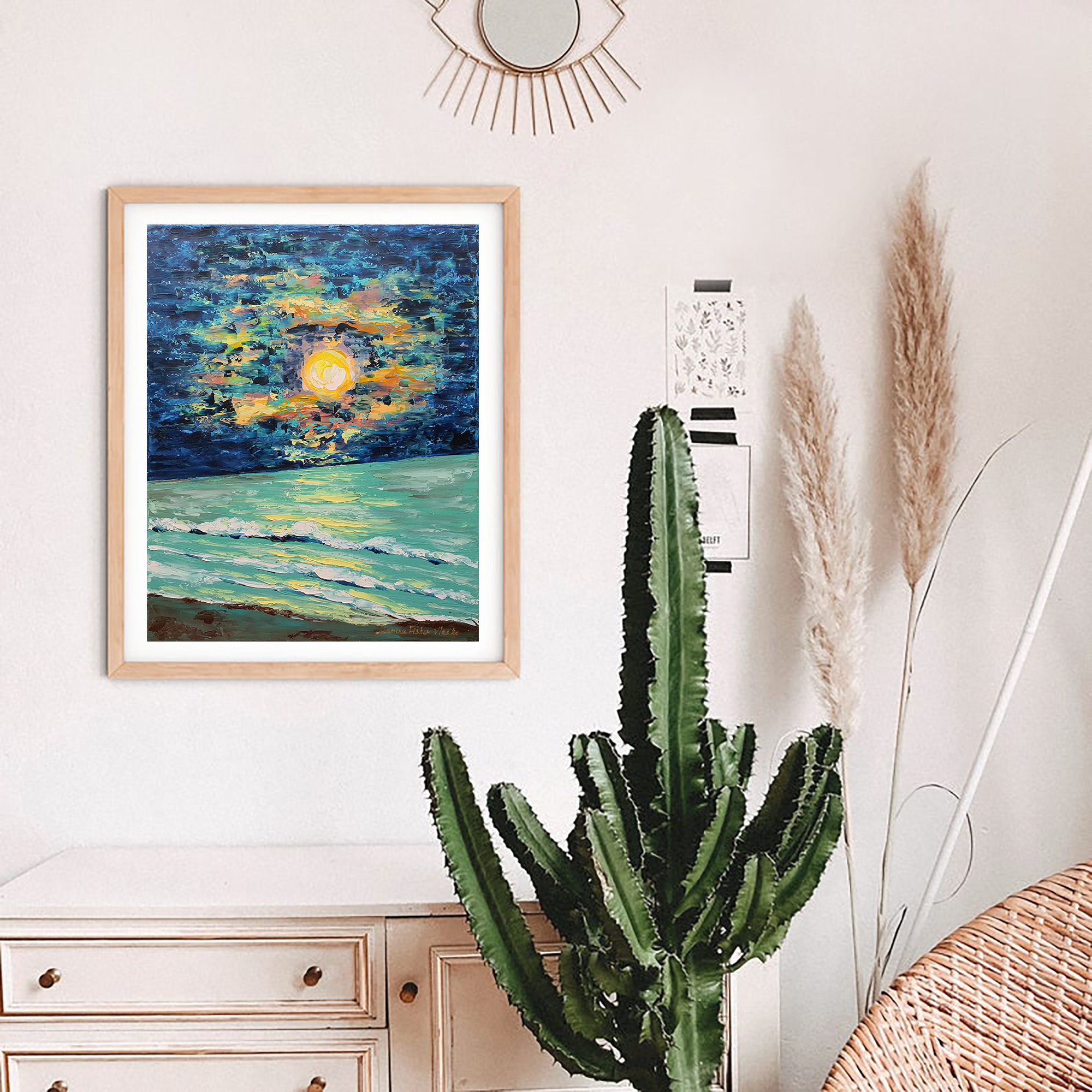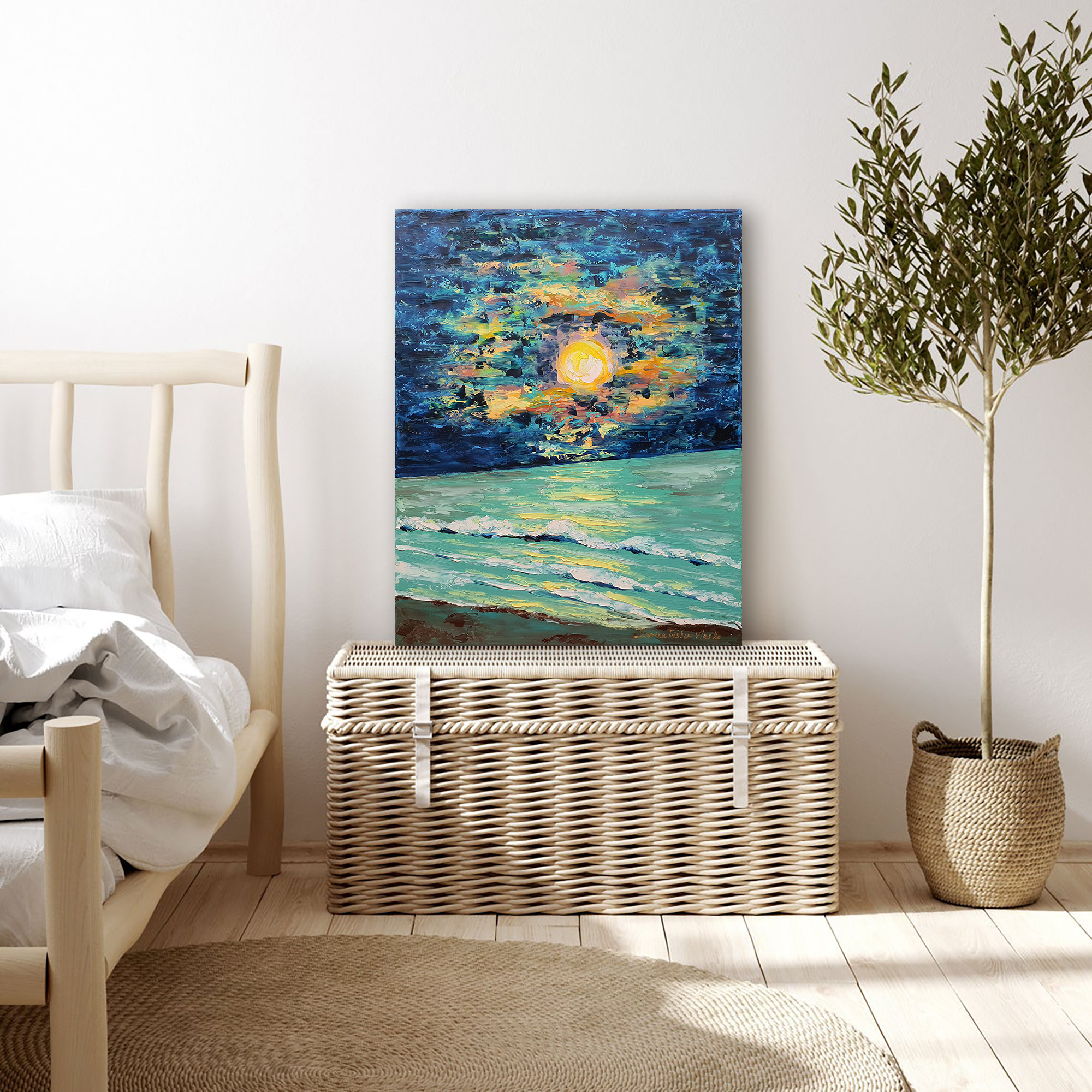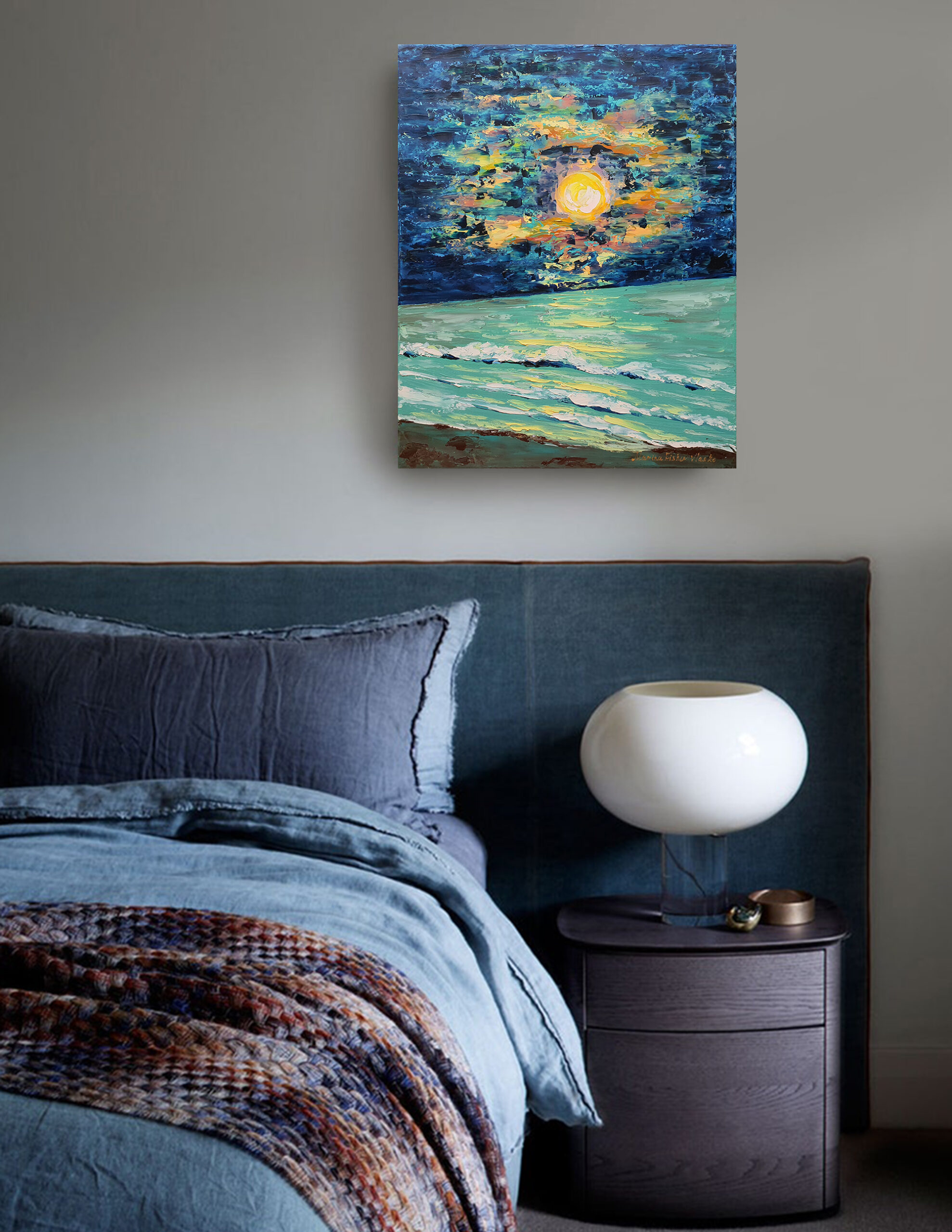 With its deep ocean tones and luminous moonlight, this painting naturally complements interiors designed for calm and reflection. It works beautifully in living rooms, bedrooms, coastal homes, boutique hotels, and elegant office spaces. The composition creates a serene focal point and brings the quiet atmosphere of the night sea into the interior.