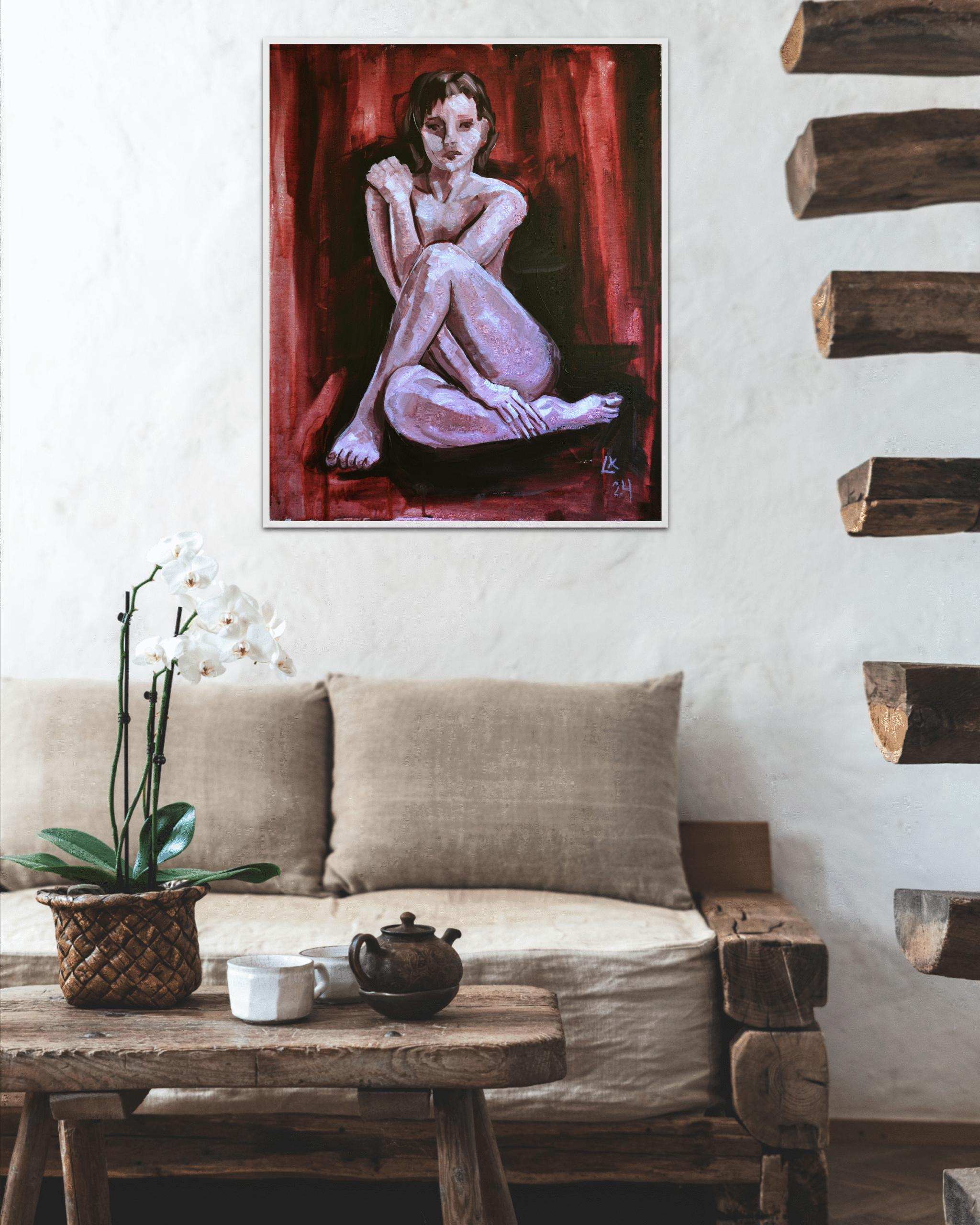 The deep red backdrop enhances the intensity of the scene. Yet, the calmness of the pose creates a perfect balance. This contrast is what gives the painting its lasting emotional effect. As a seated nude painting, it invites reflection and connection through form and feeling—not through detail alone.