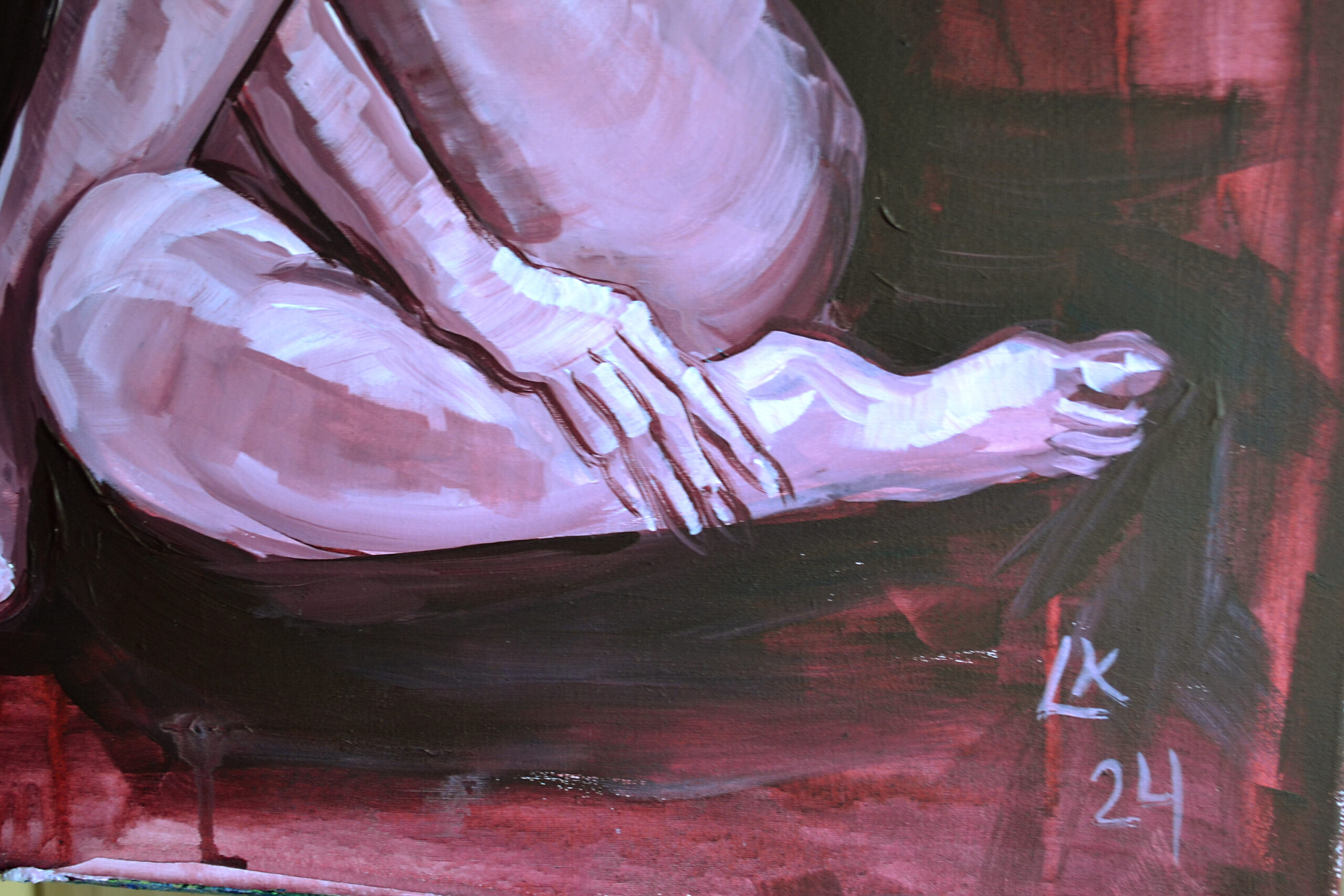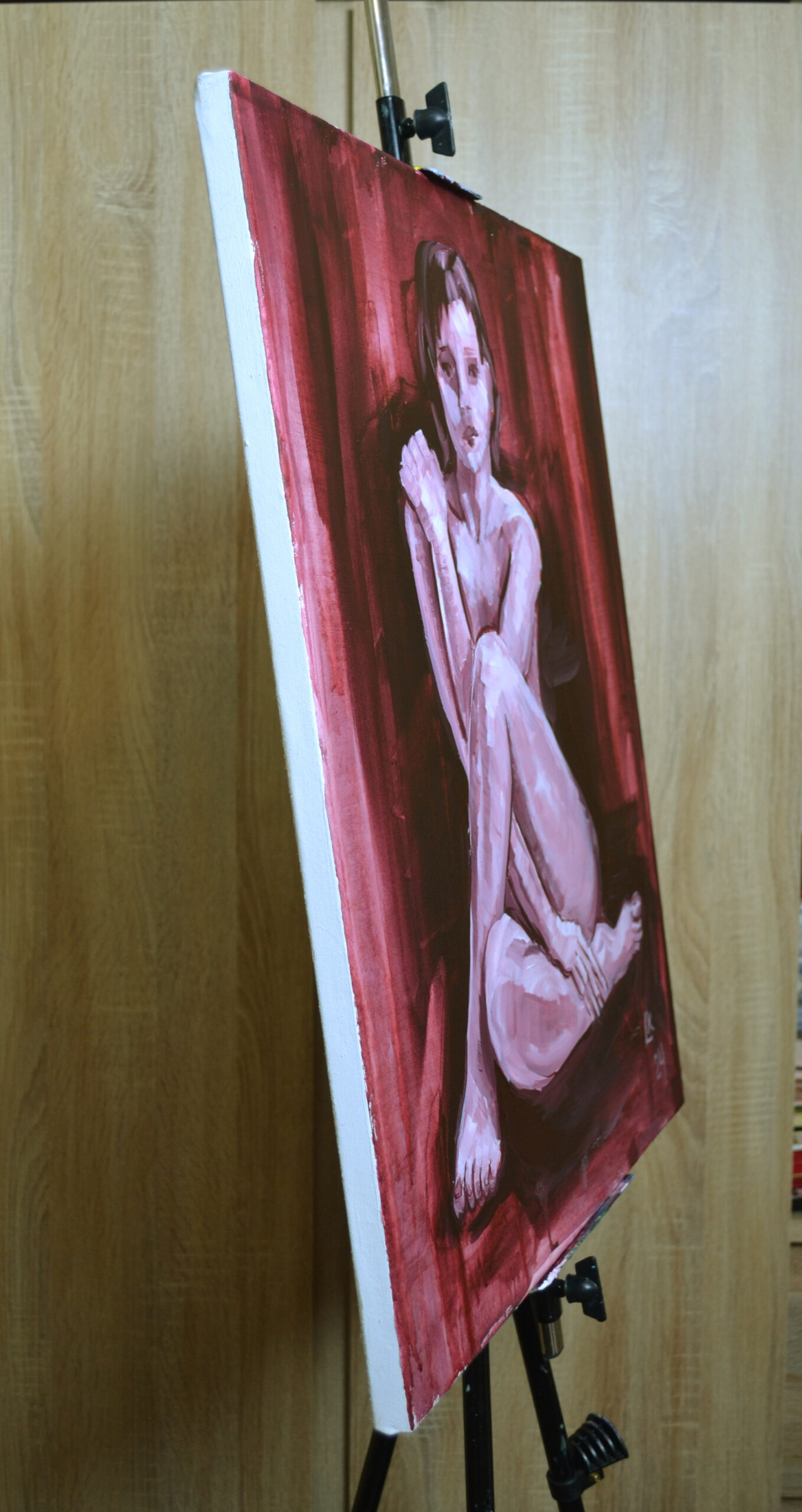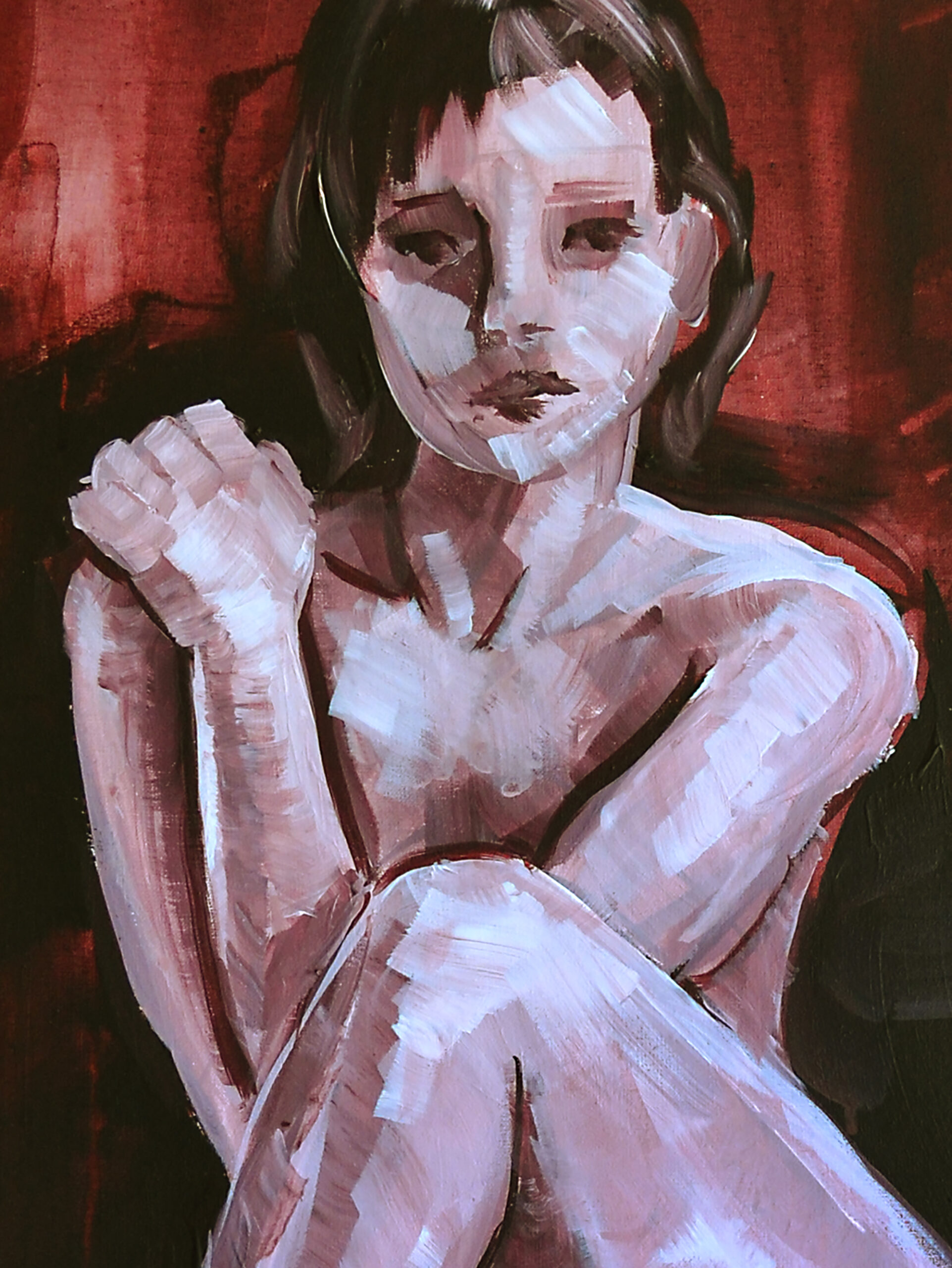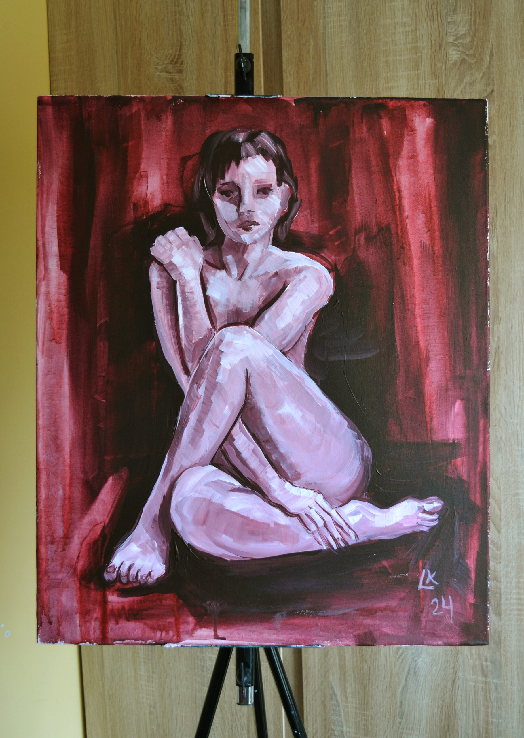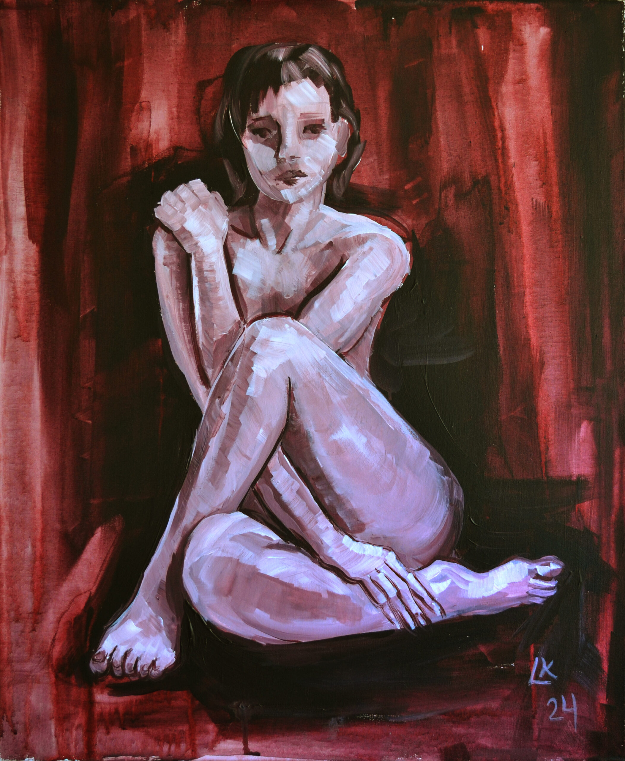 A female figure sits cross-legged with her arms gently wrapped around her torso. Her steady gaze and inward pose create a quiet but powerful moment. Using rich reds and deep burgundy, the artist contrasts the vibrant background with pale, softly modeled skin. Each brushstroke adds texture, weight, and warmth to the figure.