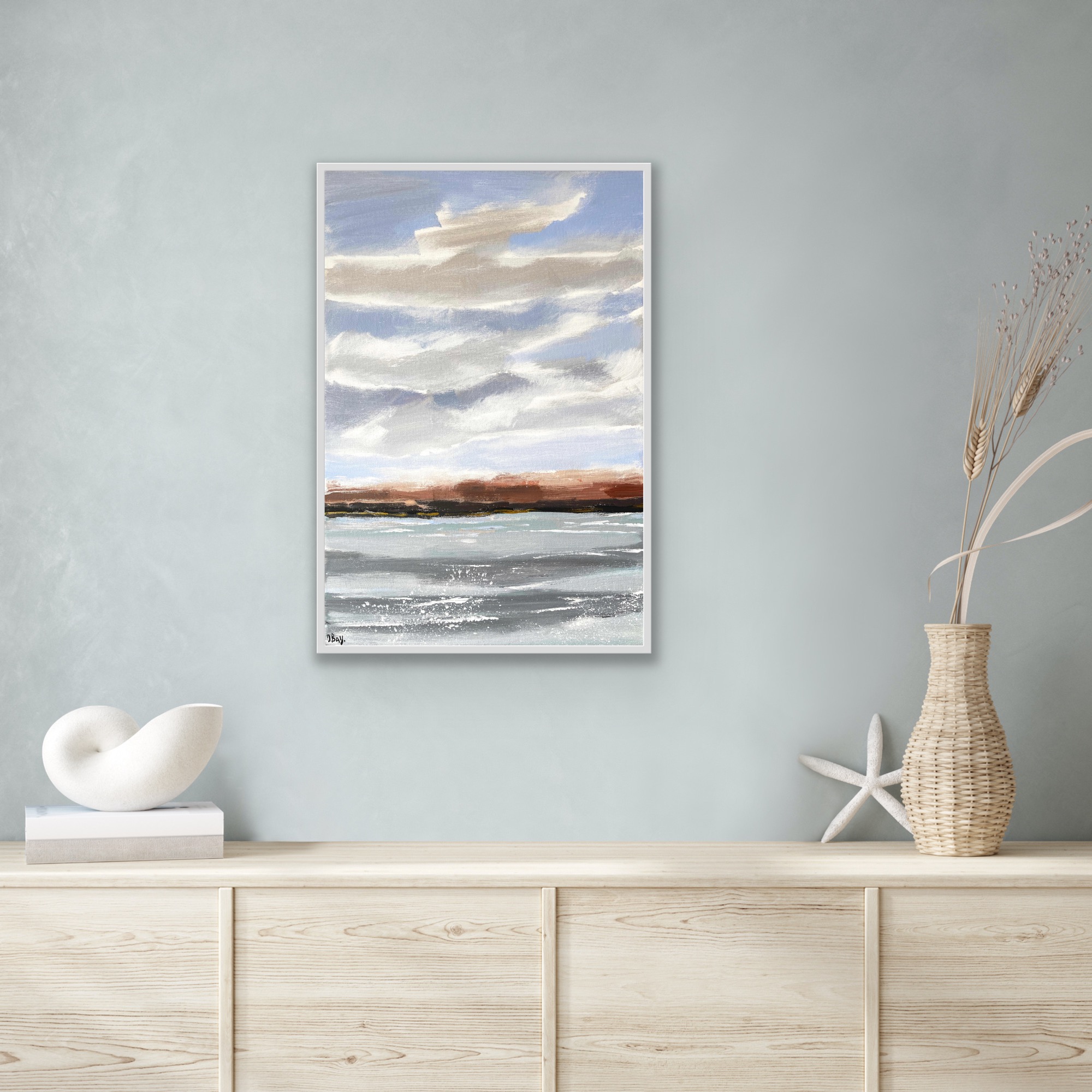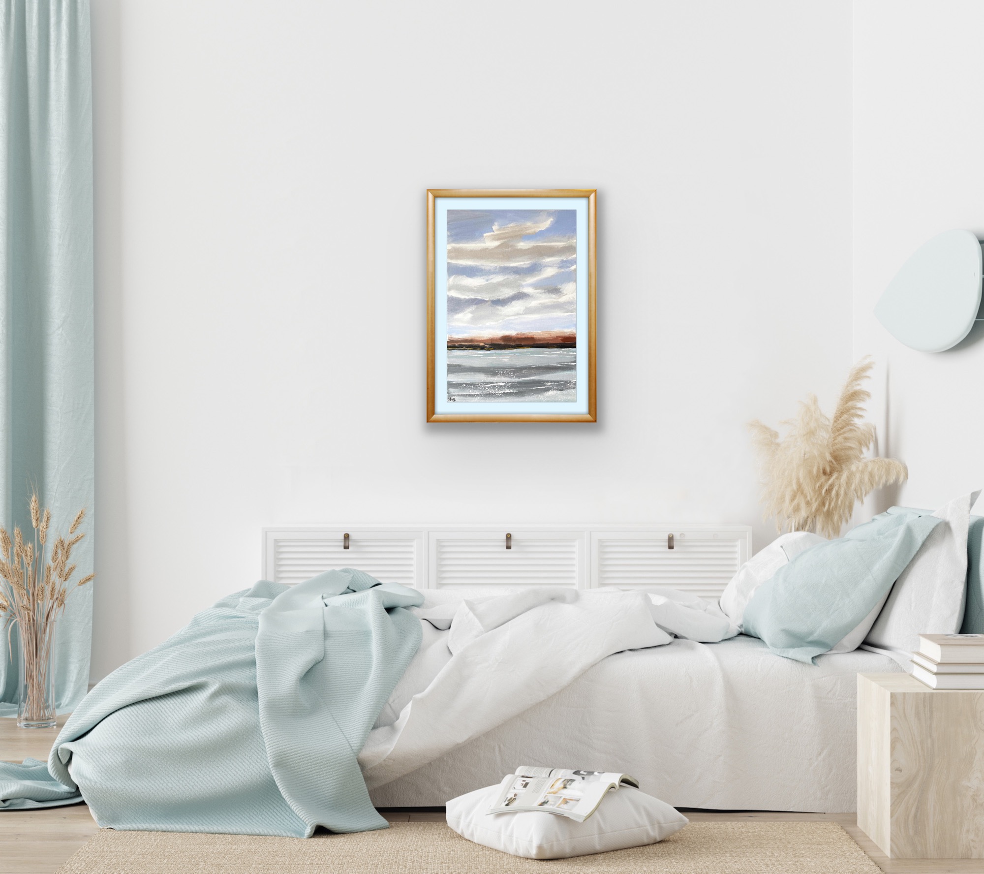 Spring River Landscape with Moving Clouds is an original one-of-a-kind artwork created on canvas with acrylic paints. Signed on the front and back sides. This painting depicts fresh air after rain, soft spring moving clouds, and yellow trees since autumn.
