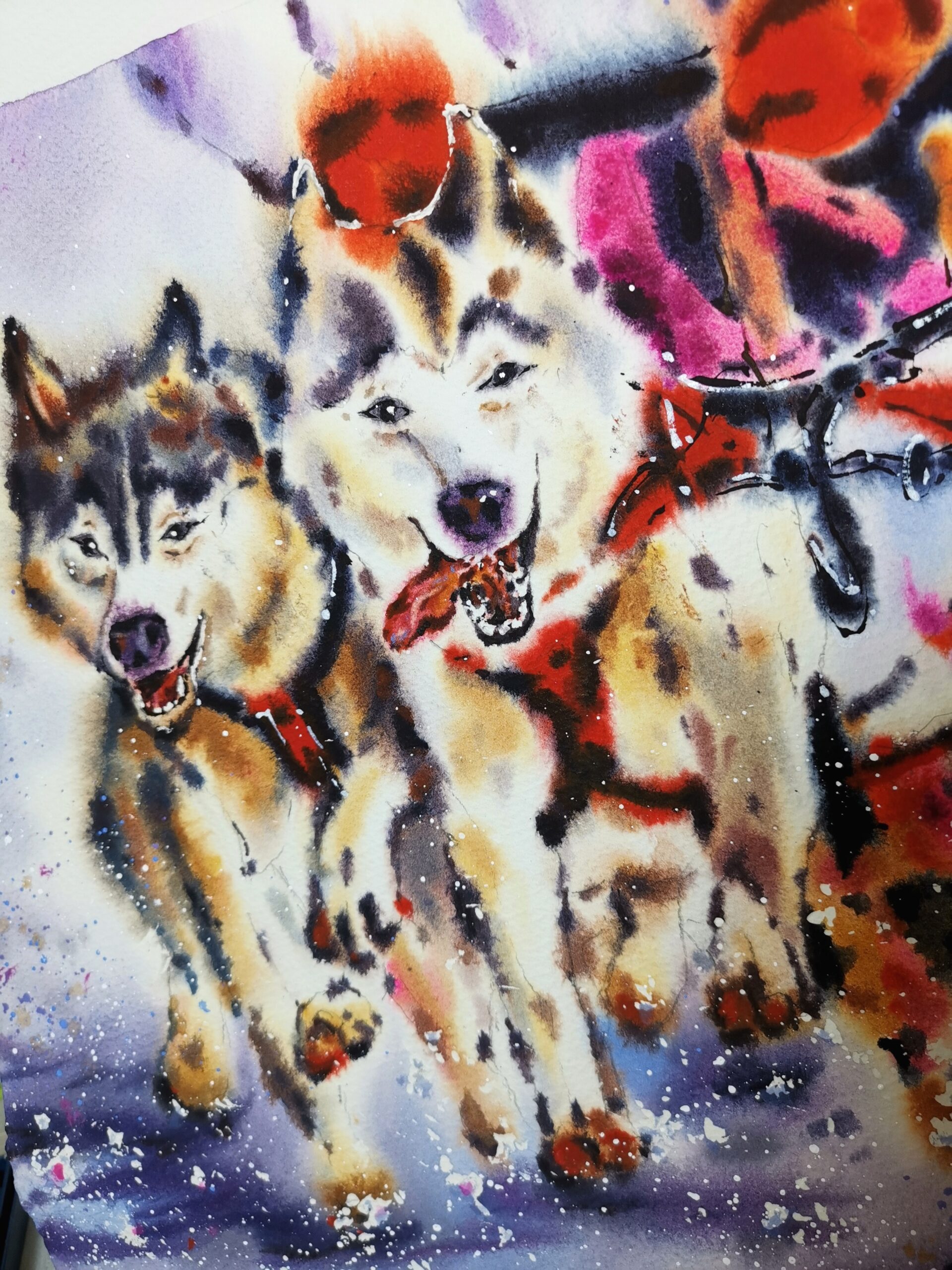🎨Bring the wild energy of the North into your home with this original watercolor painting “Spirit of Alaska Huskies.” The artwork captures a powerful sled team of husky dogs in motion, racing through the snowy landscape with strength, freedom, and unity.