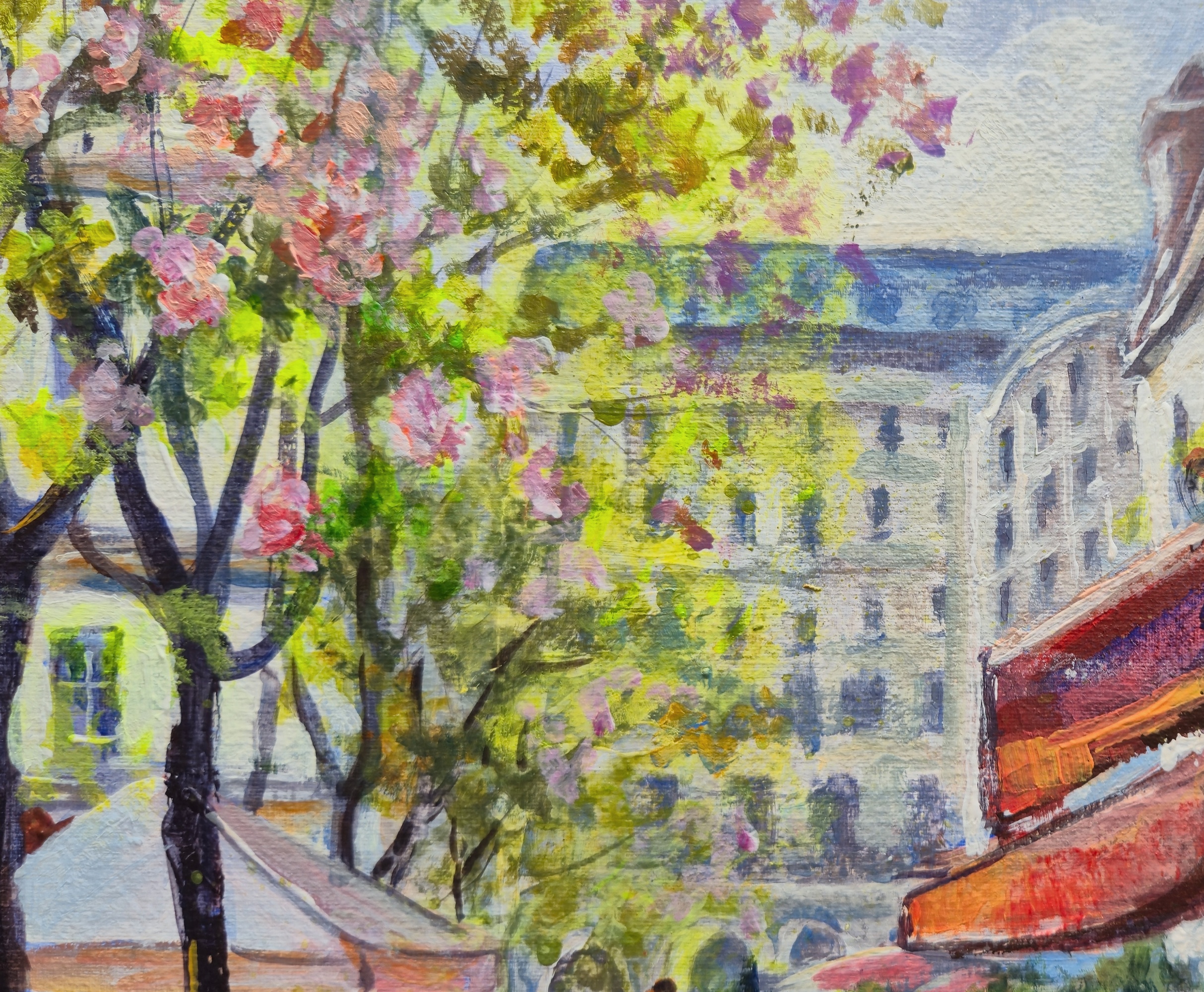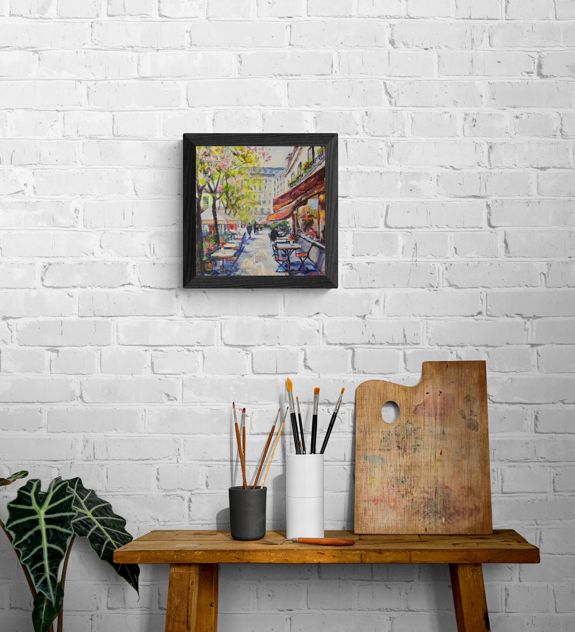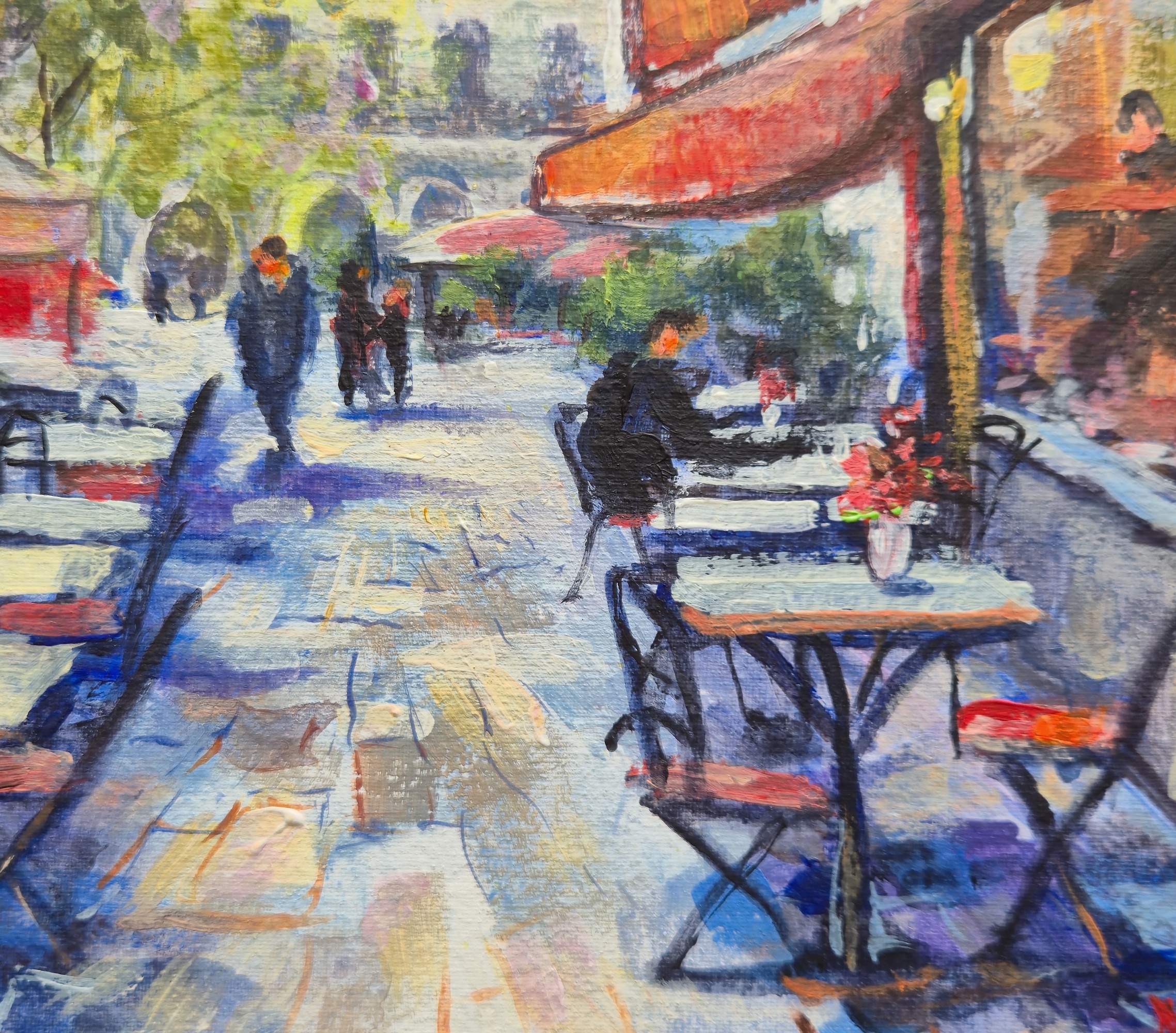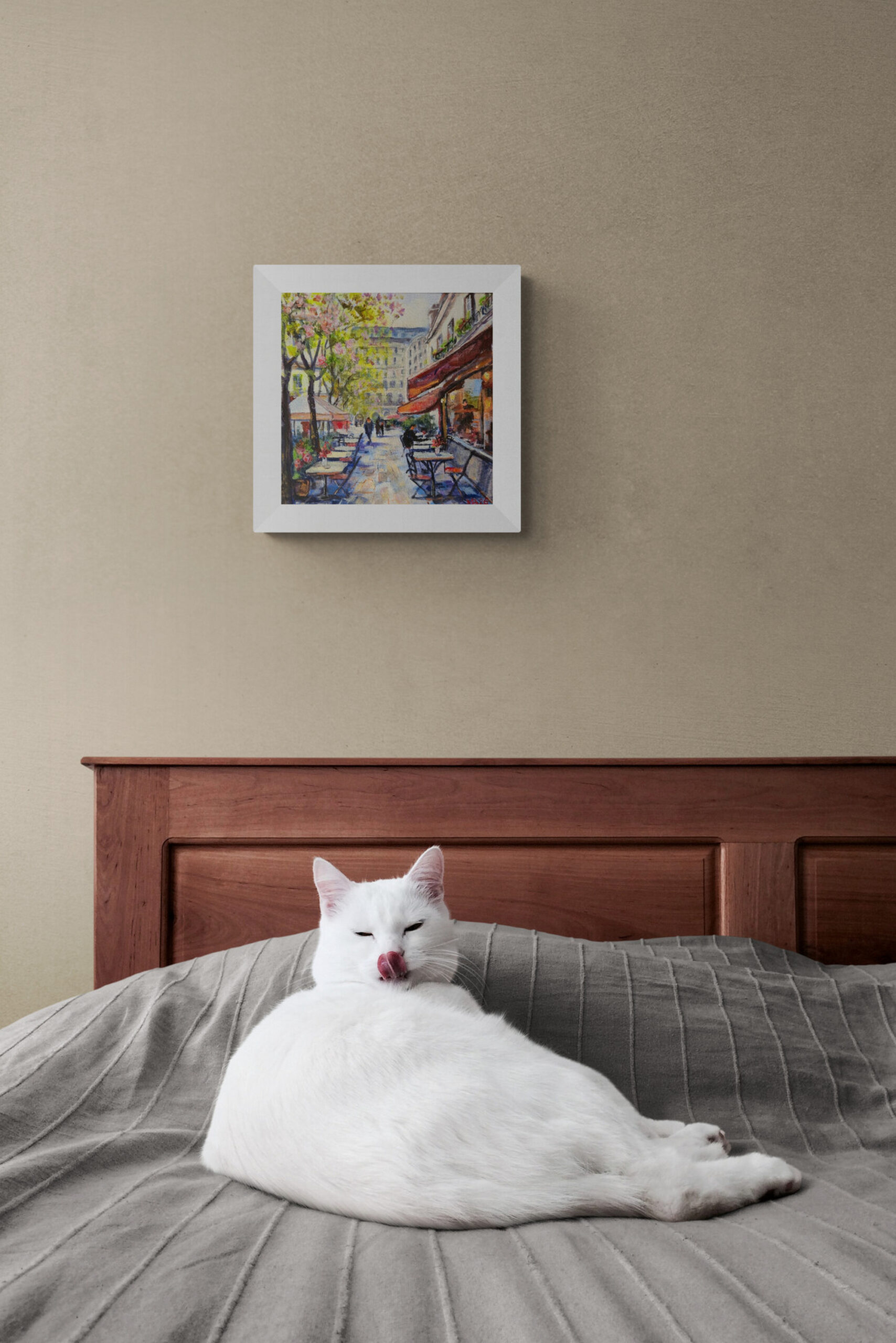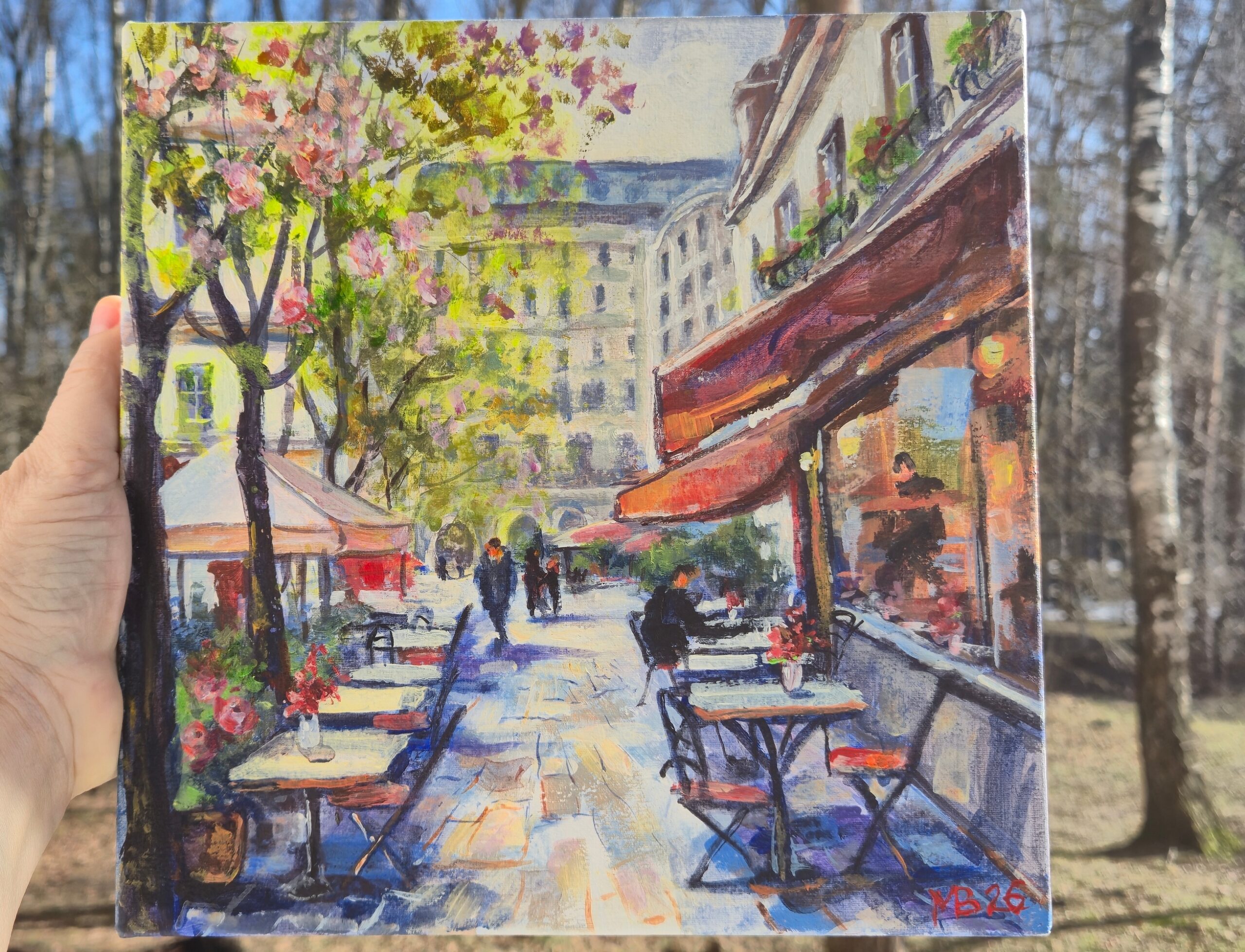 This original acrylic painting captures a sunlit Parisian café street in spring, where blooming magnolia trees frame intimate tables and soft urban movement unfolds in the distance. Warm awnings and delicate pink blossoms contrast with cool architectural tones, creating a balanced interplay of light, color, and atmosphere.