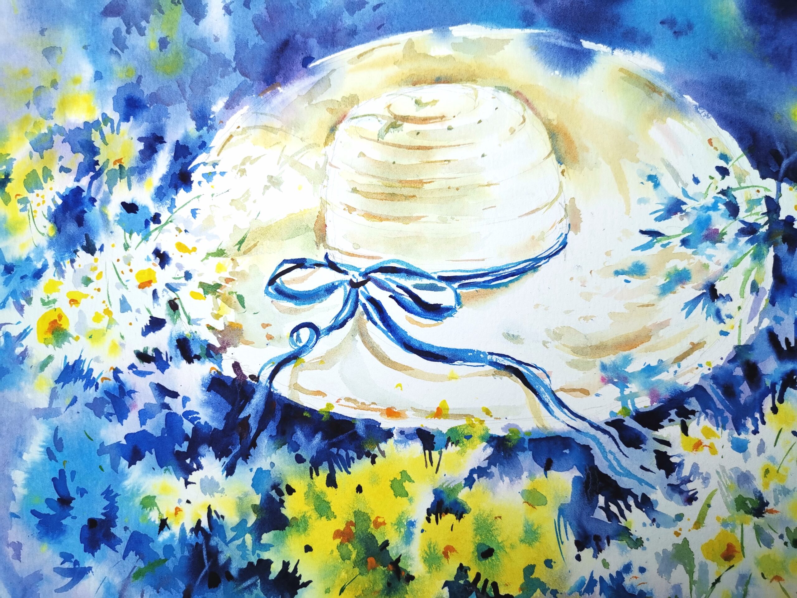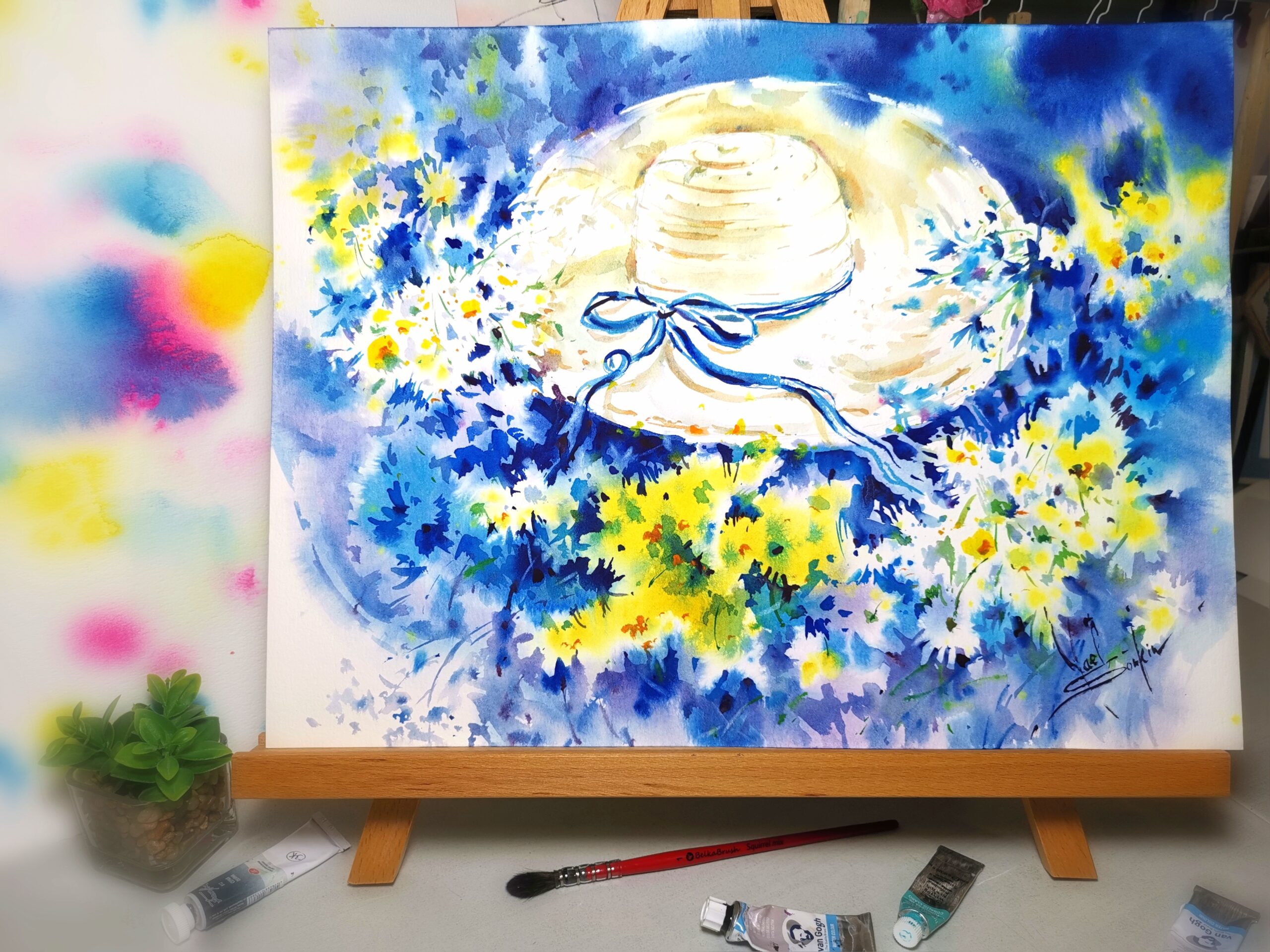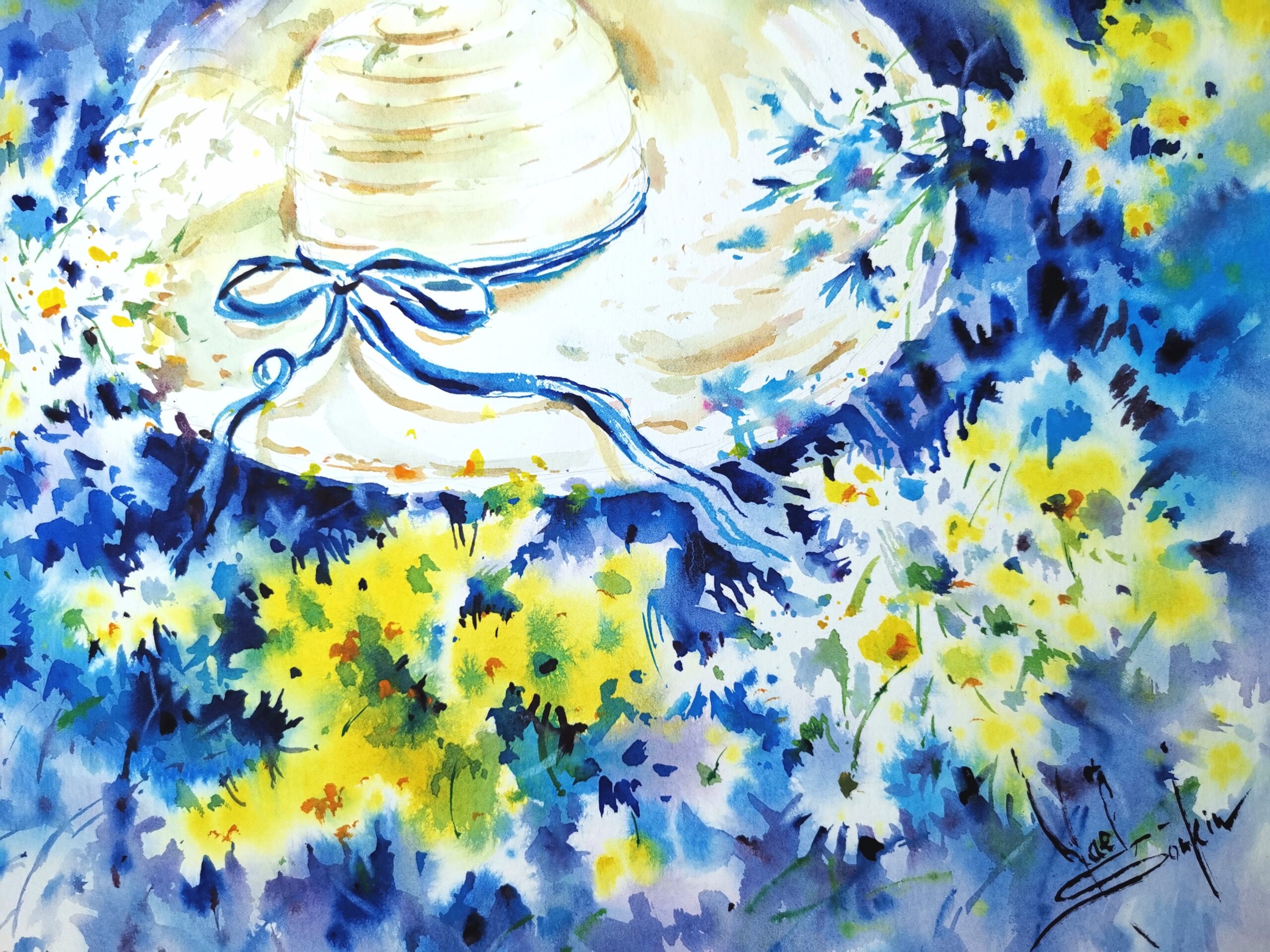 🎨“Straw Hat and Daisies” – original watercolor painting by Yael Natali, filled with the warmth and joy of a summer morning.