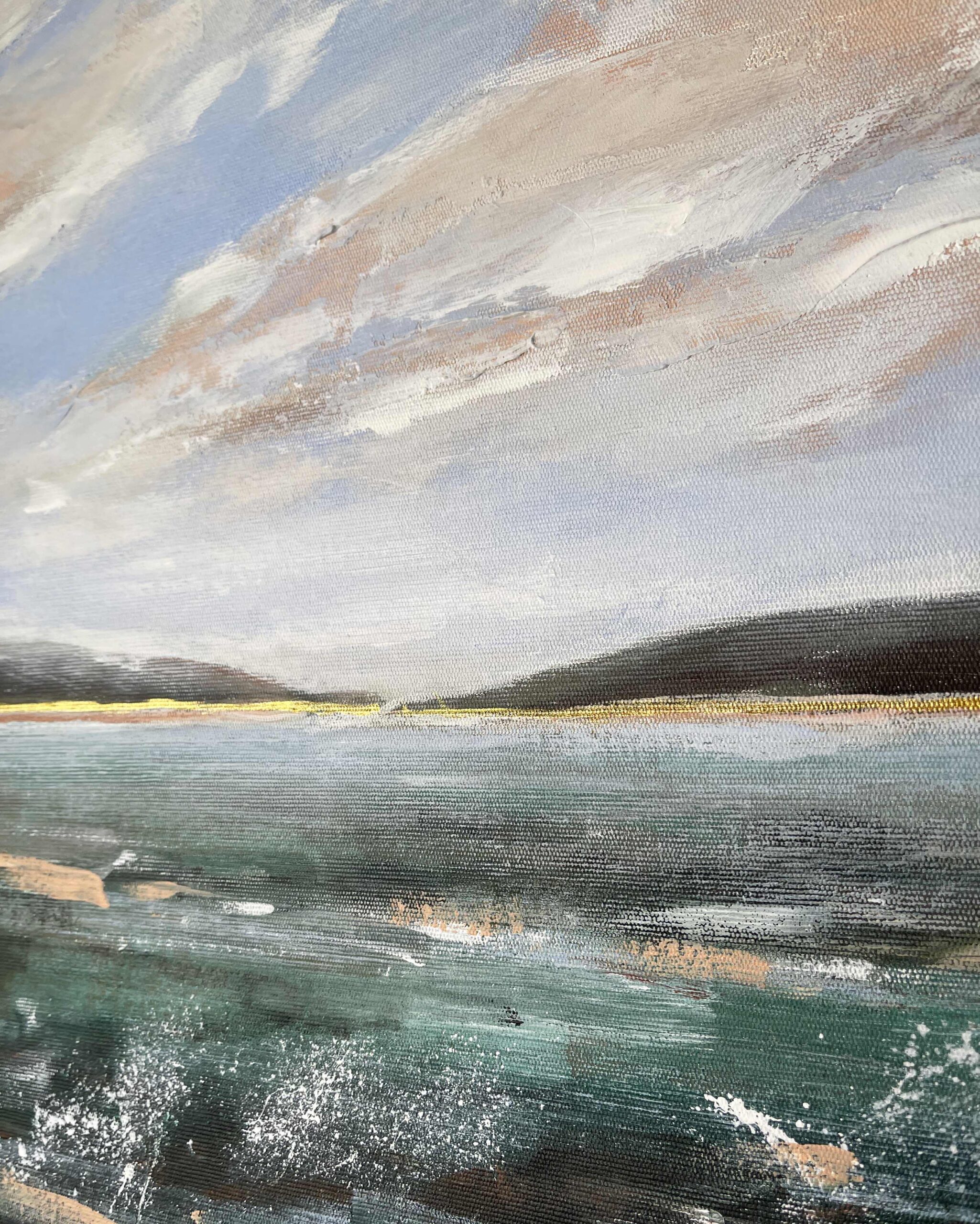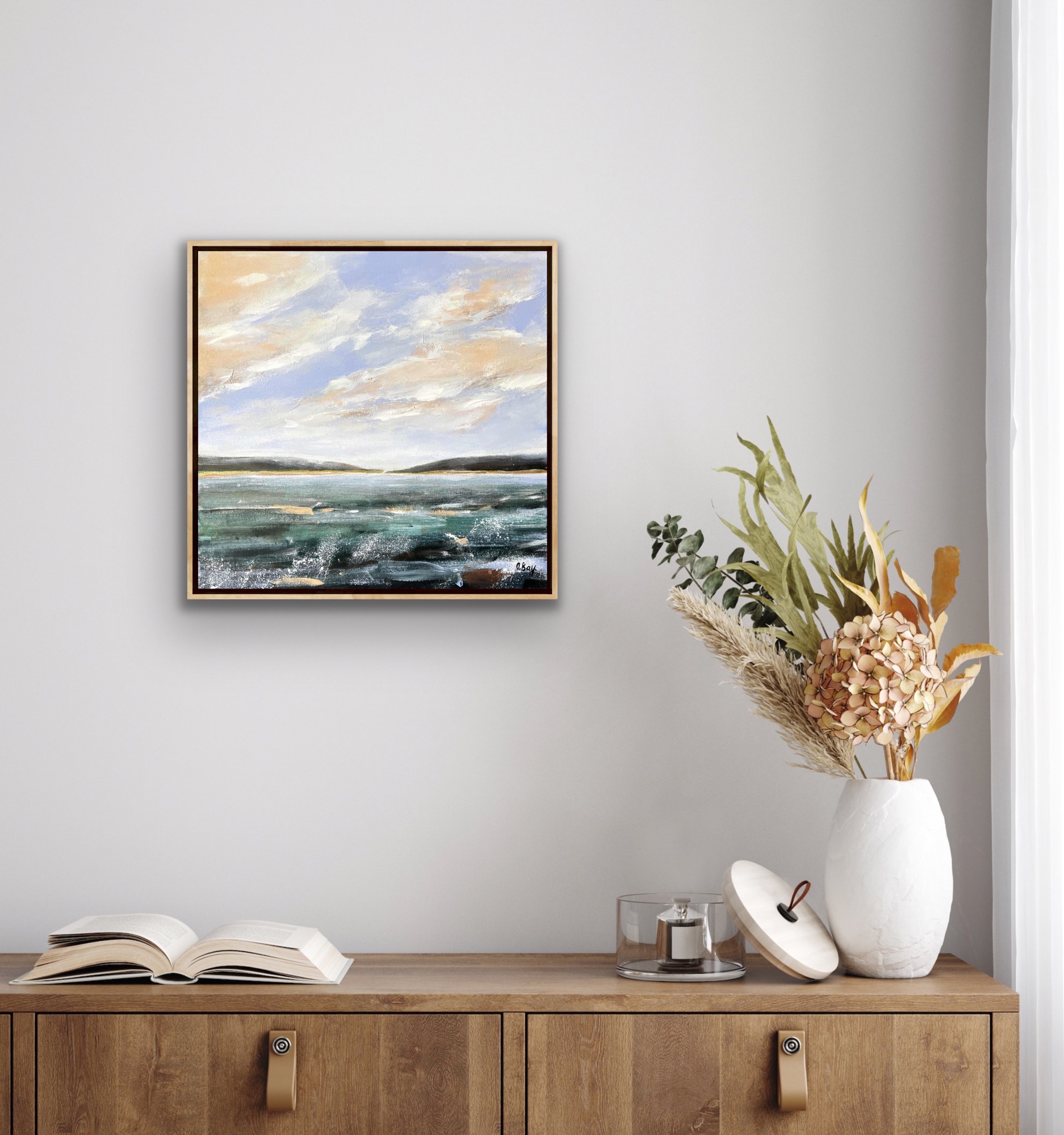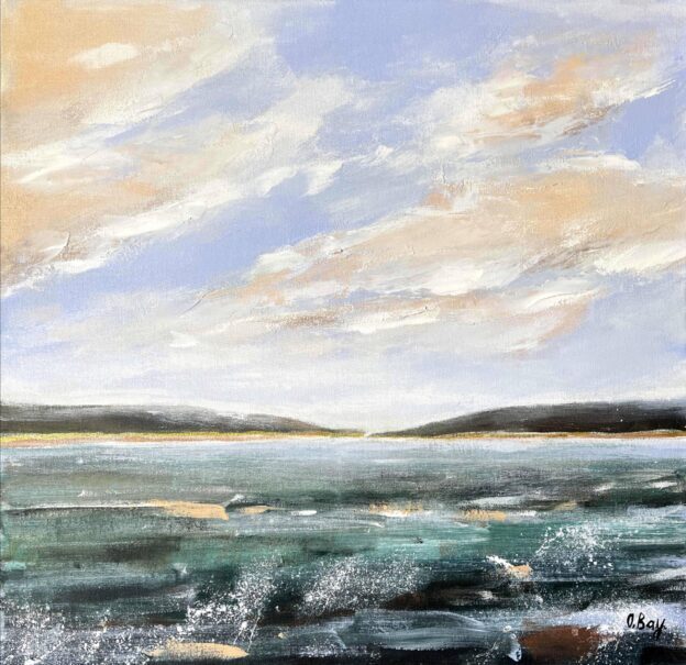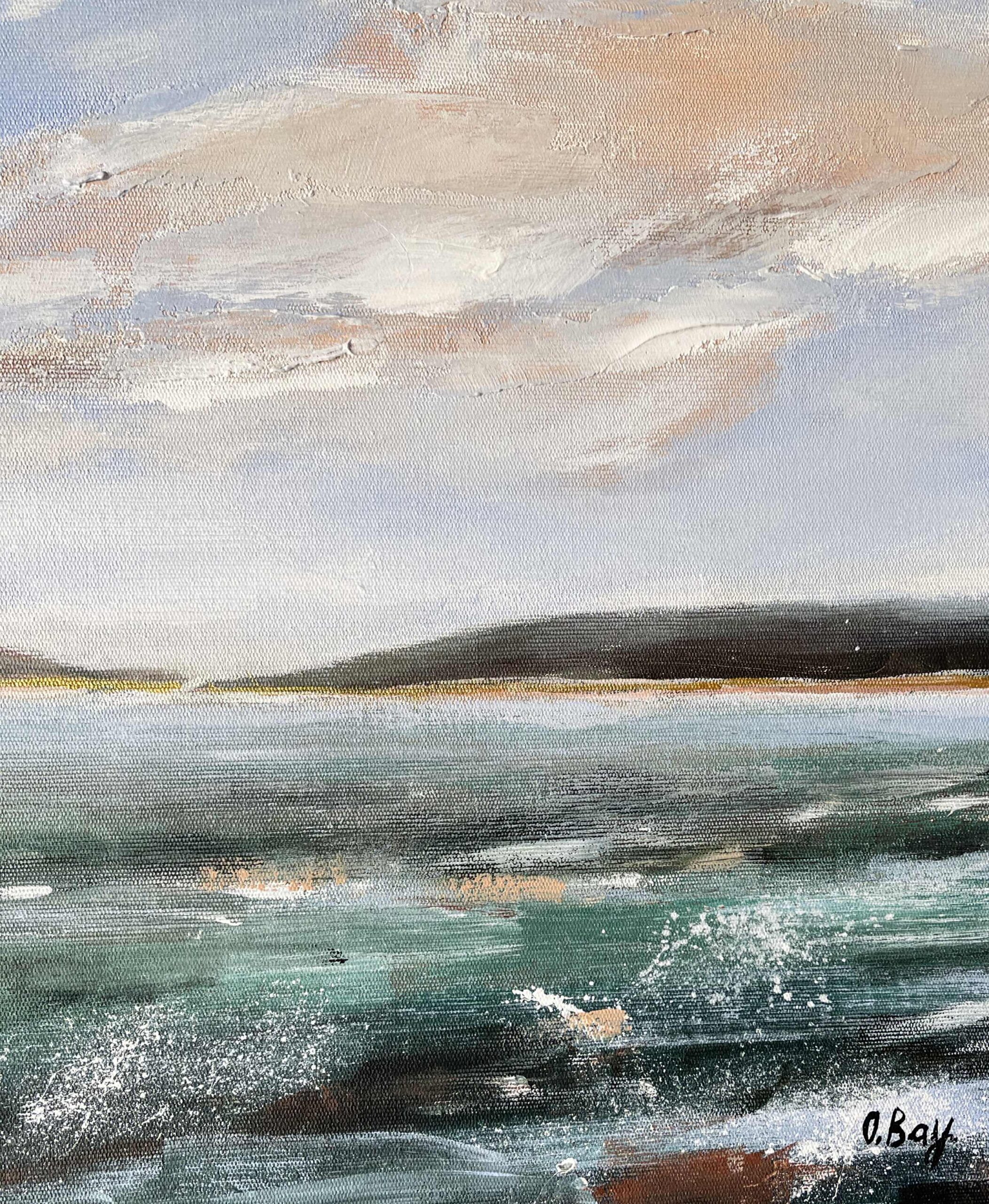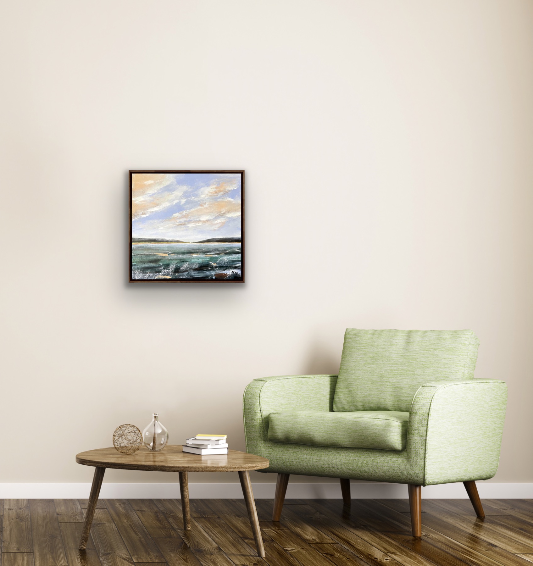 Summer Clouds and River is an original one-of-a-kind artwork created on canvas with acrylic paints. Signed on the front and back sides. This artwork shows the beauty of one day where clouds move and river flows with splashes. It conveys the joyful uplifting atmosphere of a summer day in a contemporary way.
