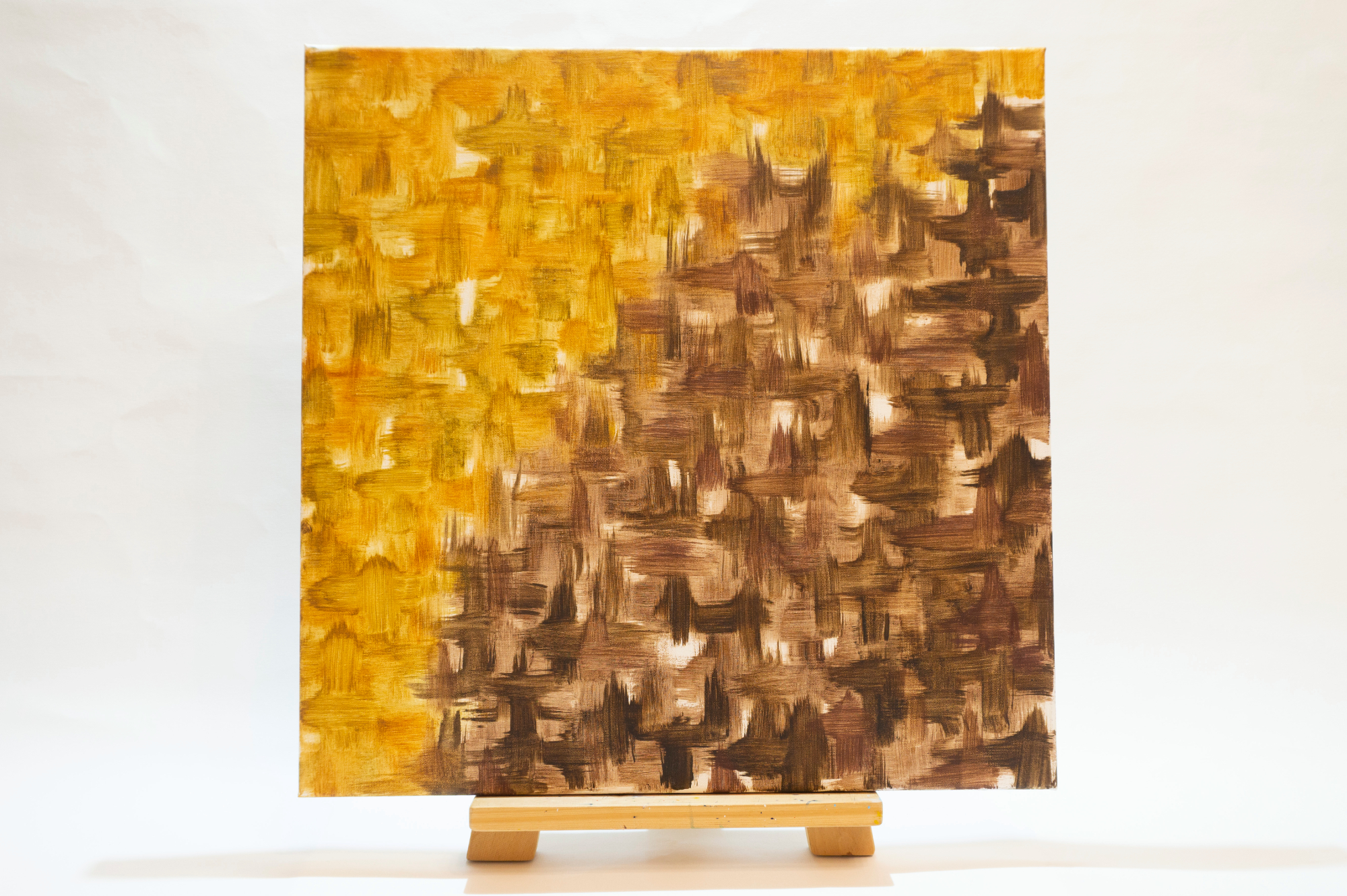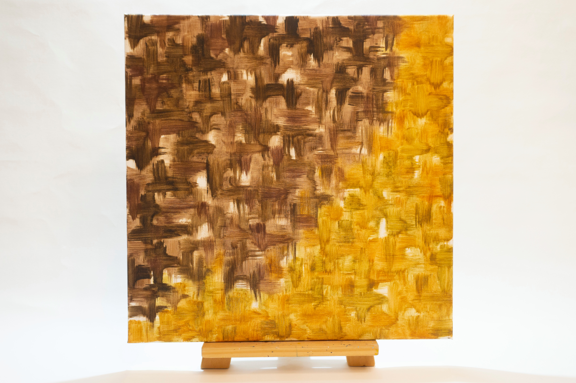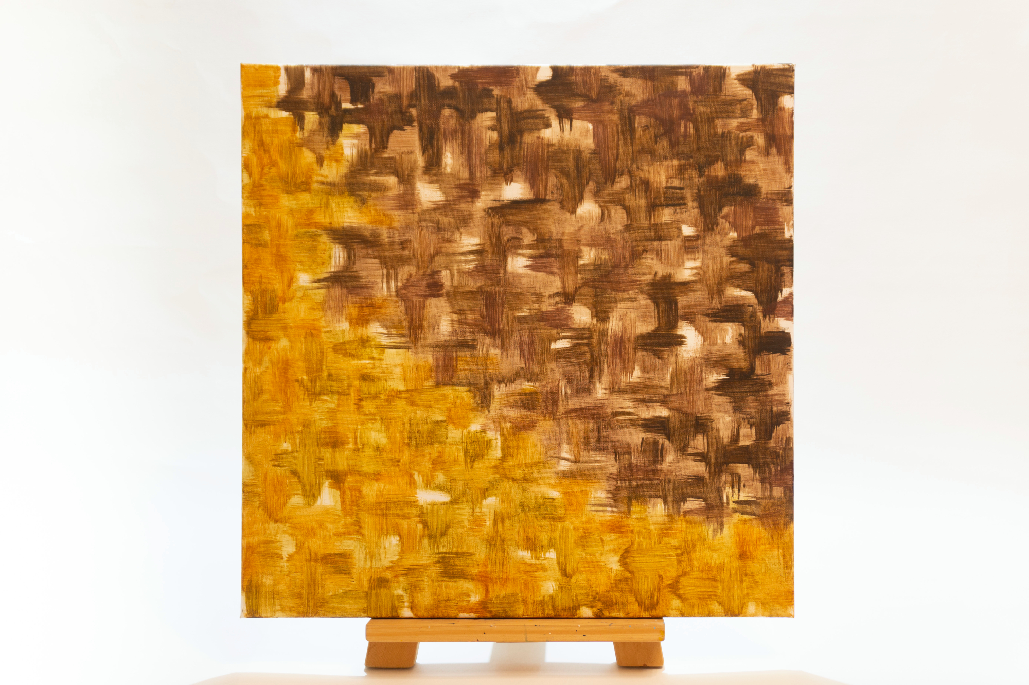 The composition is built on the contrast between glowing golden-yellow tones and deep brown textures, evoking the feeling of endless fields under warm sunlight. The layered brushwork and subtle transitions create an impression of movement and depth, suggesting rows of blooming sunflowers dissolving into abstraction. The result is a poetic balance between landscape and color field painting, where emotion and light take precedence over form.