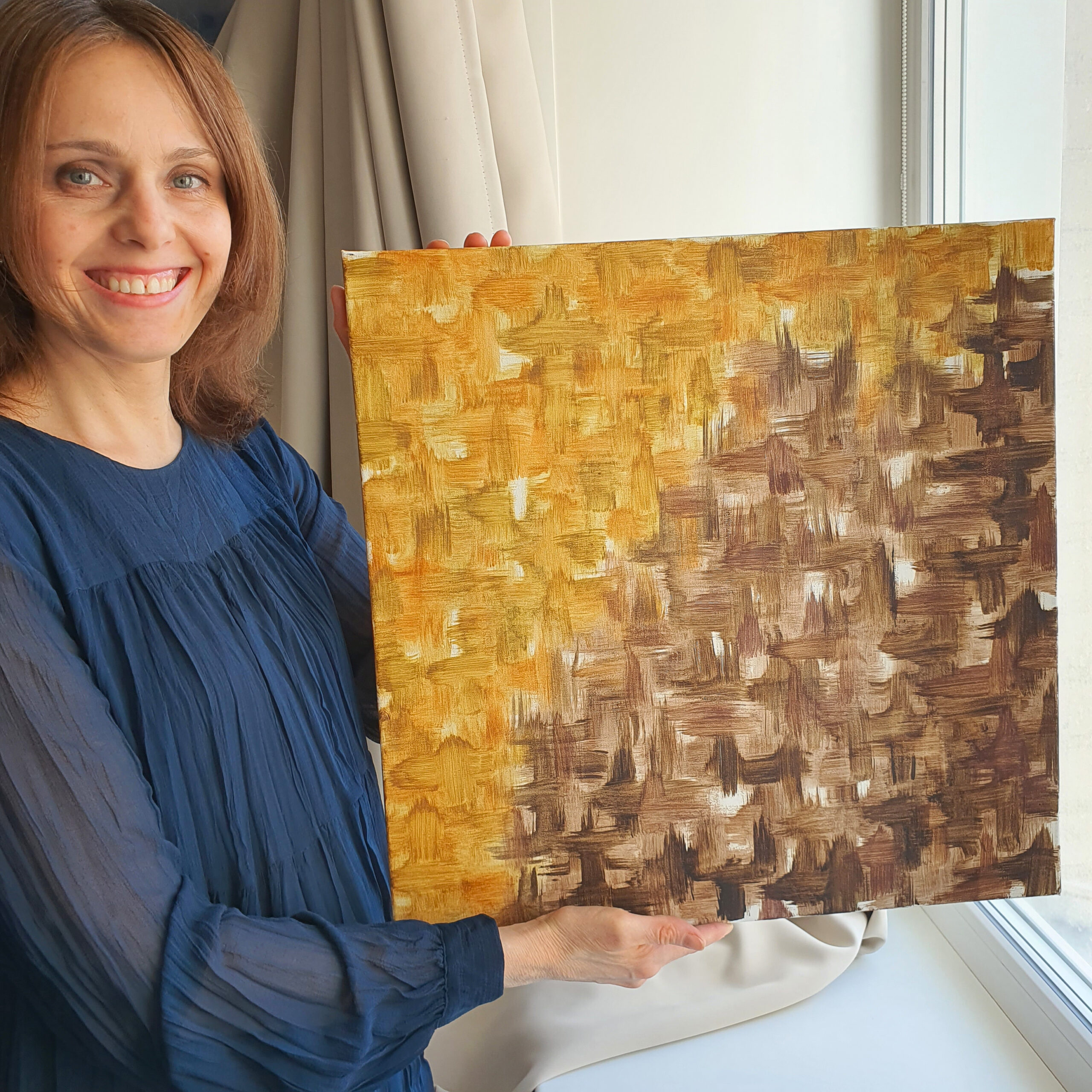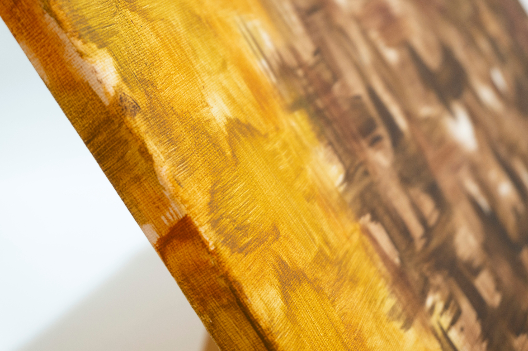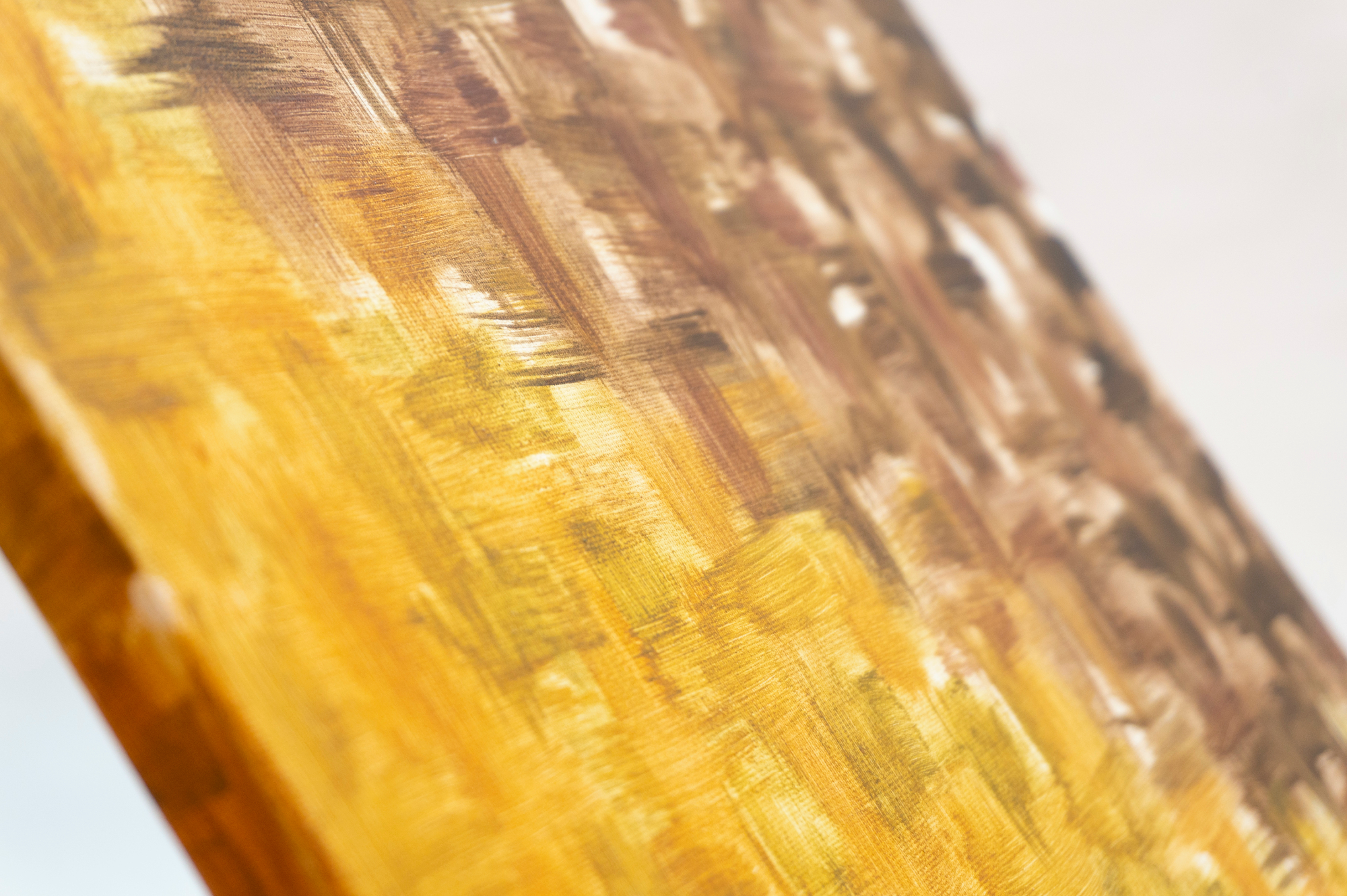 The warm color palette — dominated by golden yellow, ochre, and brown — makes this piece especially suitable for modern interiors, minimalist spaces, and cozy дизайнерские environments, where it can act as a focal point or a harmonious accent. It appeals to collectors of abstract art, landscape painting, and modern decorative art, offering both visual impact and emotional resonance.