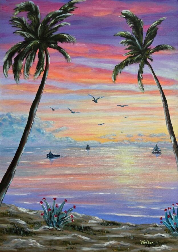 The painting depicts a sunset by the sea. The sun, sinking below the horizon, colors the sky in warm shades of orange and pink, like fire spreading across the clouds. Small waves playing on the surface of the water reflect this light, creating a sparkle and shimmer. Palm trees standing on the shore create silhouettes, dark and graceful against the glowing sky, their leaves swaying slightly in the light breeze.