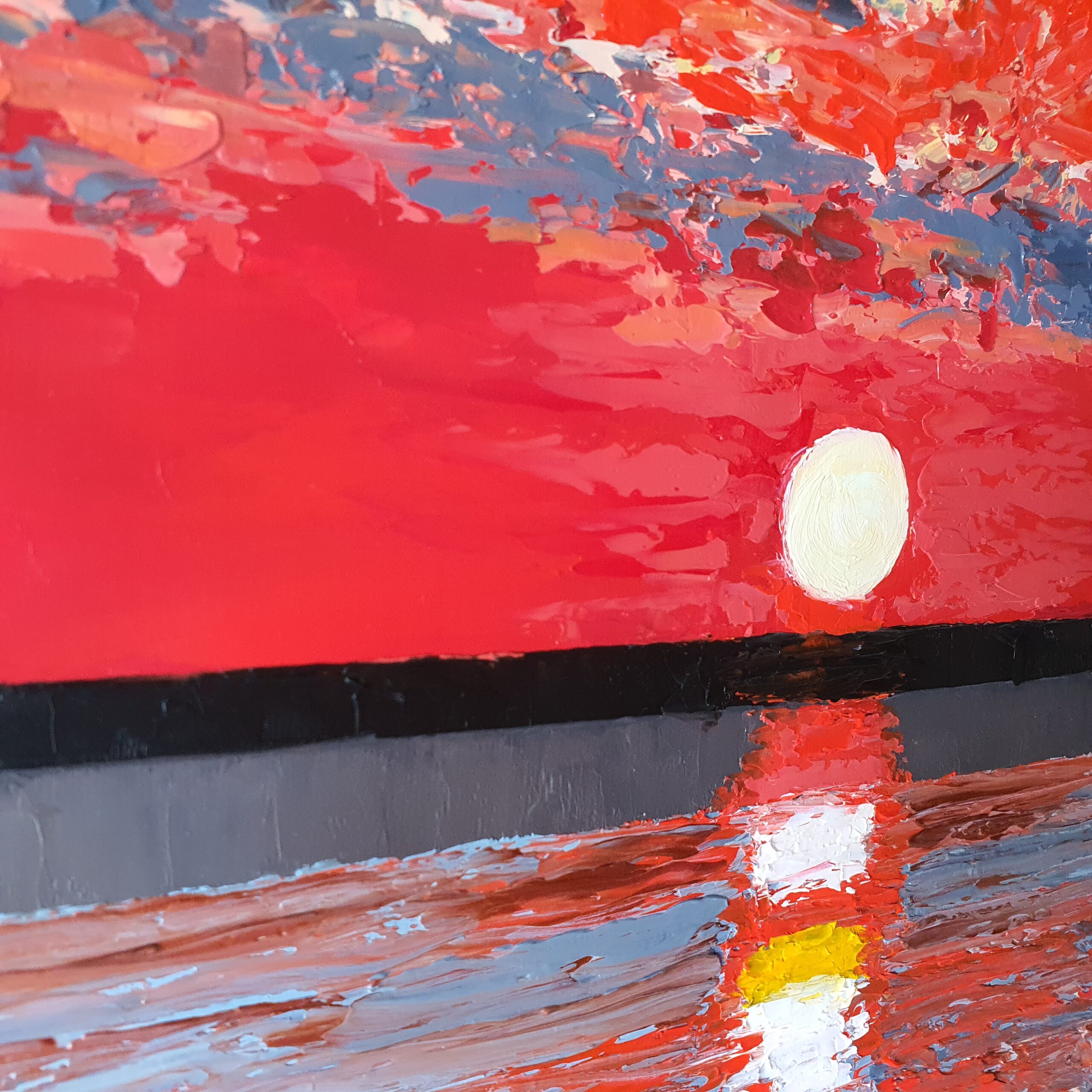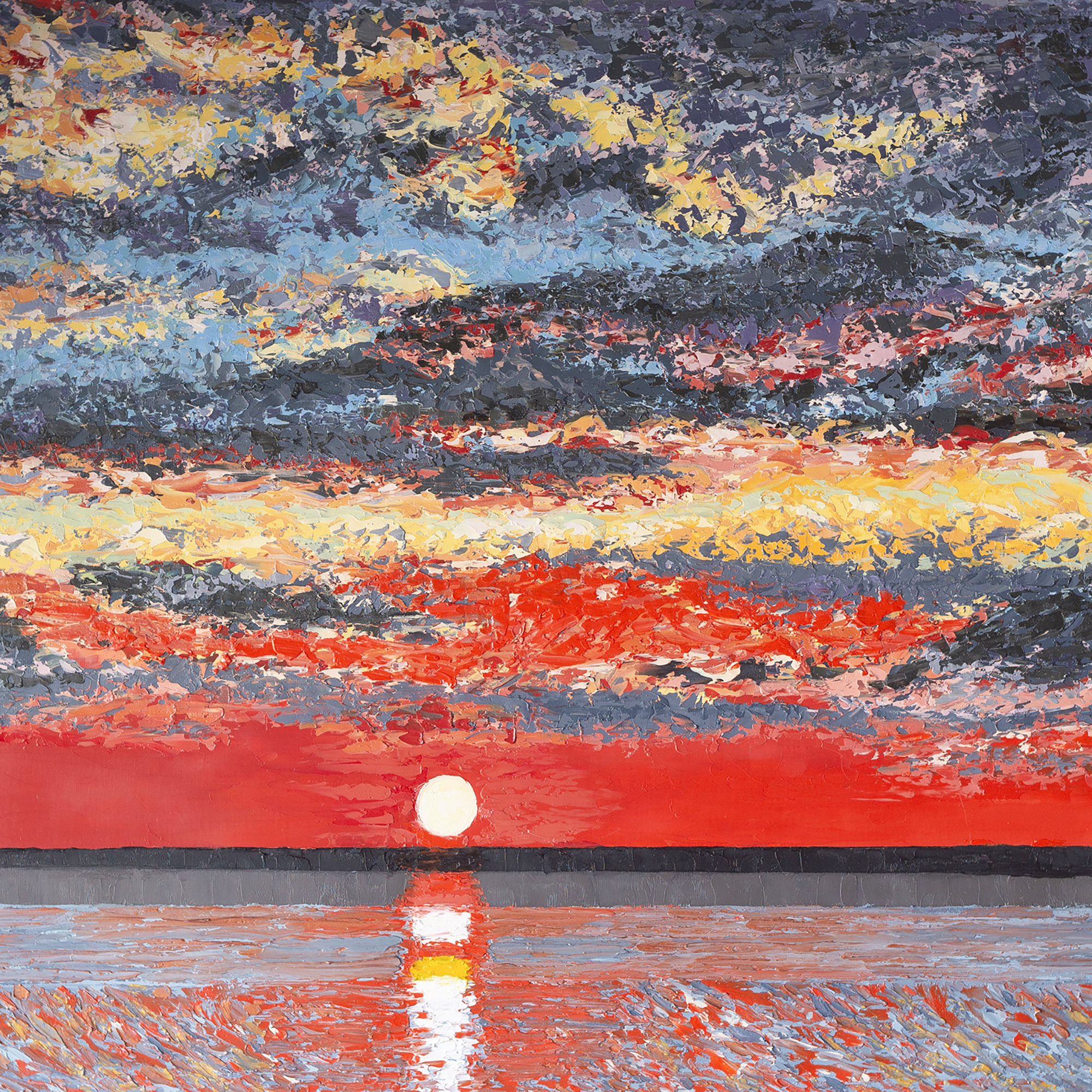 The painting is painted in thick **impasto** oil, bold brushstrokes create a rich, tactile surface that catches the light like the last rays of sunset. Warm orange and pink shades smoothly transition to deep blues and purples; the reflective water draws the eye to the shining horizon and that peaceful silence of the end of the day.