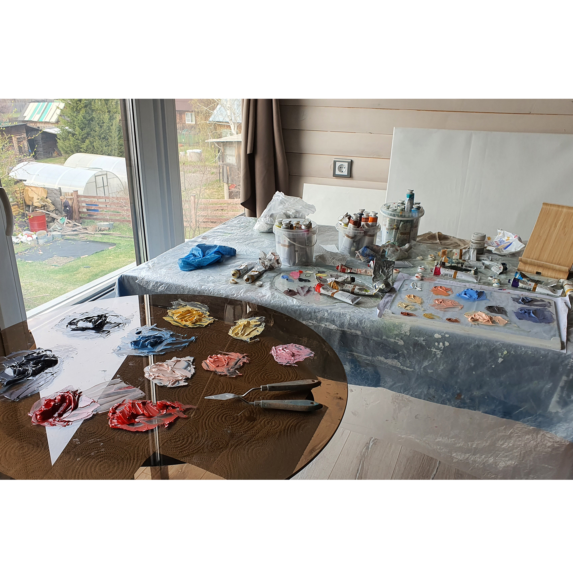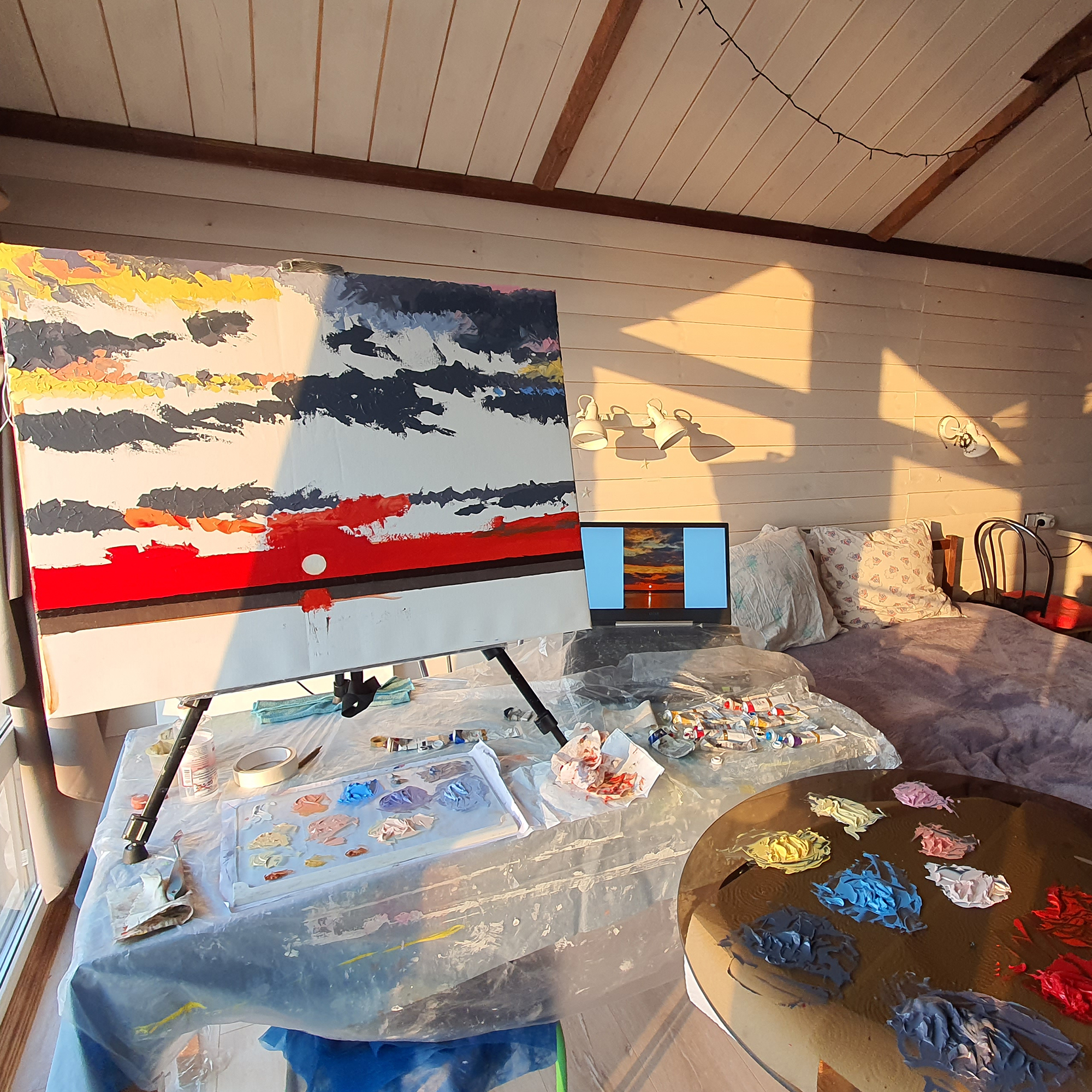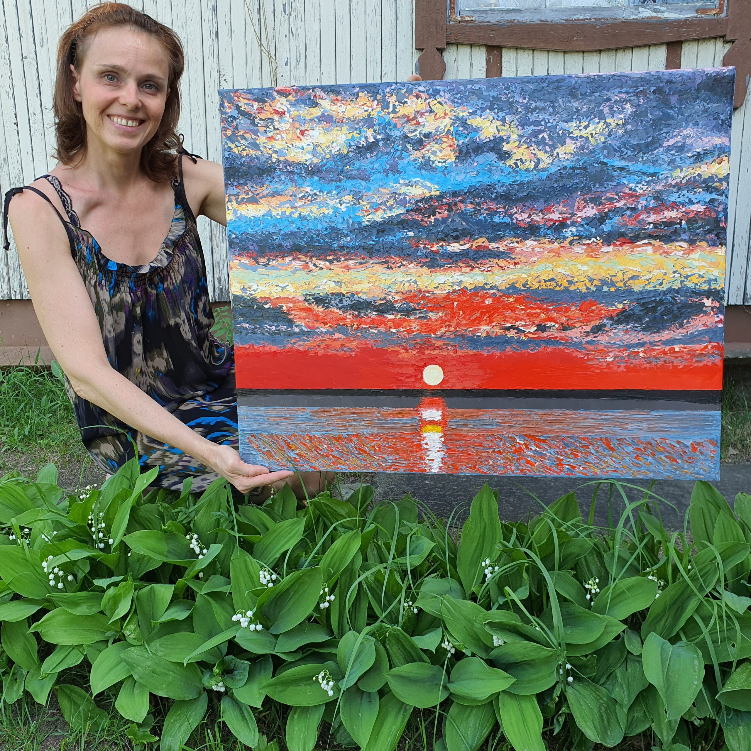 On weekends and holidays, I leave the city for my country house. On one side is a mixed pine-deciduous forest, on the other is the sea. My cottage is on the highest hill in the village, where every evening the sun sets over the river and the sky lights up. This painting is inspired by one of those warm, quiet evenings – it was captured from life.