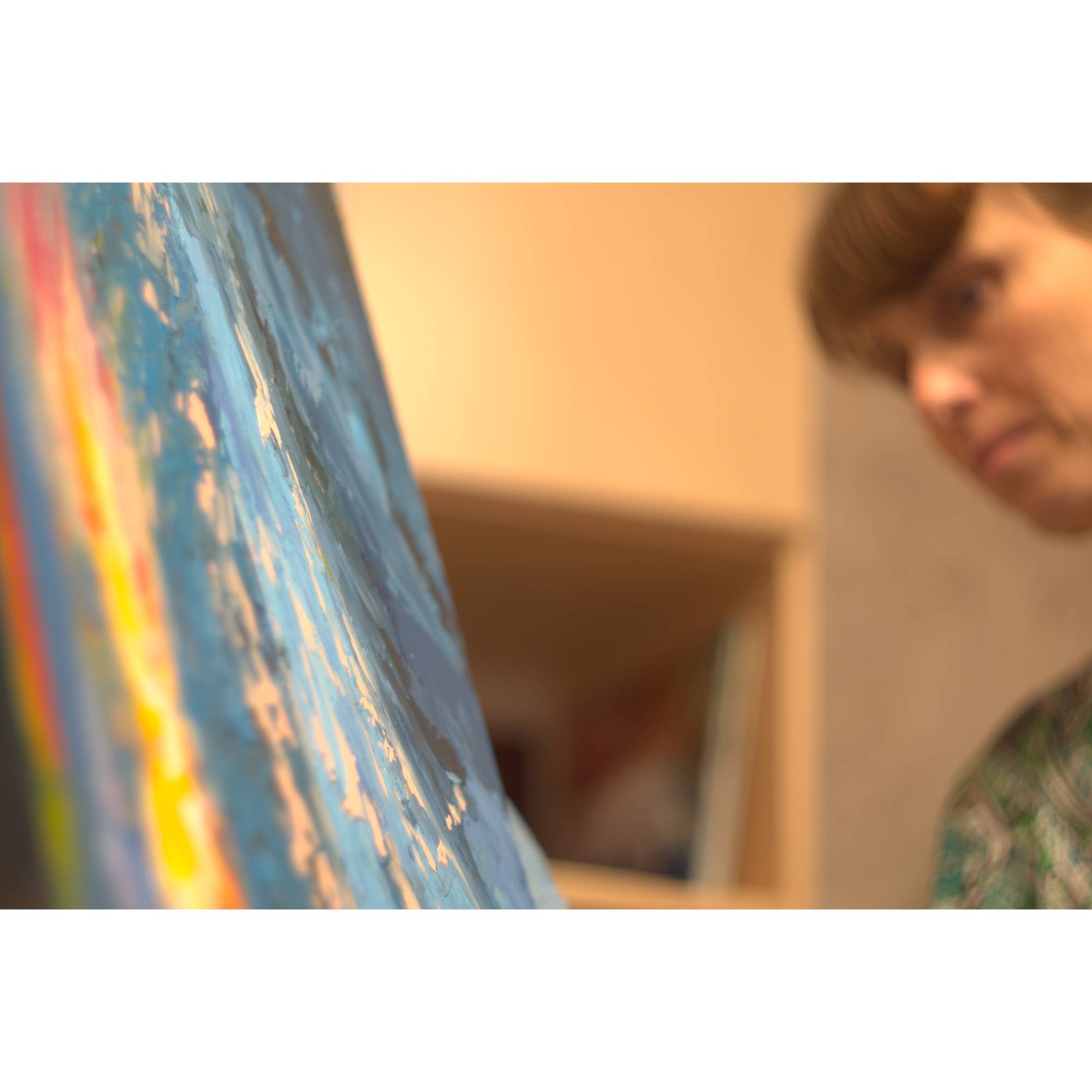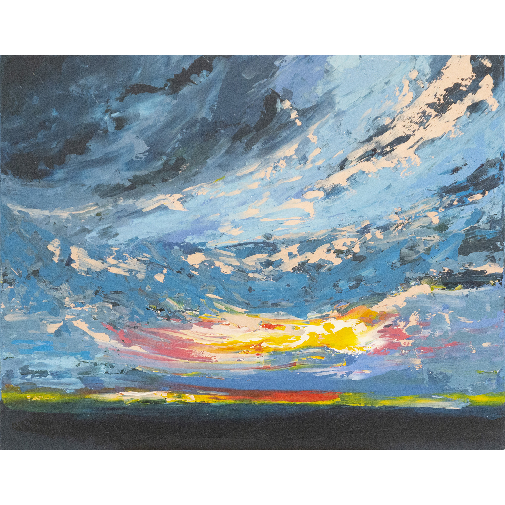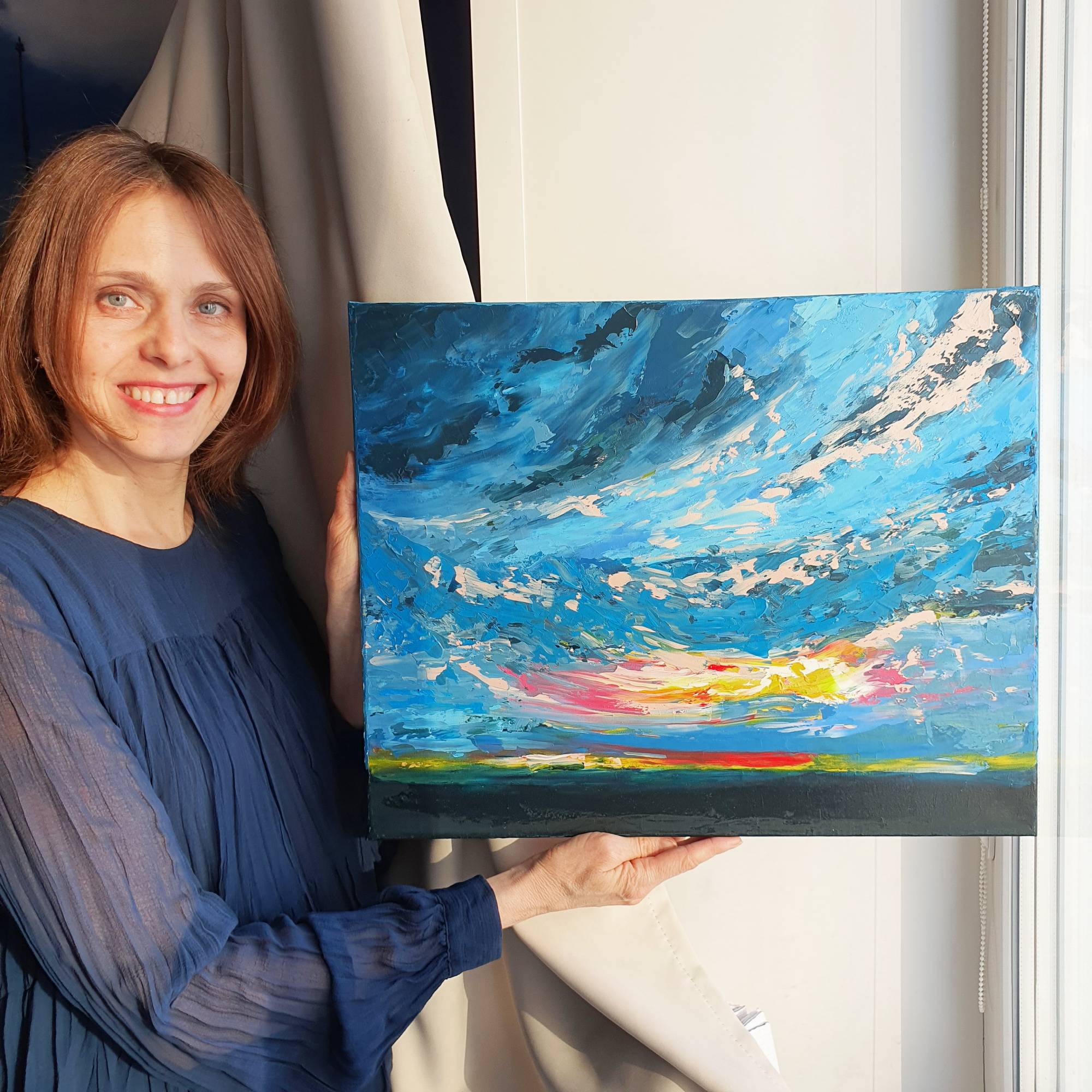 Painting by Marina Fischer. This artwork captures the dramatic beauty of a seashore at sunset. The sky is filled with turbulent clouds and drifting formations, blending together in a powerful play of light and shadow. Through the density of clouds, the radiant glow of the setting sun breaks through, casting warm brilliance over the horizon above the unseen waters. Below, deep darkness has already enveloped the forest stretching along the shoreline, creating a striking contrast with the luminous sky. An expressive and atmospheric seascape that conveys the fleeting moment between light and nightfall.