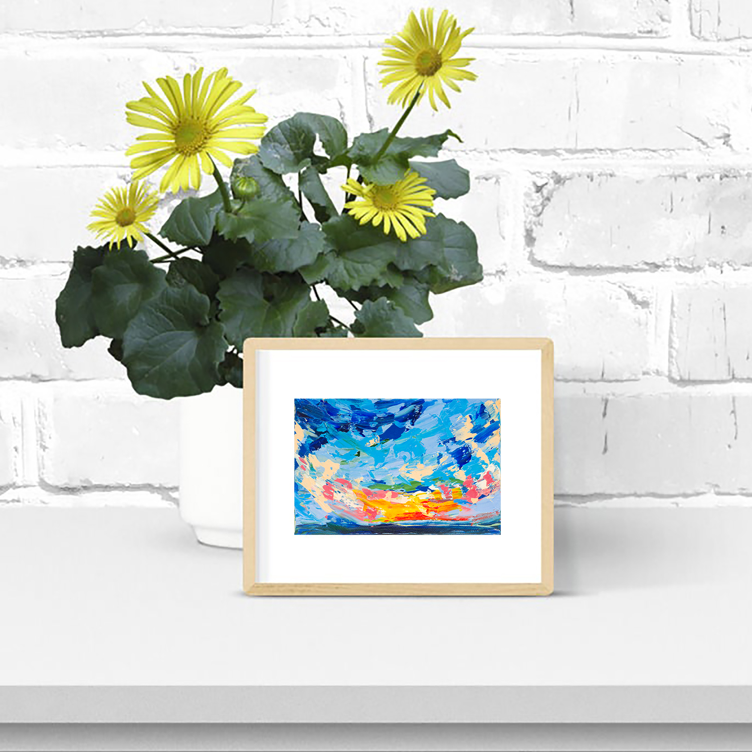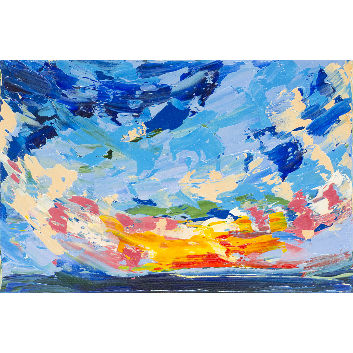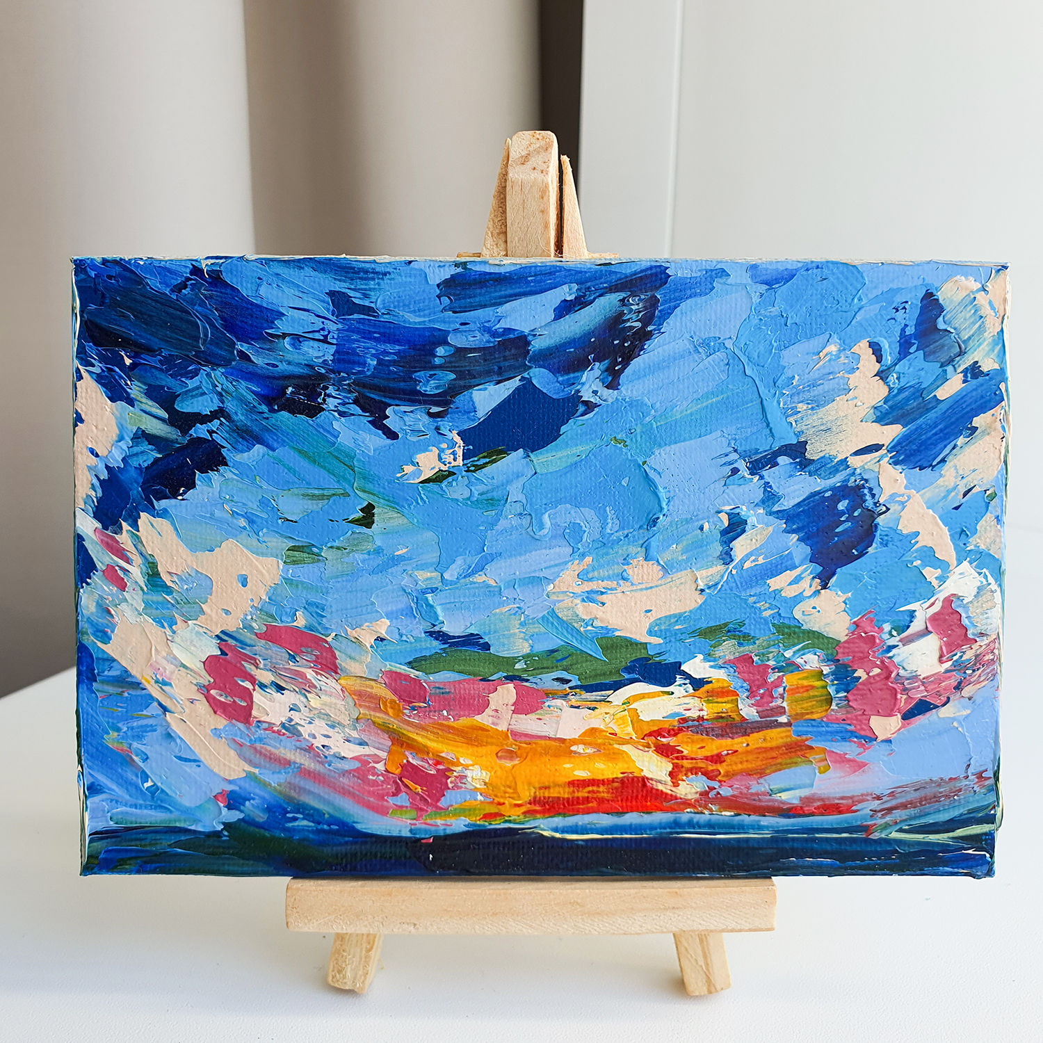 An expressive seascape miniature in oil, perfect for collectors of original art, lovers of sunset paintings, ocean and coastal landscapes, and small format artwork. Ideal for home or office décor, this original oil painting brings the atmosphere of nature, sea horizon, and glowing sunset light into any space.