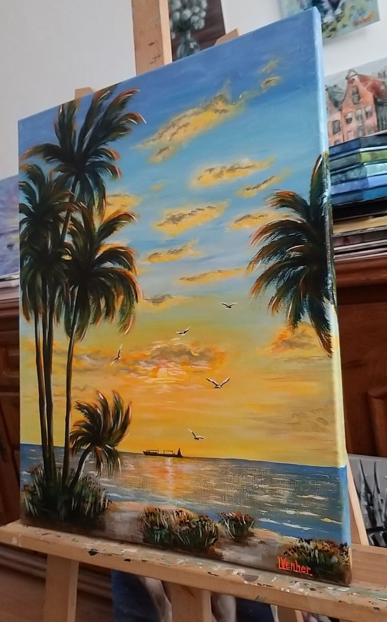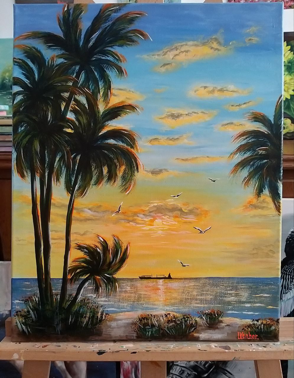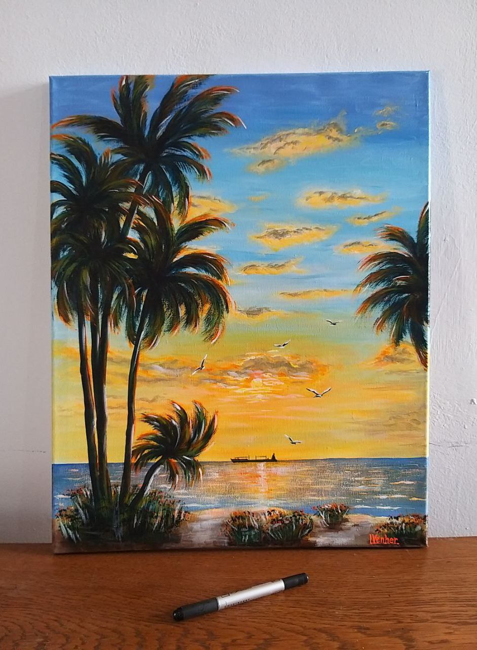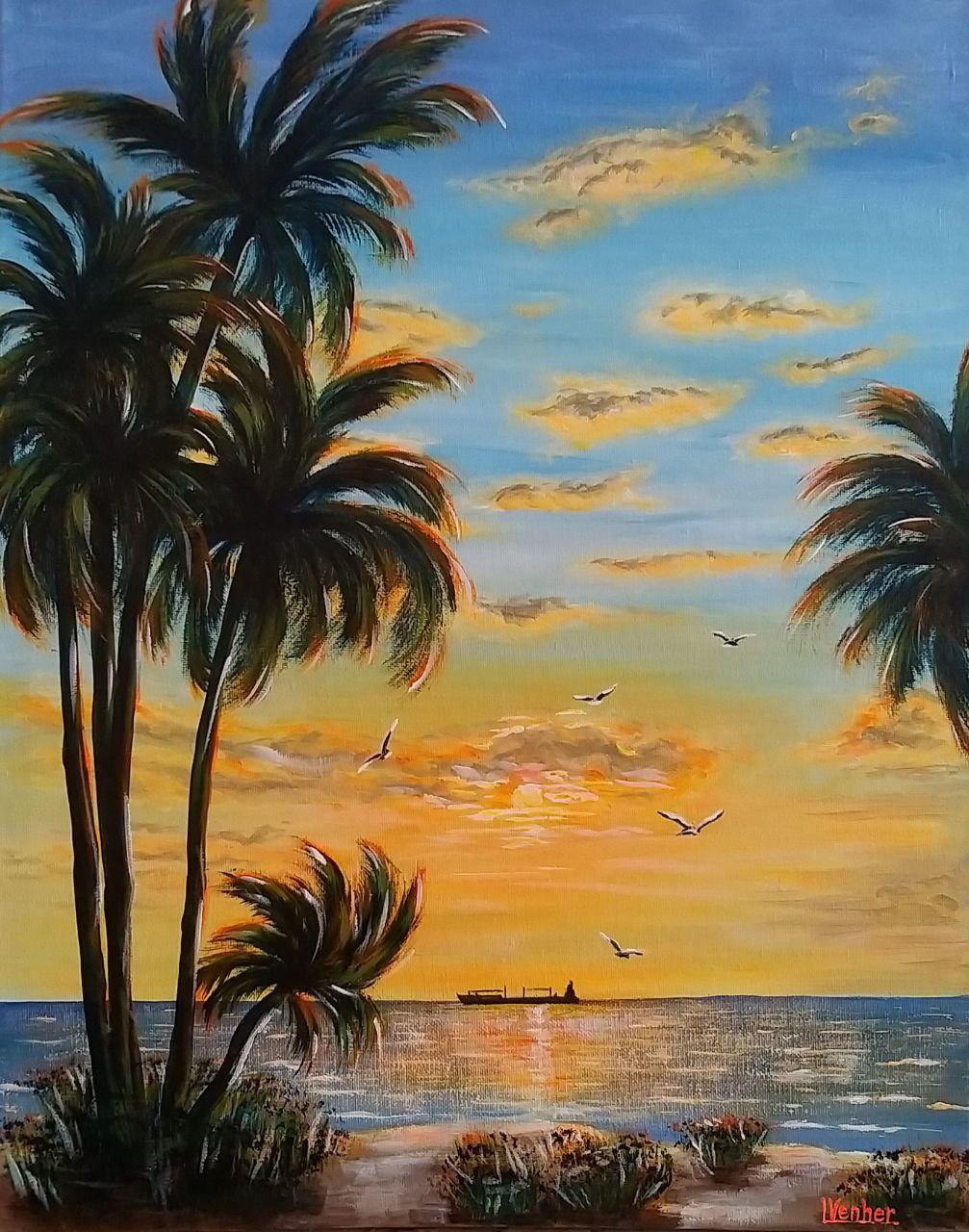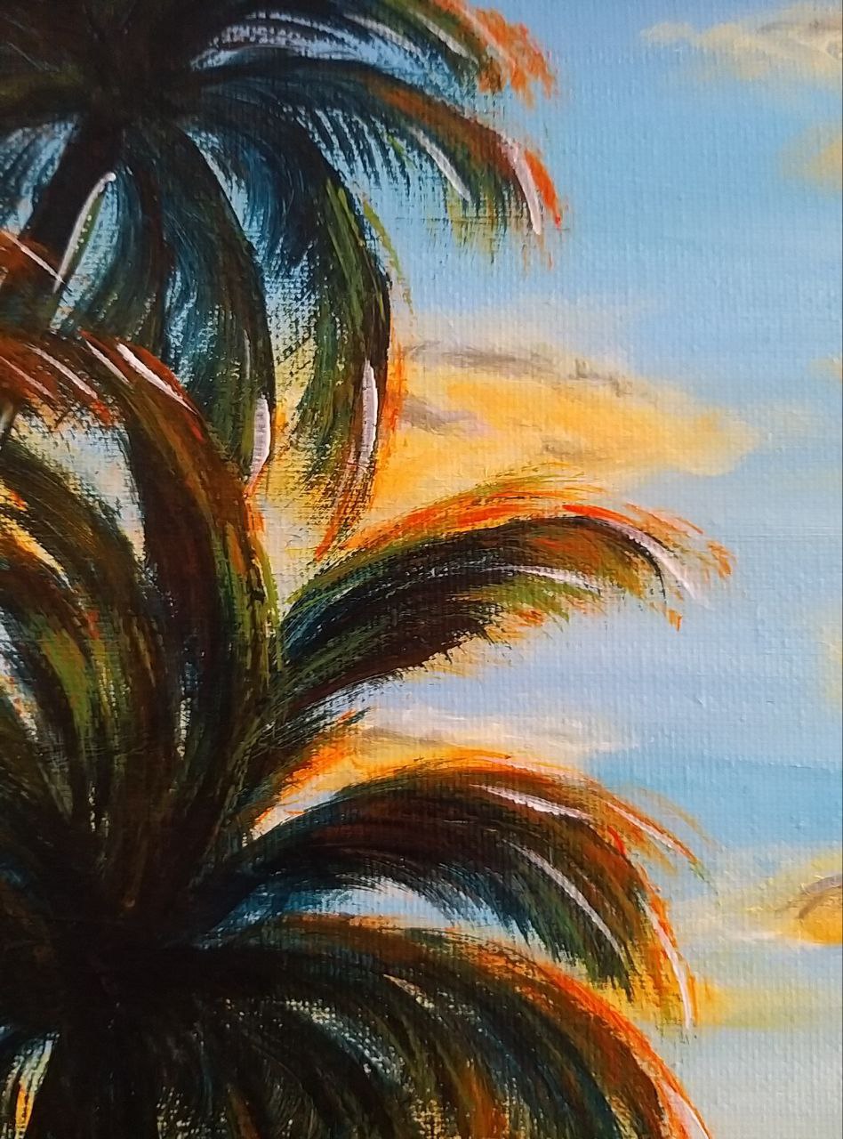 The painting depicts a warm, calming seascape. In the foreground, several slender palm trees rise above the shore, their silhouettes clearly outlined against the setting sun. The leaves sway slightly in the warm evening breeze, and the long shadows of the trees stretch across the sand, as if dissolving in the sunset light.