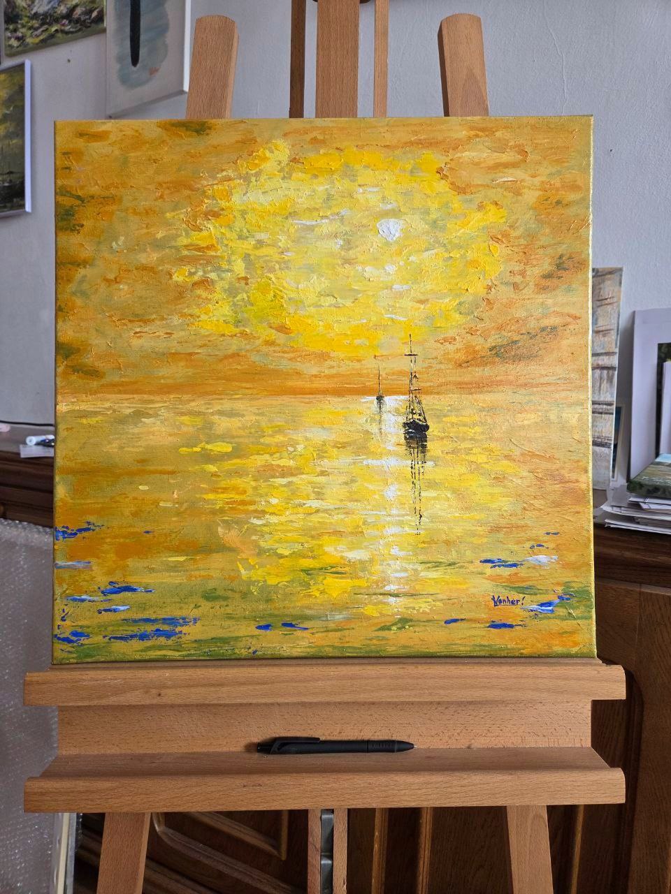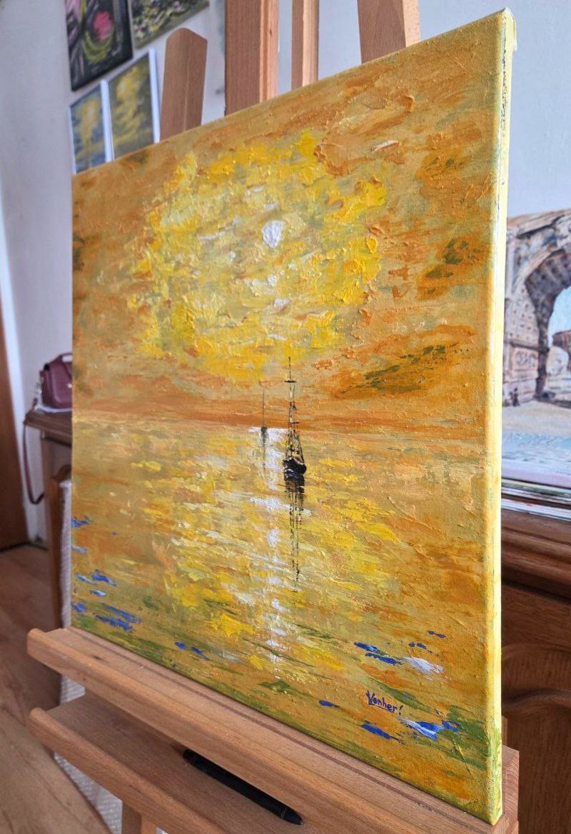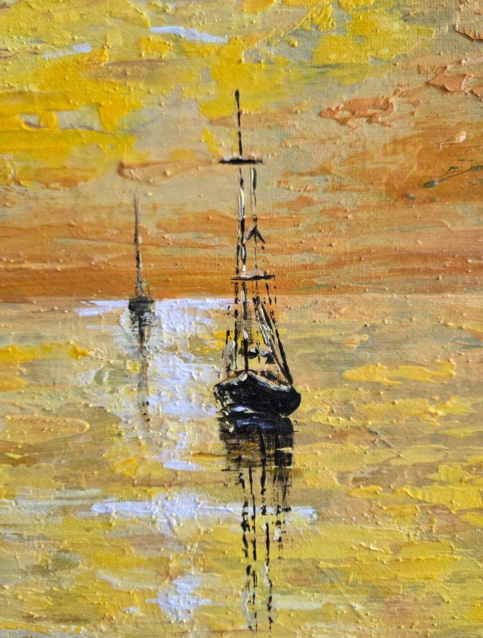 The painting depicts a tranquil seascape bathed in the soft golden light of sunset. The smooth surface of the water reflects the warm hues of the sun—from light amber to rich ochre-gold—creating a sense of profound peace and tranquility. The horizon fades into a soft haze, and in the distance, the silhouettes of fishing boats are barely visible—light, almost ghostly brushstrokes that lend the scene a lively and human quality.