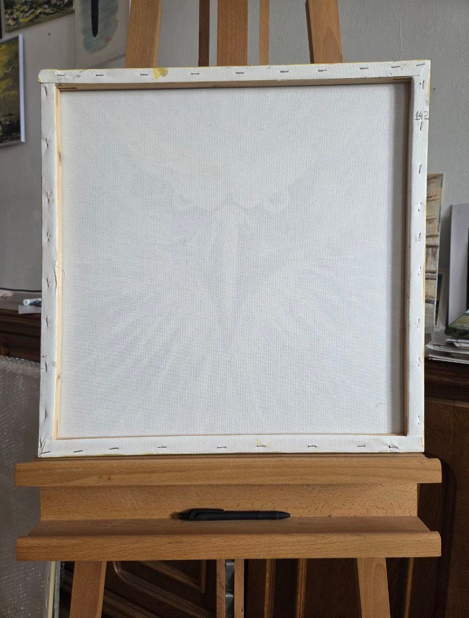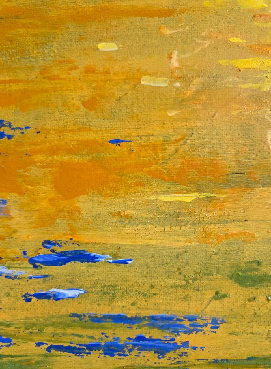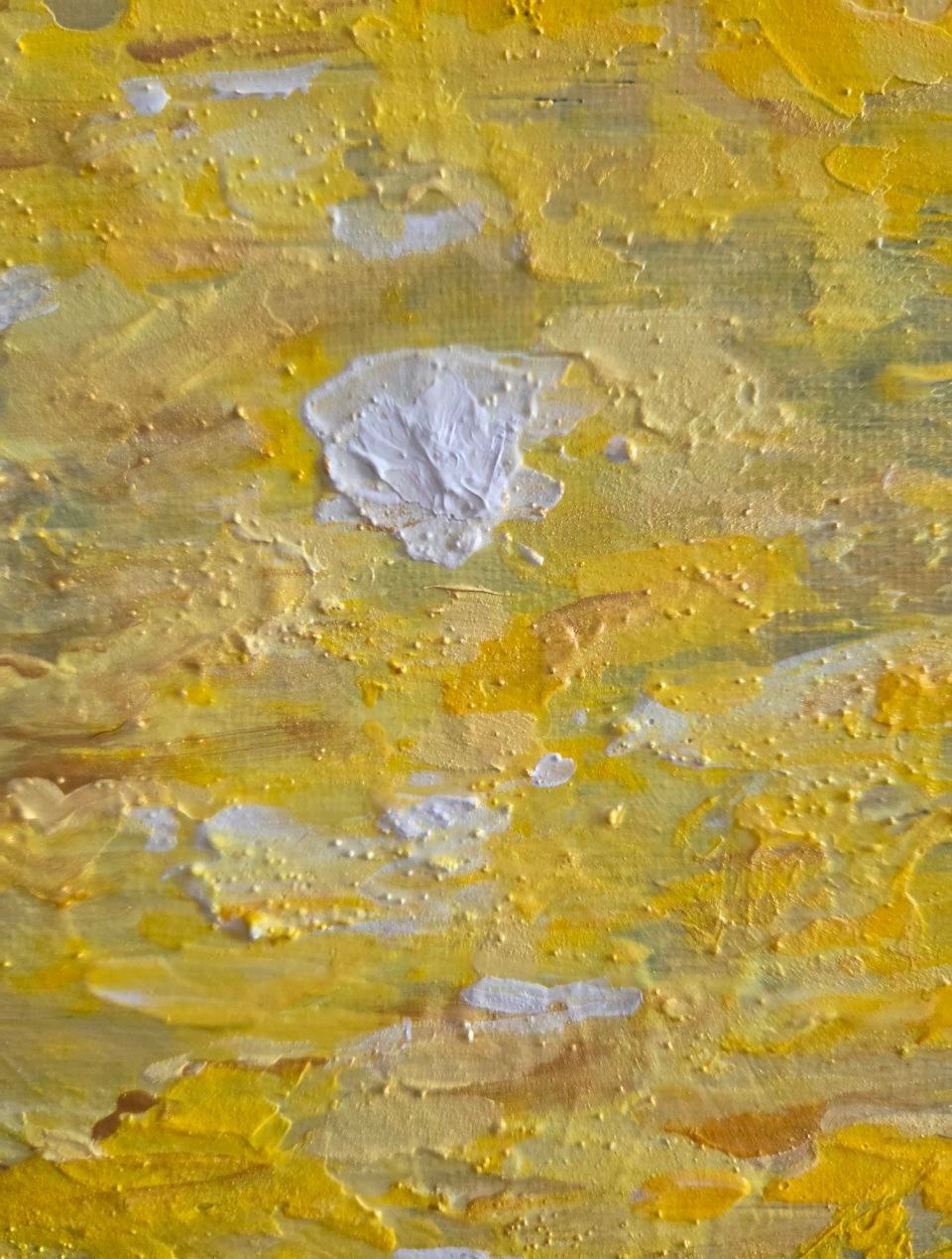 The work is executed using the impasto technique: thick, textured brushstrokes of acrylic paint lend the composition a material quality and a sense of moving light. The palette is predominantly yellow, gold, and warm white tones, with subtle ochre highlights and light accents of brownish-gray shadows. The texture of the brushstrokes highlights the play of light on the surface of the water and the sky, creating an almost tactile sensation of light and air.