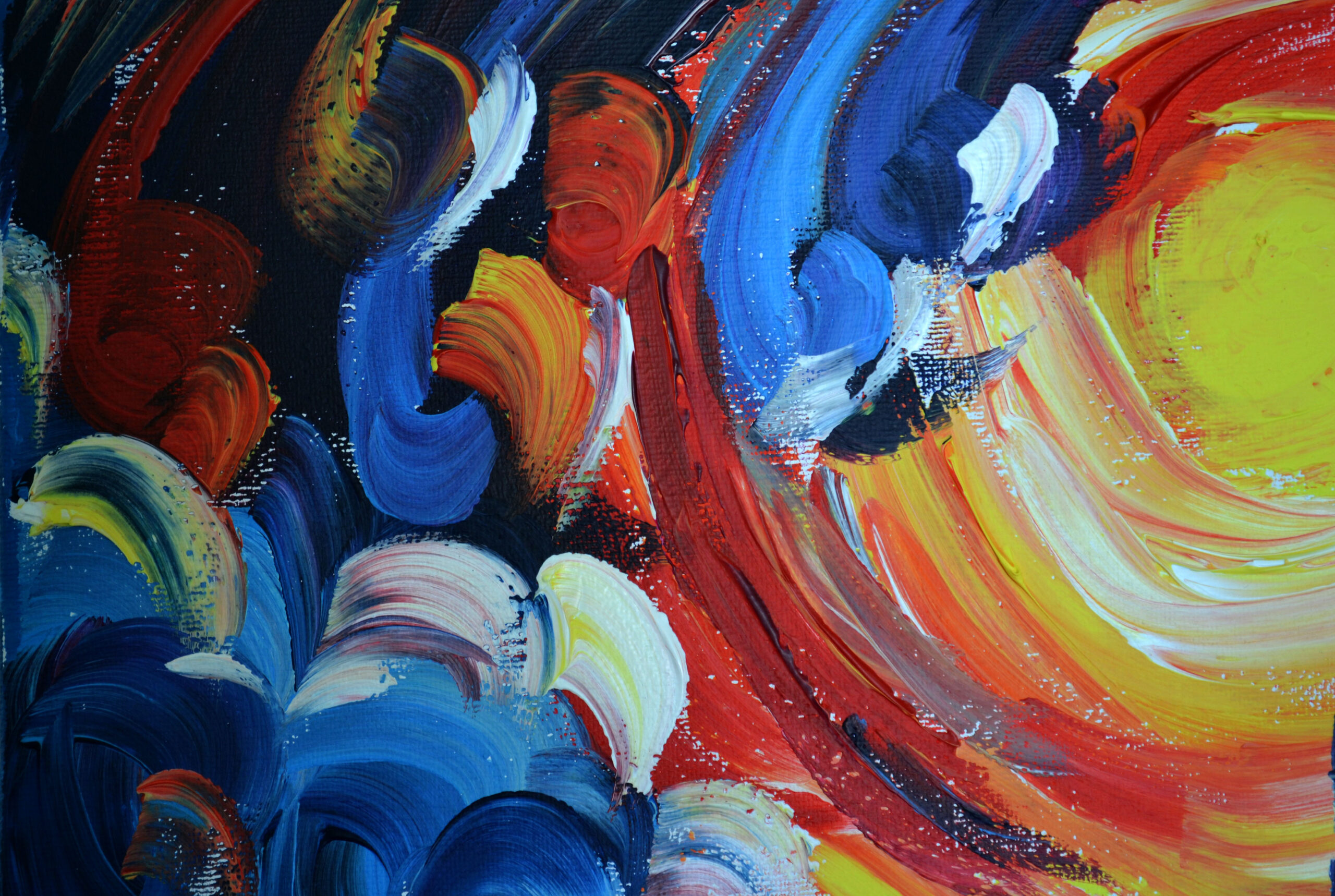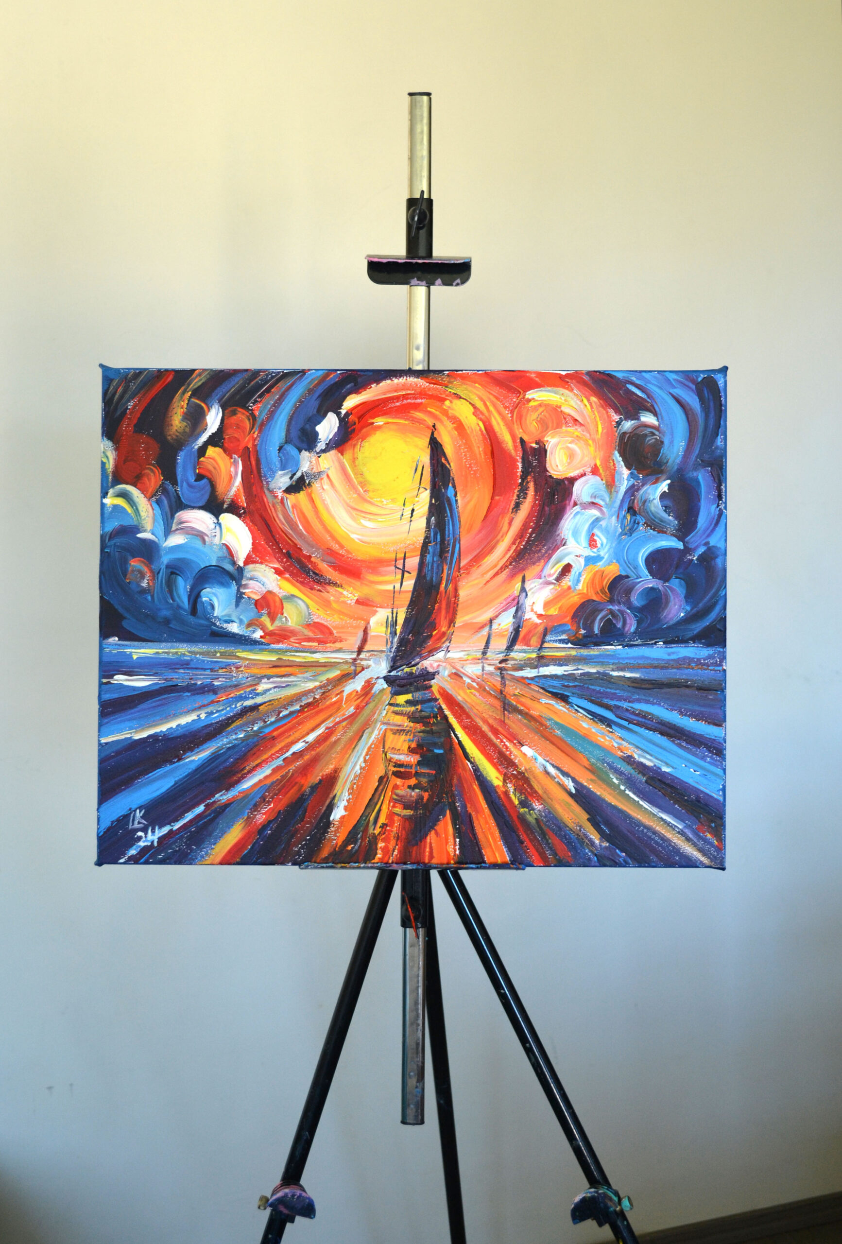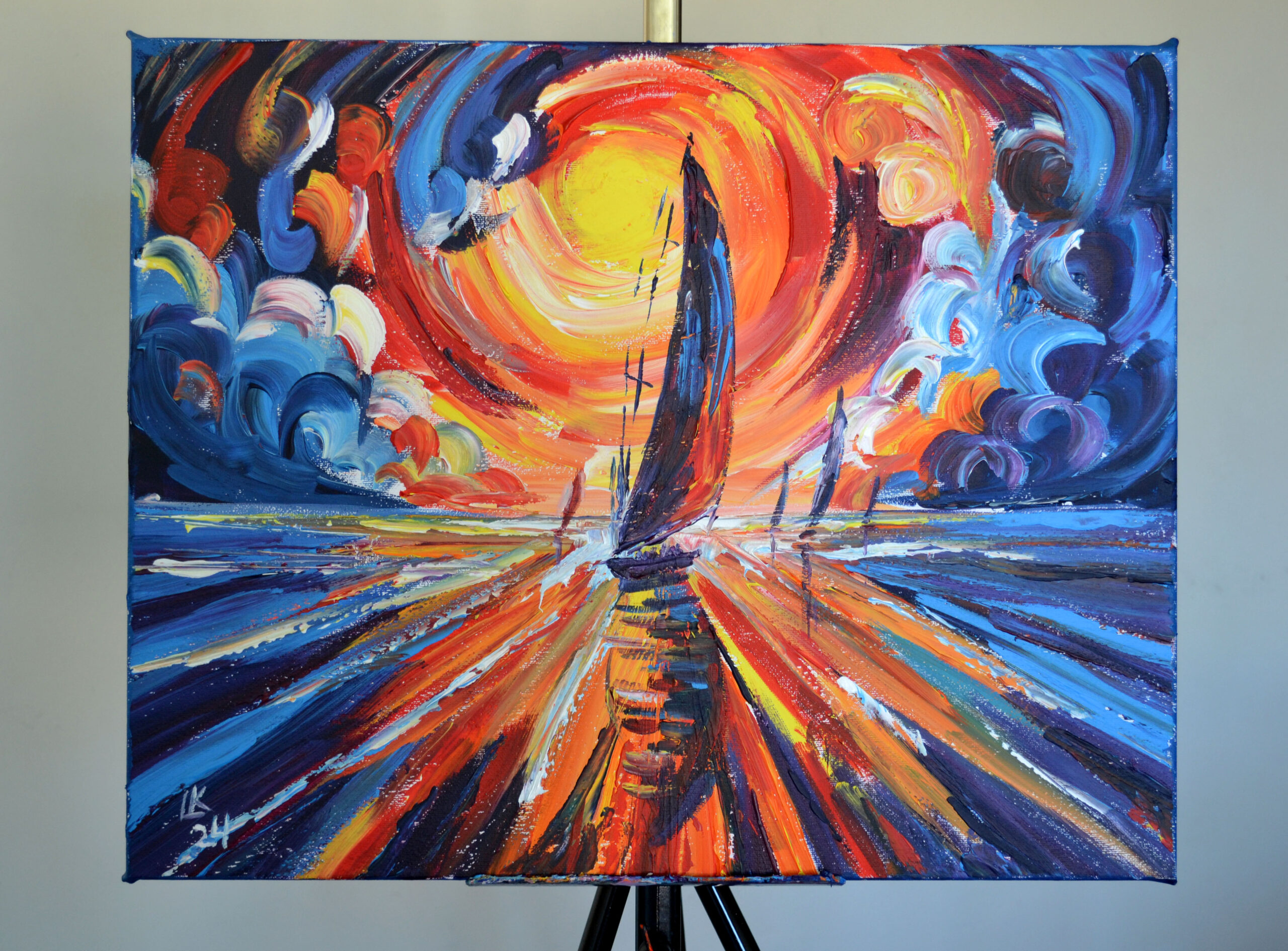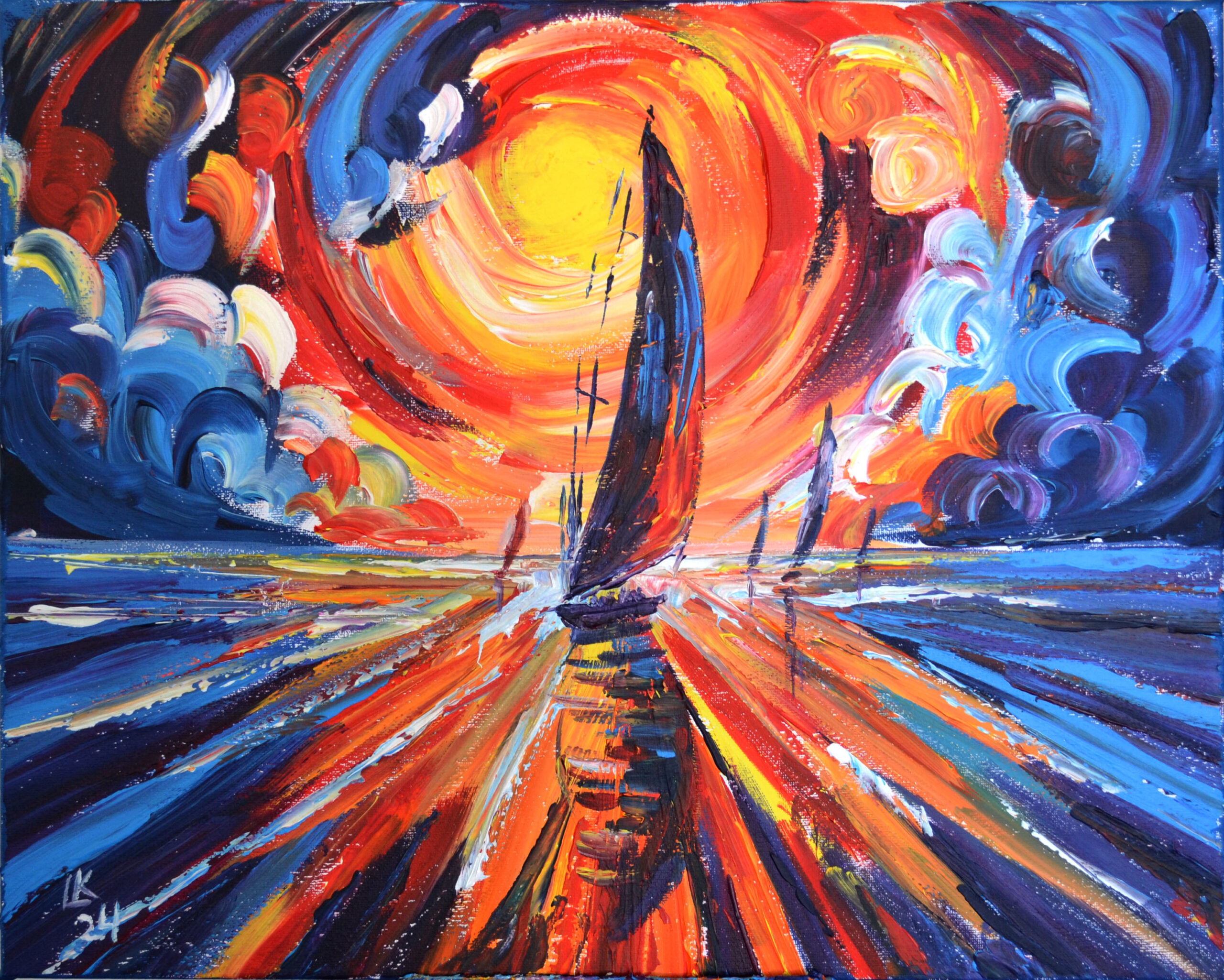 “The Horizon’s Fiery Dance” bursts with energy and color. Sailboats race across the sea, heading straight into a glowing, swirling sun. Meanwhile, bold strokes of red, orange, and deep blue sweep through the sky. These colors twist and turn, creating a sense of wind, motion, and excitement.