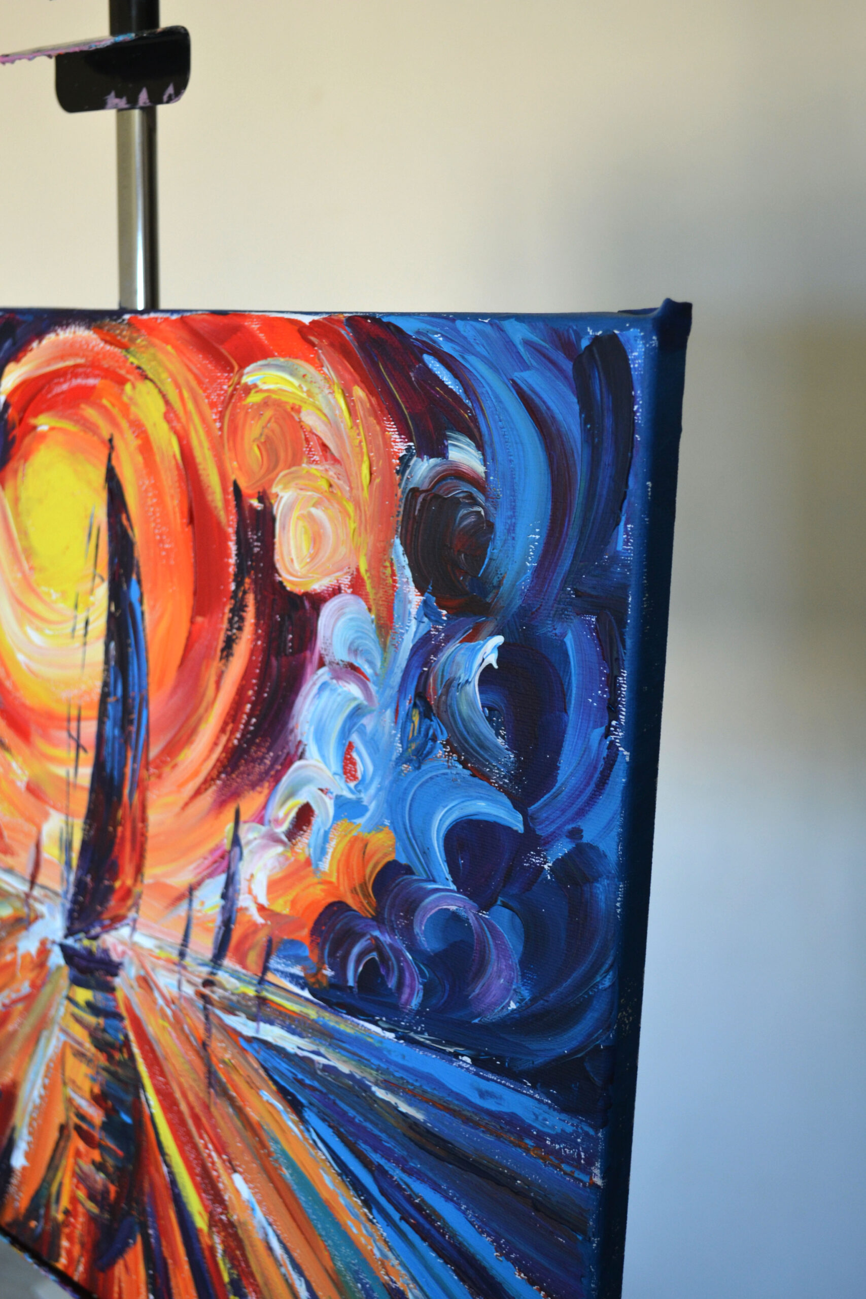 Vibrant acrylic seascape with racing sailboats and a glowing sun. One-of-a-kind artwork, 50×40 cm, ships with certificate of authenticity.