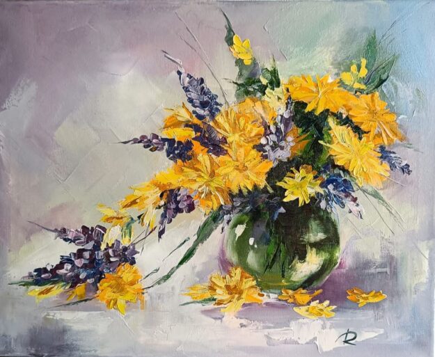 The author used a dense, textured brushstroke that creates a relief on the surface and highlights the flowers in such a way that one can almost hear the rustle of the petals. This painting invites you to pause and remember how little is needed for happiness: a simple composition, a ray of light, and yesterday’s bouquet, which has now become a symbol of home warmth and beauty.