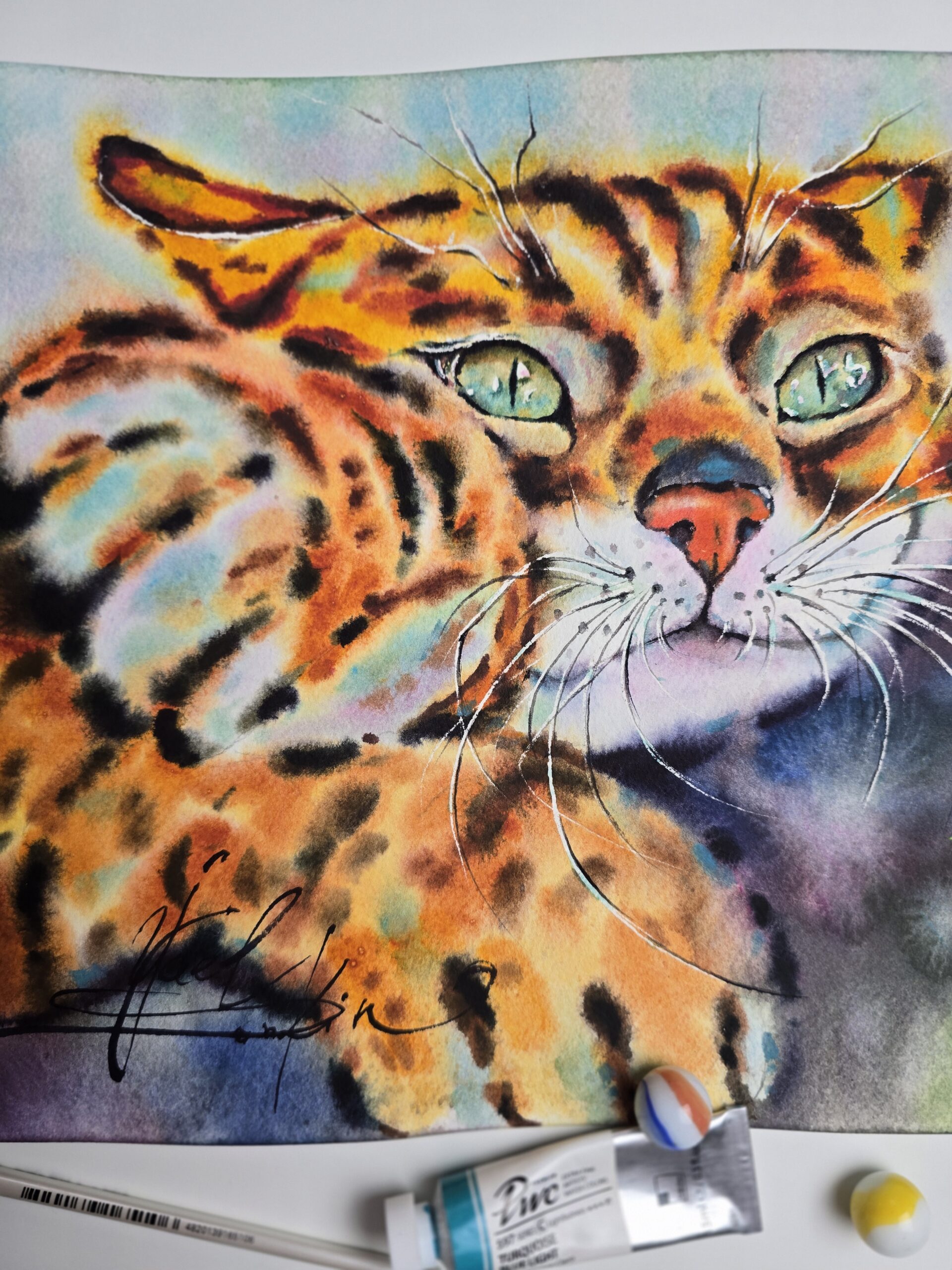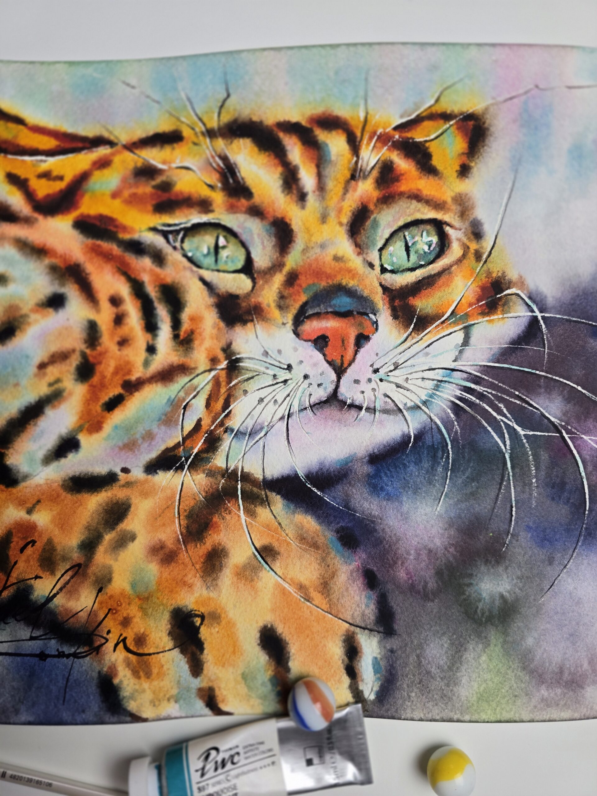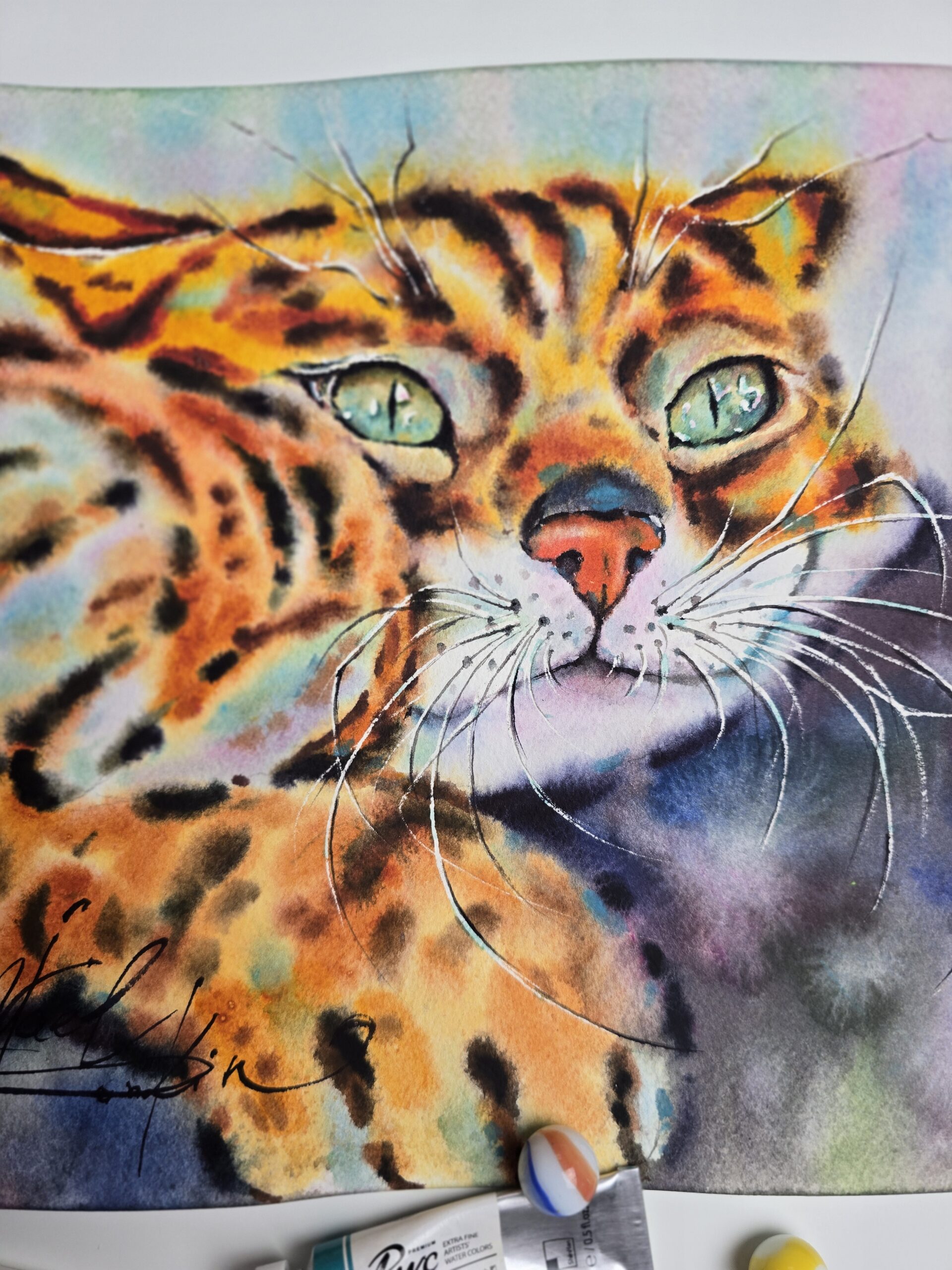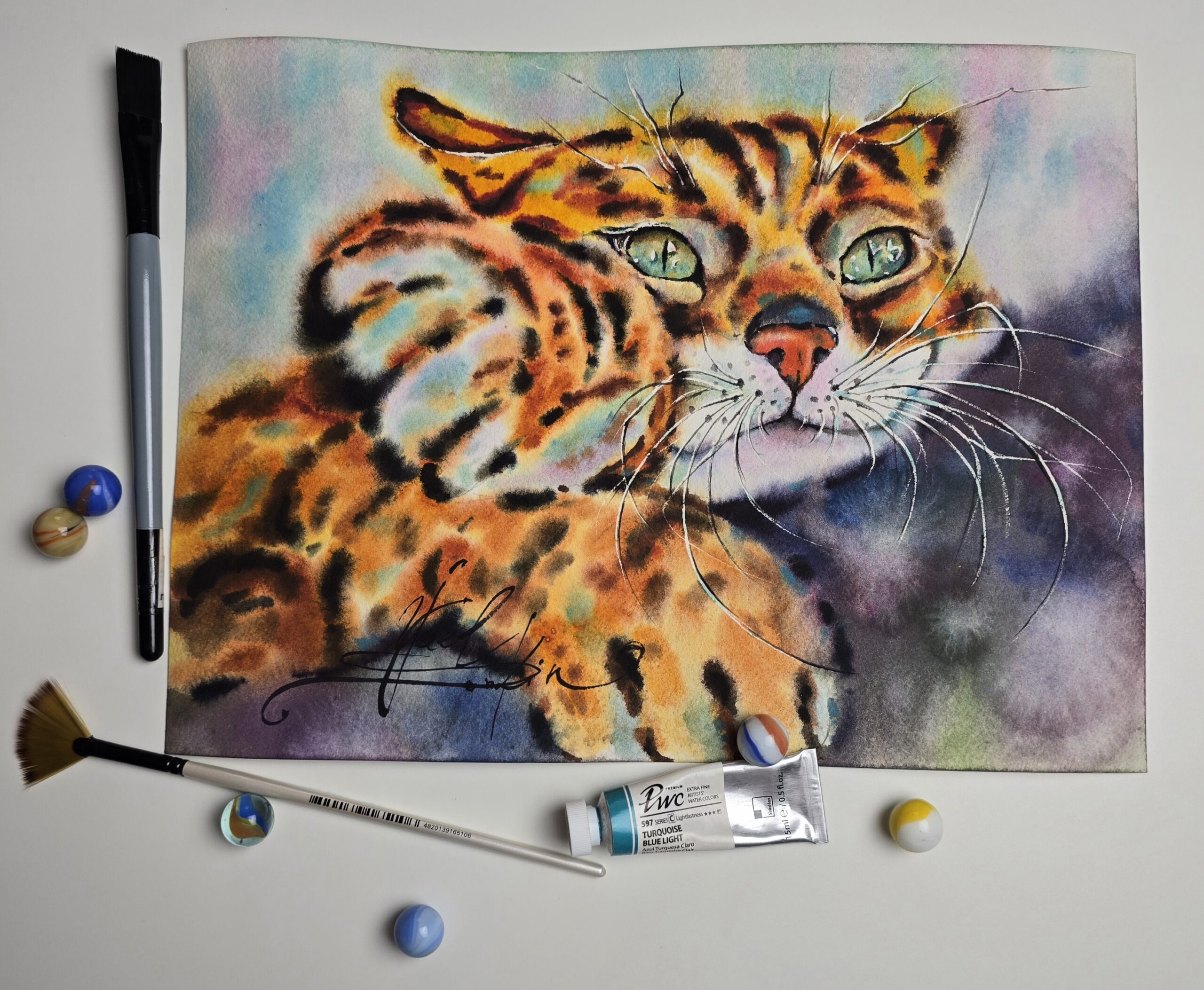 🎨This original watercolor painting captures the striking beauty of a Bengal cat with its vivid orange and black markings and piercing green eyes.
