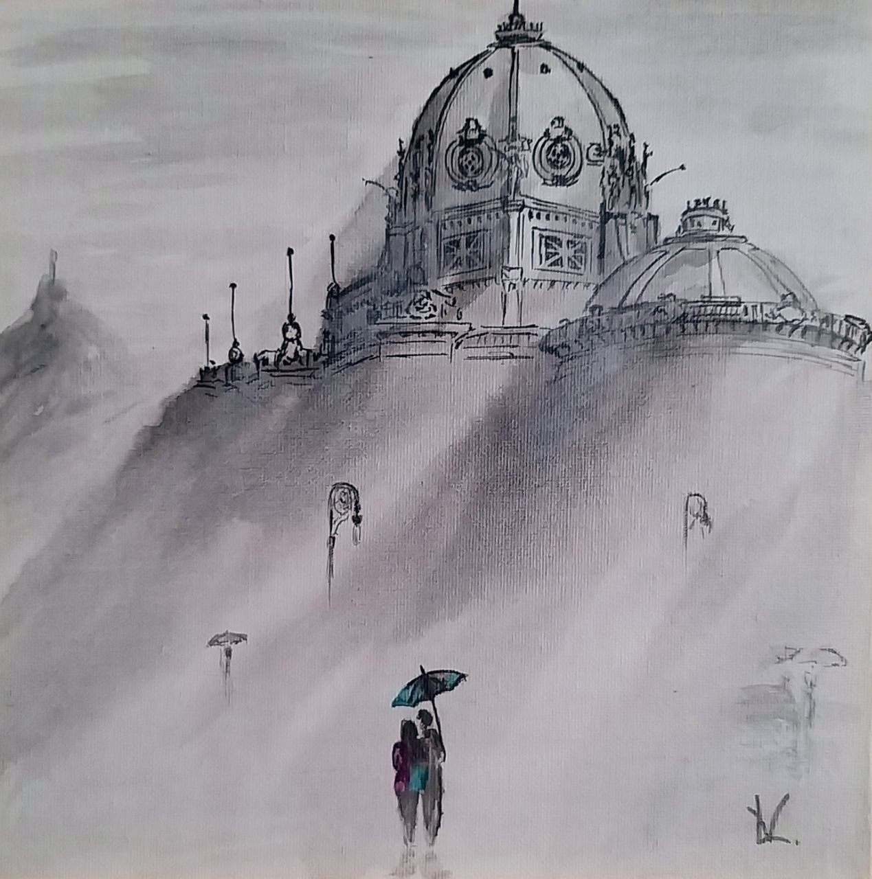 In the foreground – a couple of lovers, sheltered under one umbrella. They walk slowly, almost without talking, absorbed in each other. Their figures are reflected in the wet pavement, and it seems that this reflected world lives its own life. Everything around – sounds, movement, even the rain – seems to have lain dormant, giving way to their solitary moment.