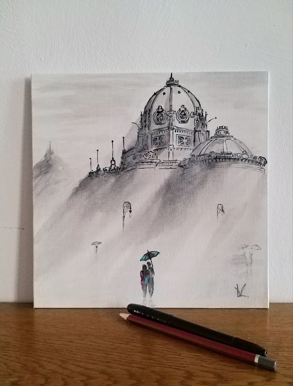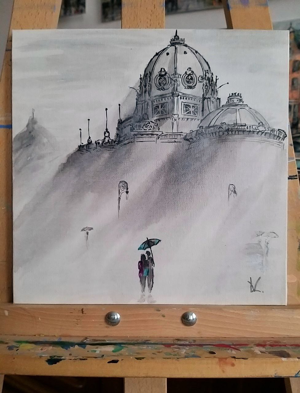 Above this mysterious, almost ghostly landscape, the dome of the cathedral rises majestically – it pierces the fog, as if hovering above the city. Its outlines are clearer than the others, and it seems almost unreal, like a memory or a dream.