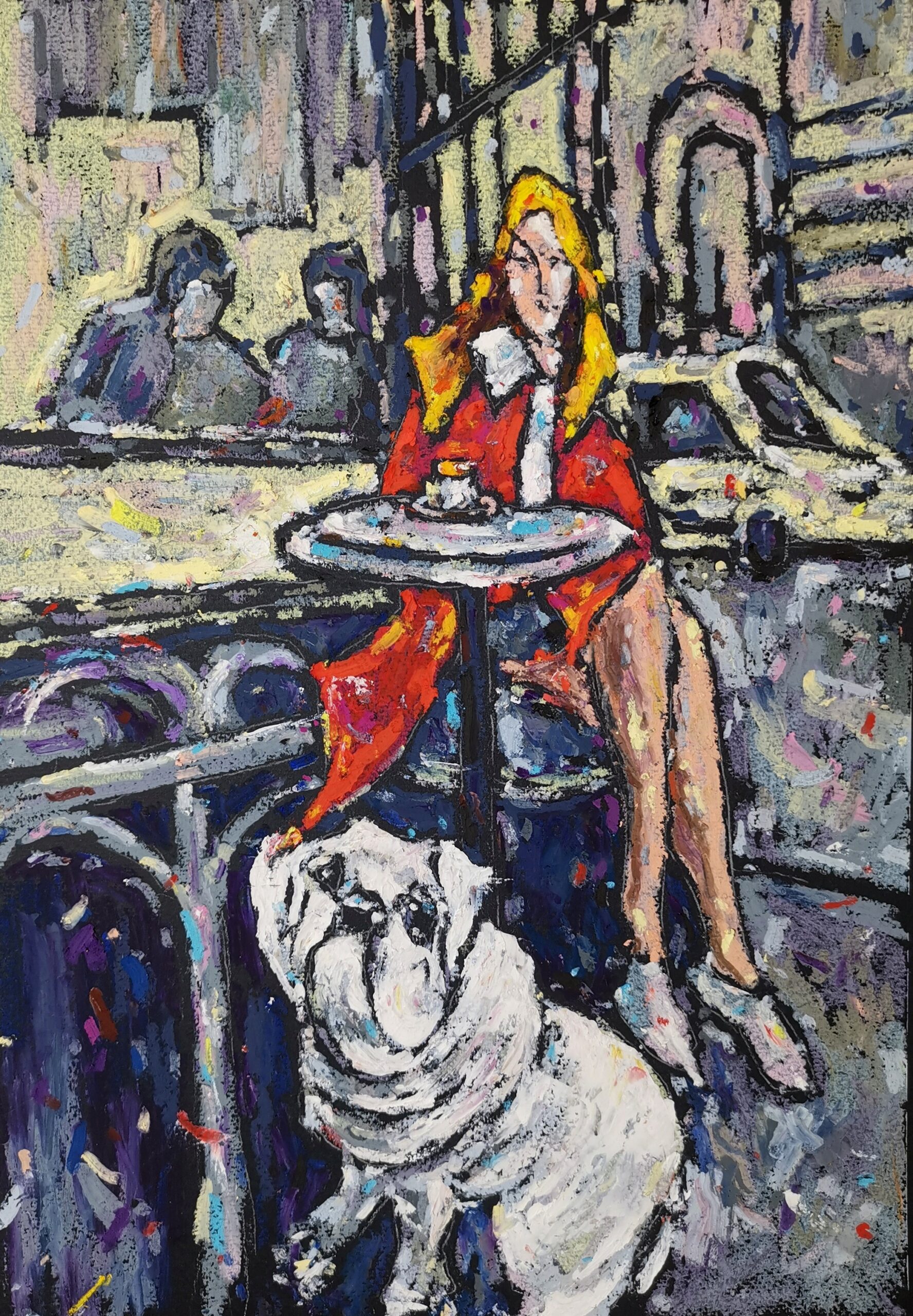 🎨This original oil pastel painting captures a stylish urban café moment: a lady in a striking red dress enjoying her coffee, accompanied by her loyal bulldog.