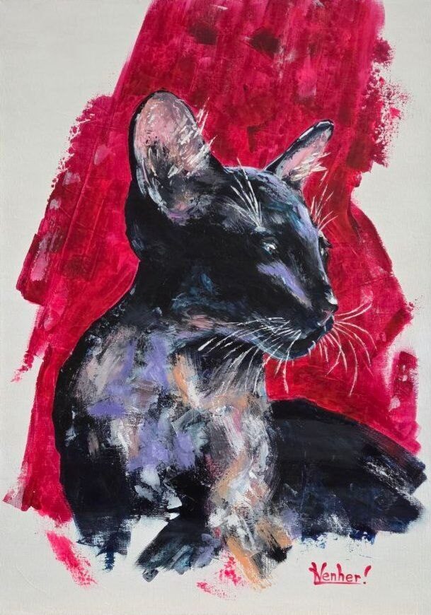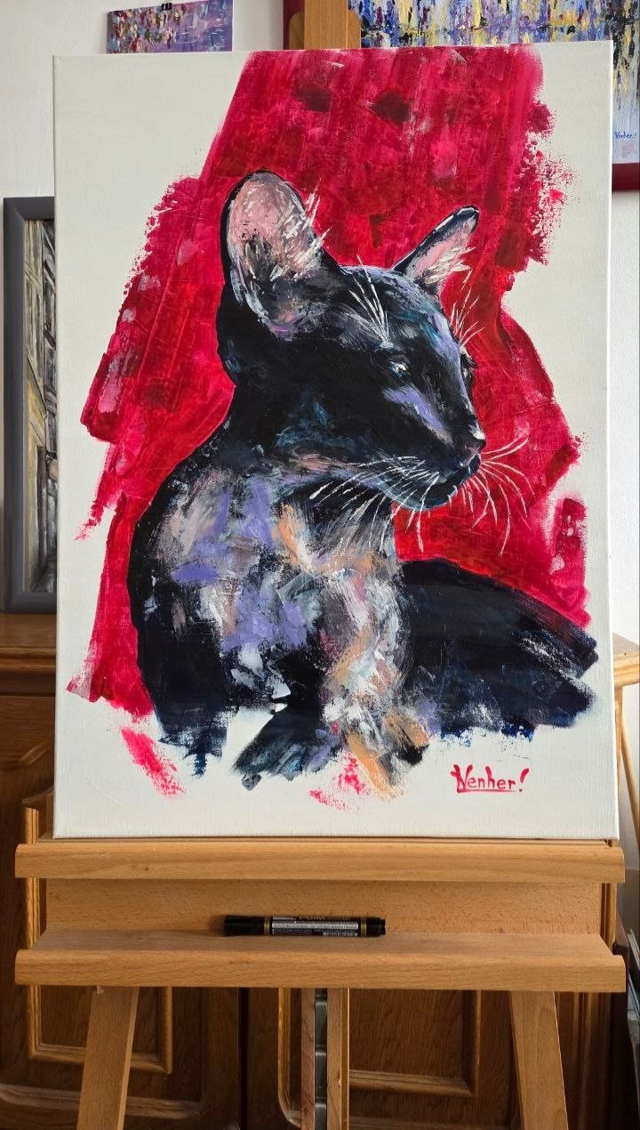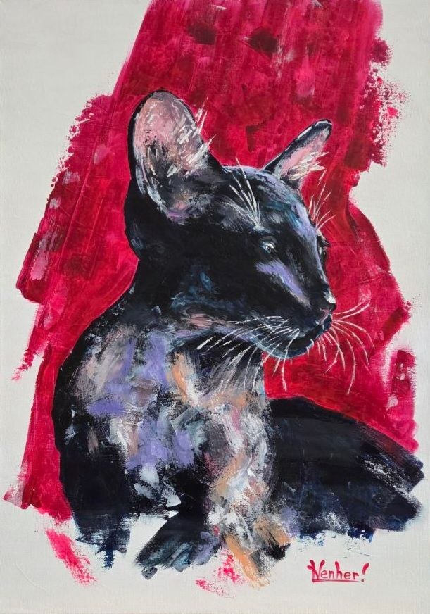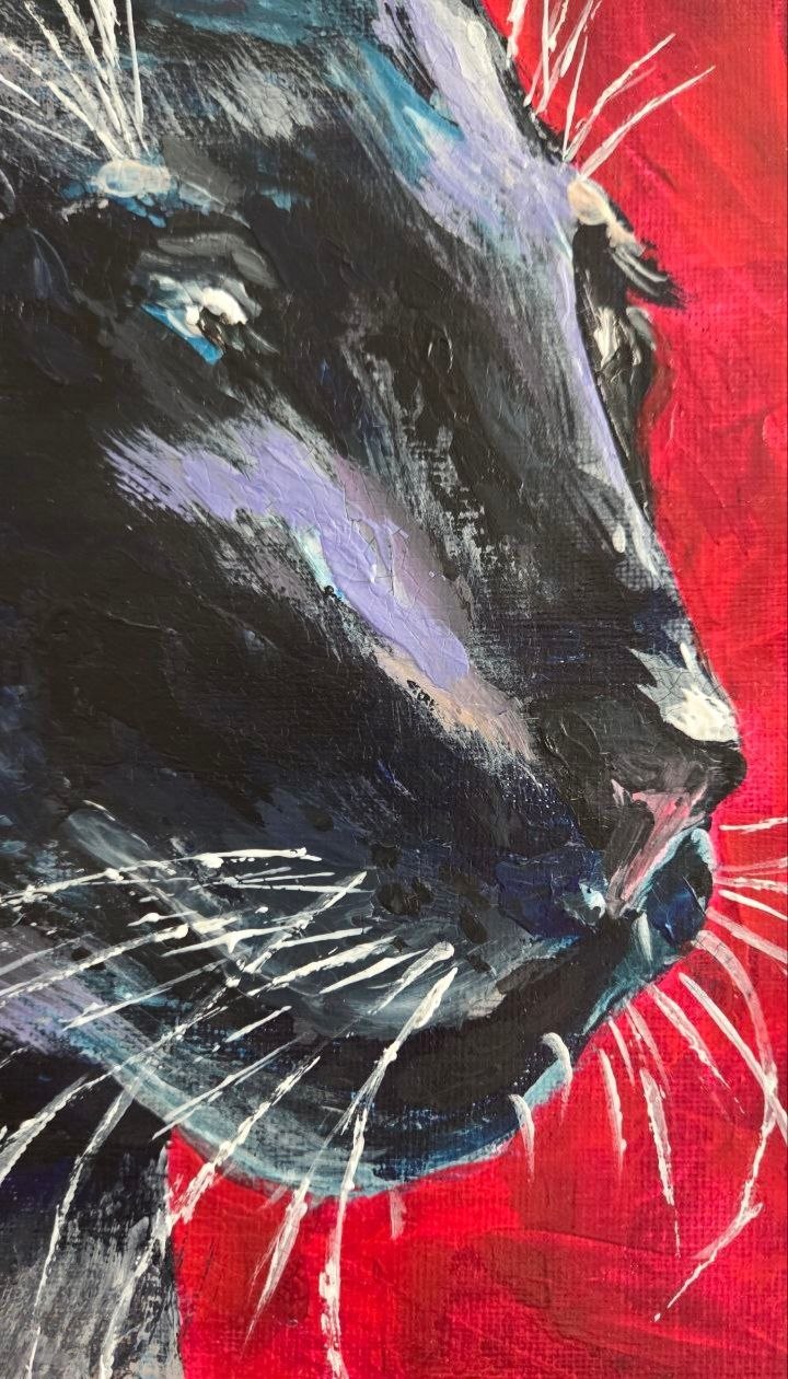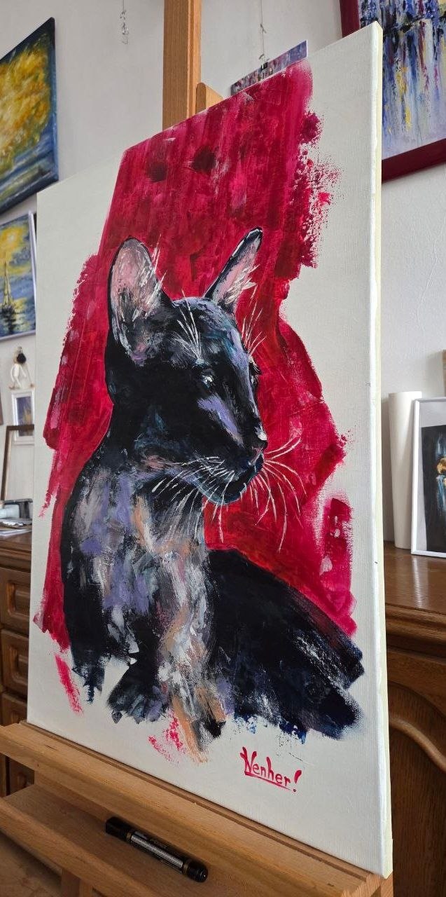 The red background heightens the drama of the scene, highlighting the contrast and giving the image an almost symbolic quality: the cat becomes not just an animal, but the embodiment of grace, mystery, and inner strength.