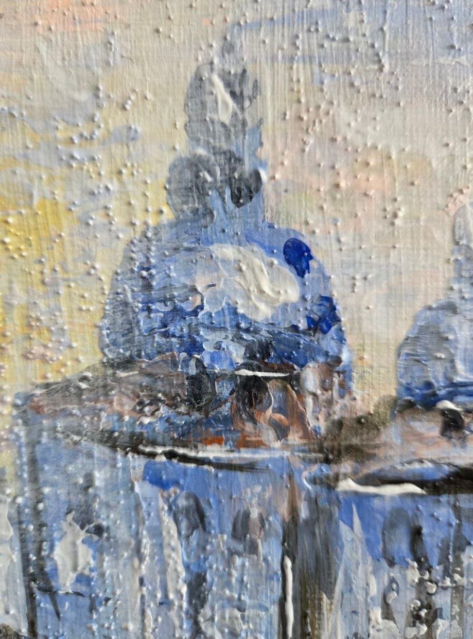 The painting “Venice, in the Gold of Sunset” conveys the magical atmosphere of one of the most romantic cities. The entire canvas is permeated with the soft golden light of the sunset, reflected in the waters of the canals and on the ancient facades of Venetian houses.