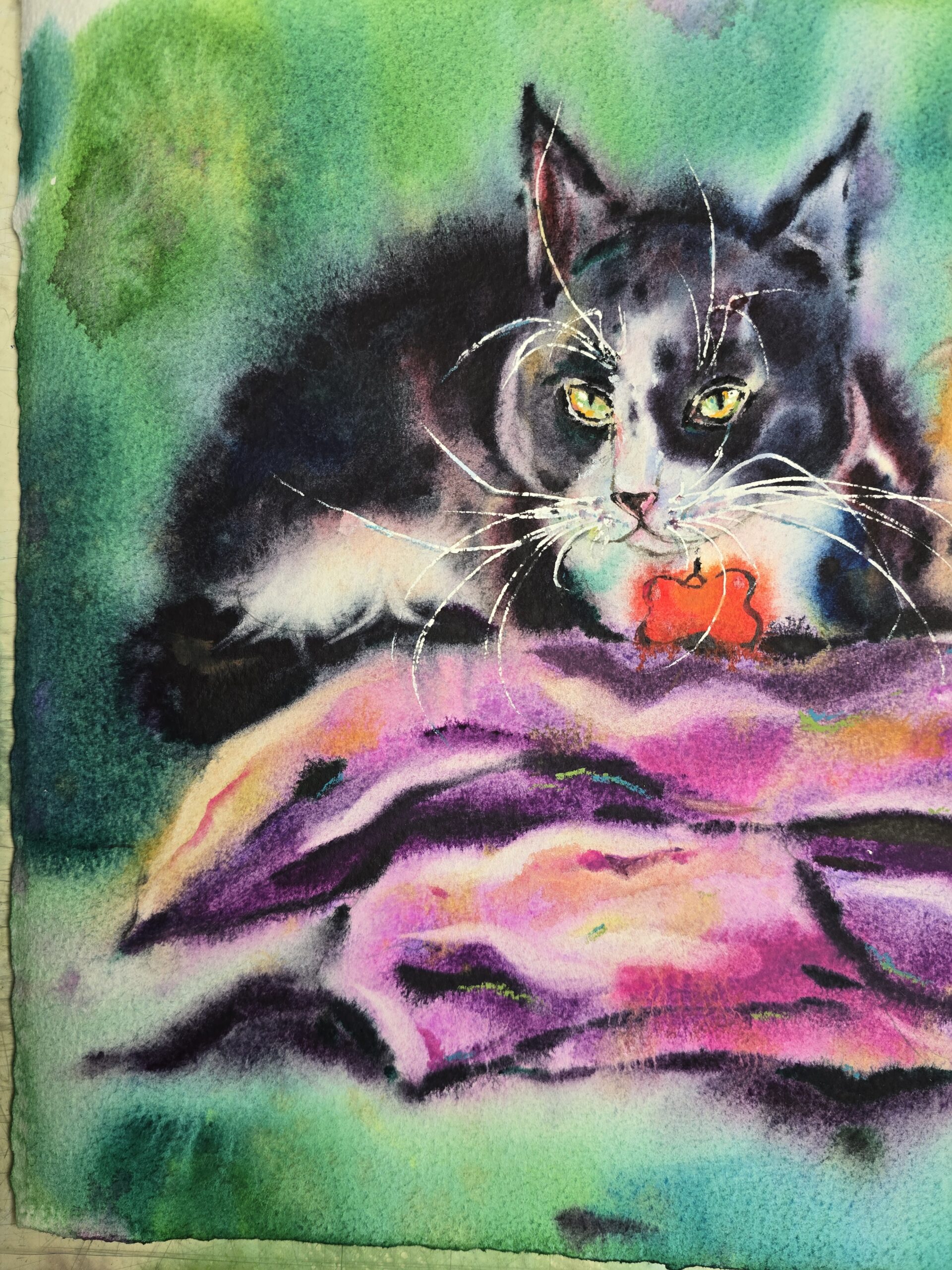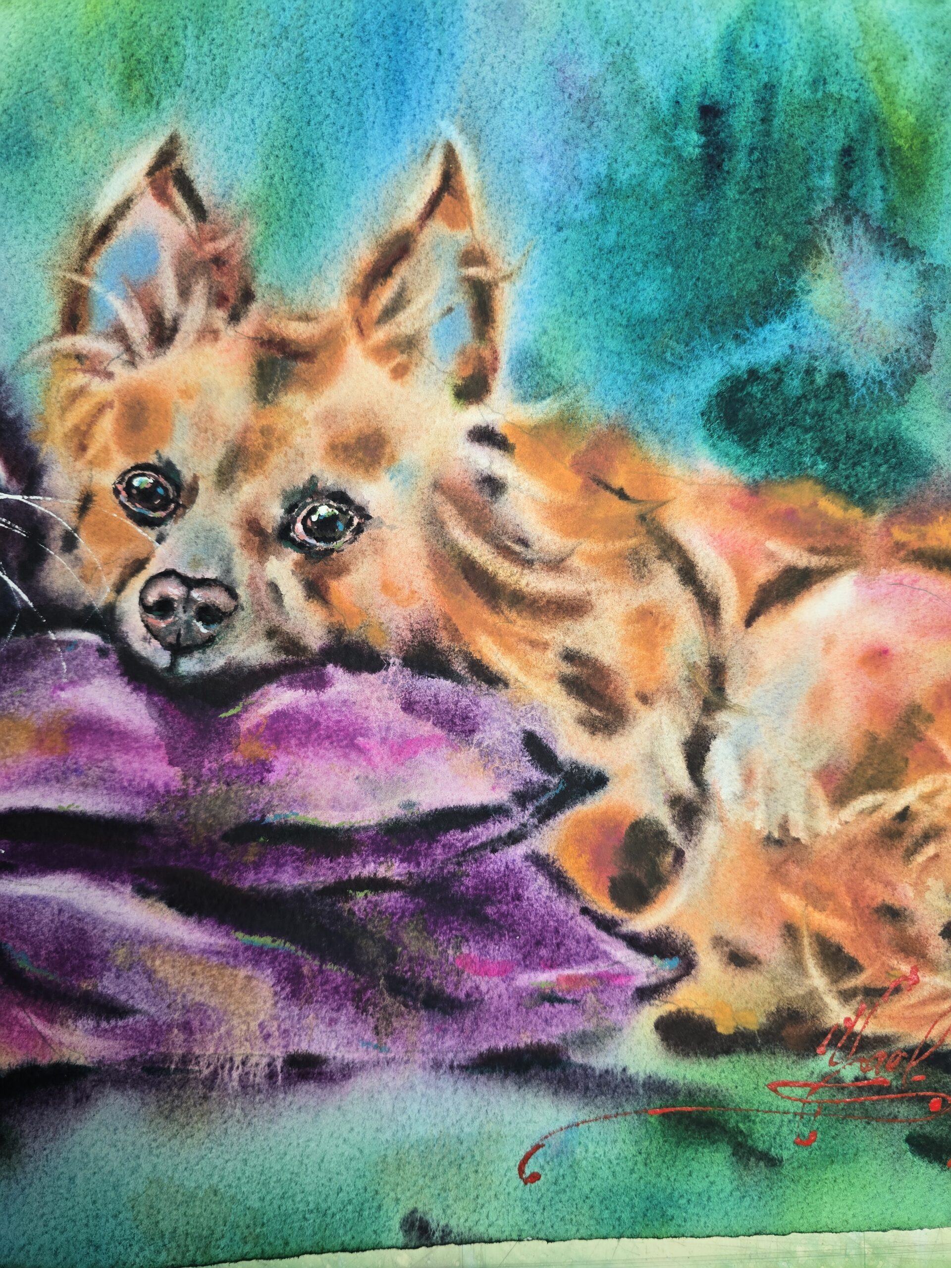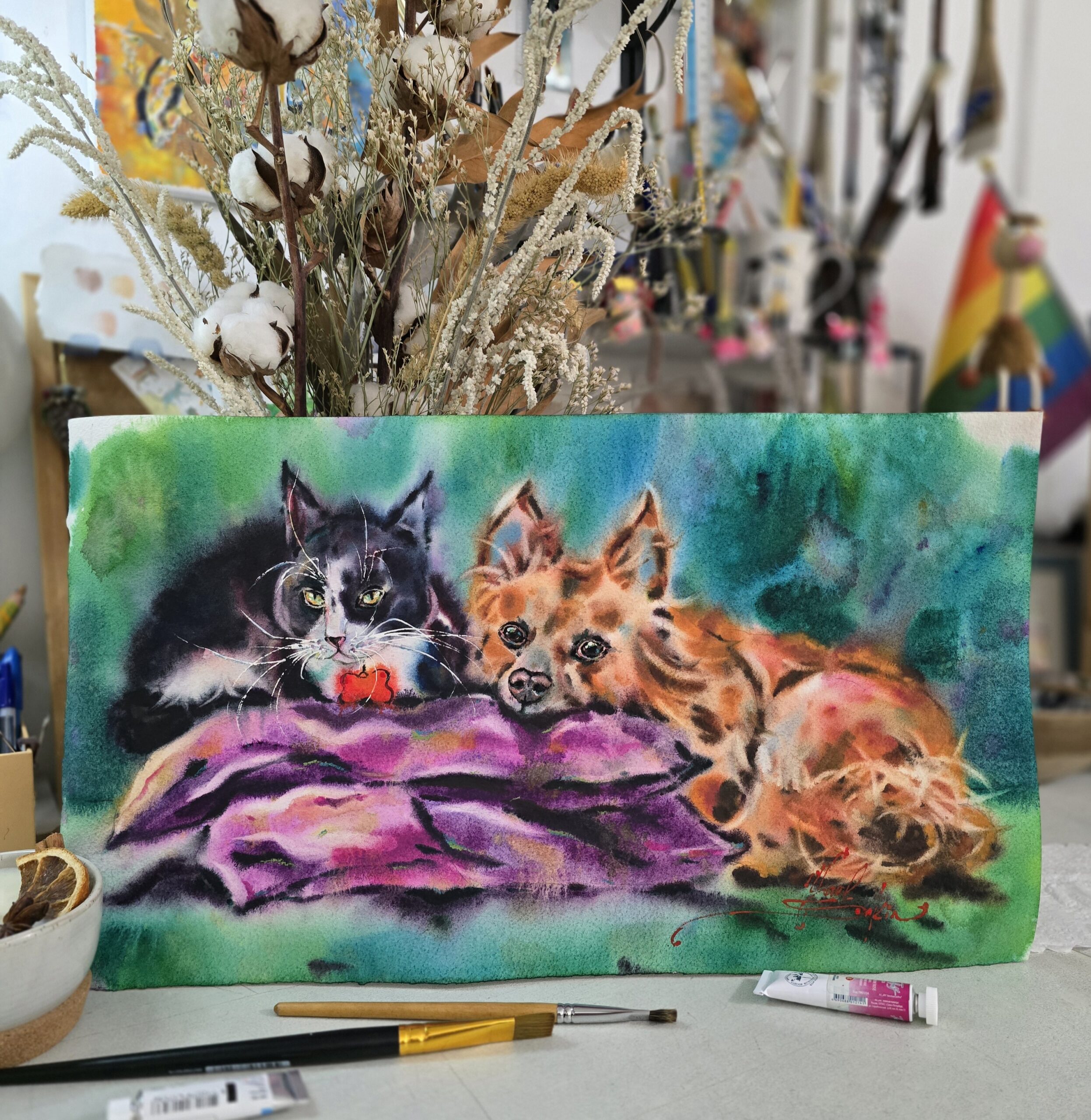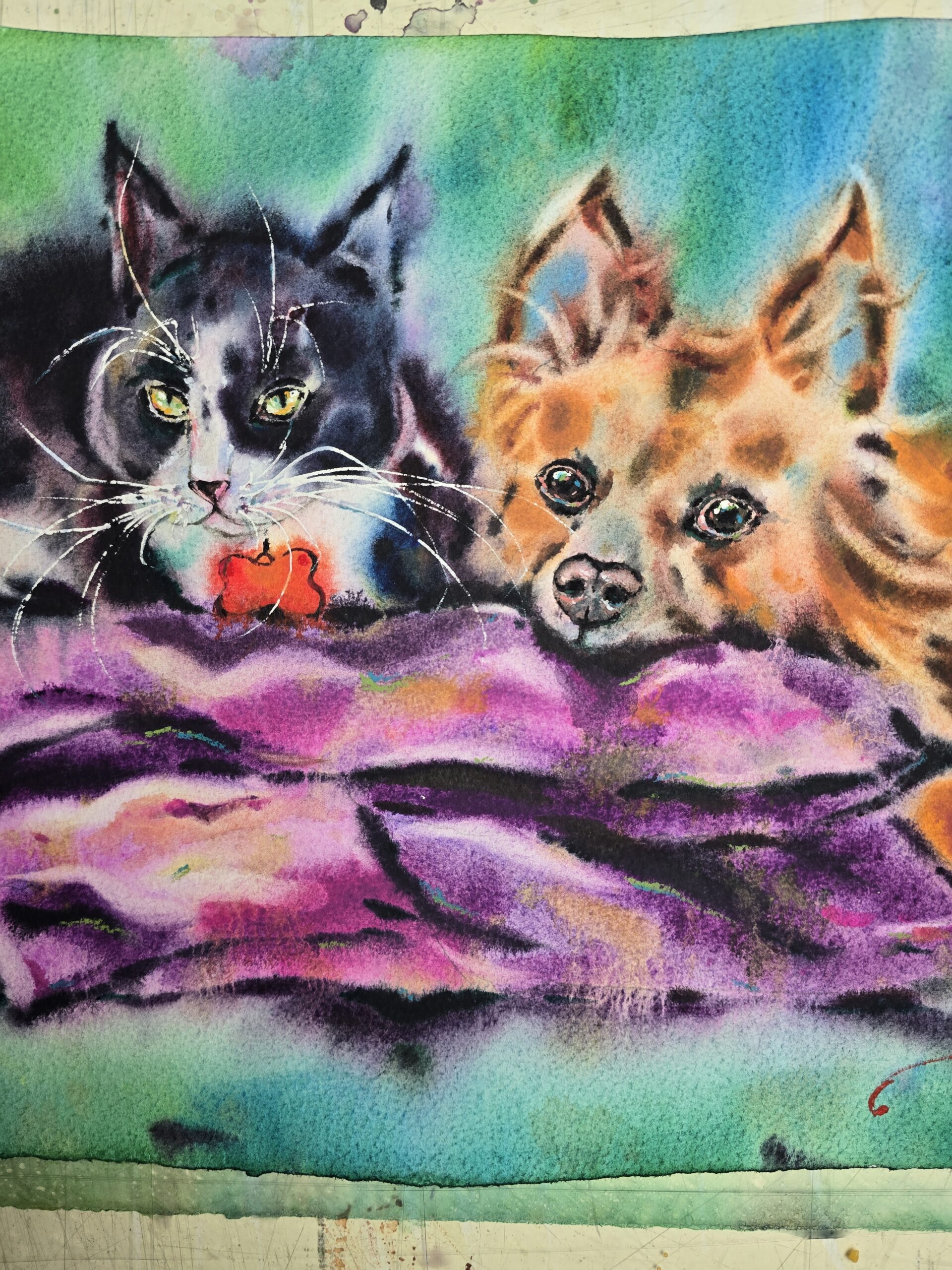 🎨This original watercolor painting captures the tender bond of friendship between a cat and a dog, resting side by side. With expressive brushstrokes and vibrant colors, this artwork radiates warmth, harmony, and the beauty of companionship.