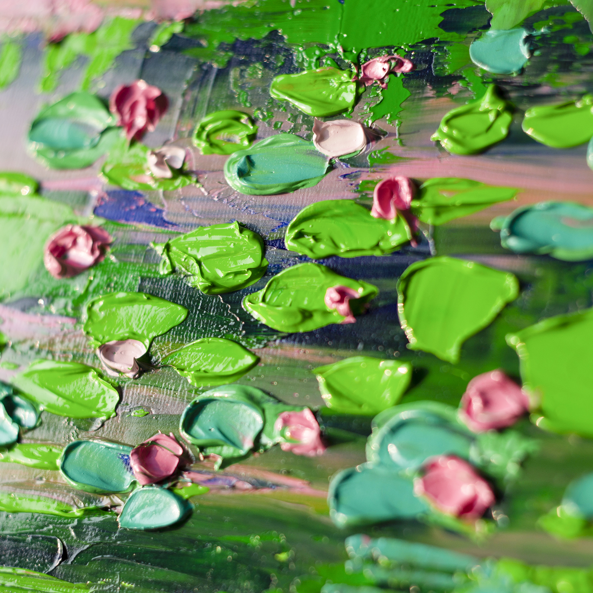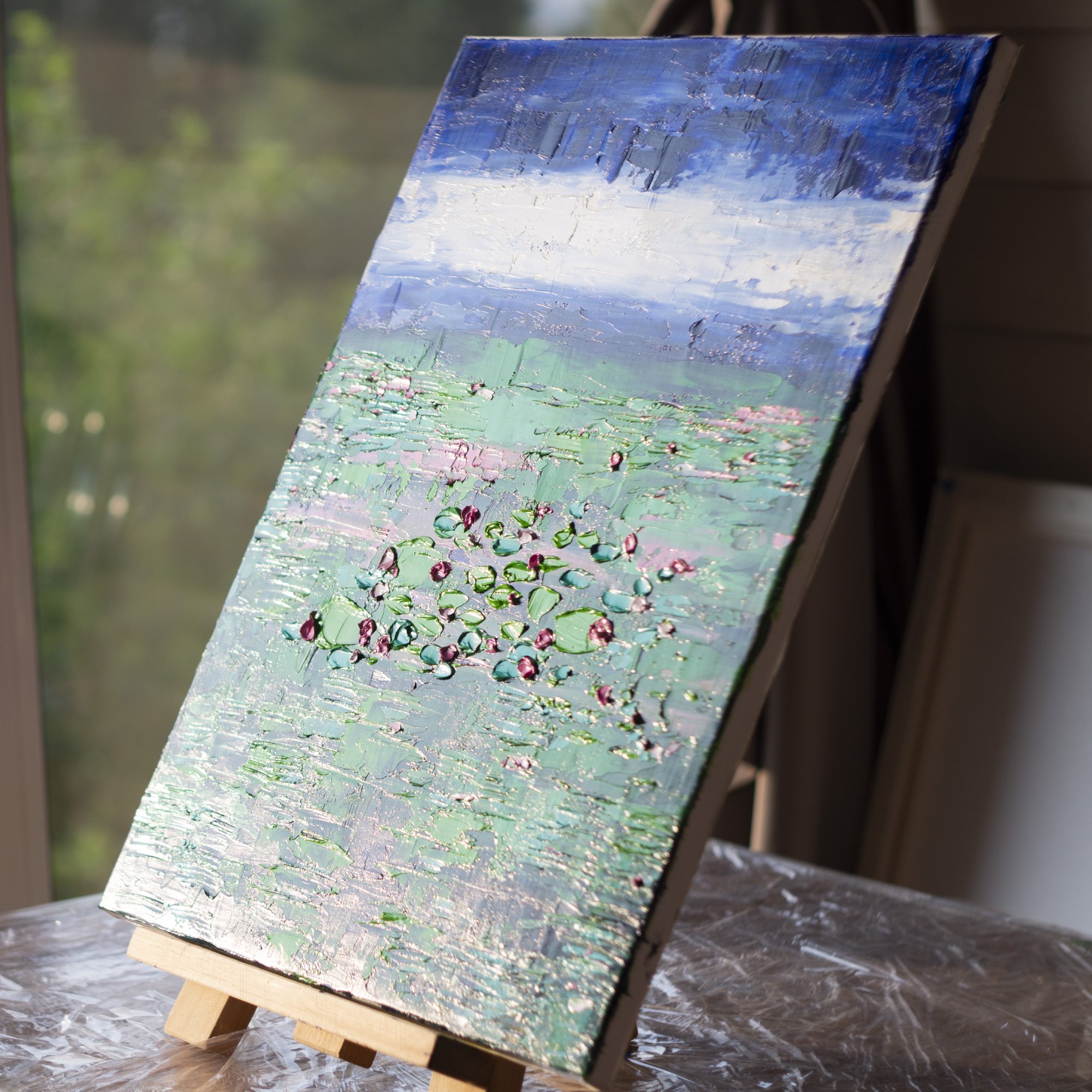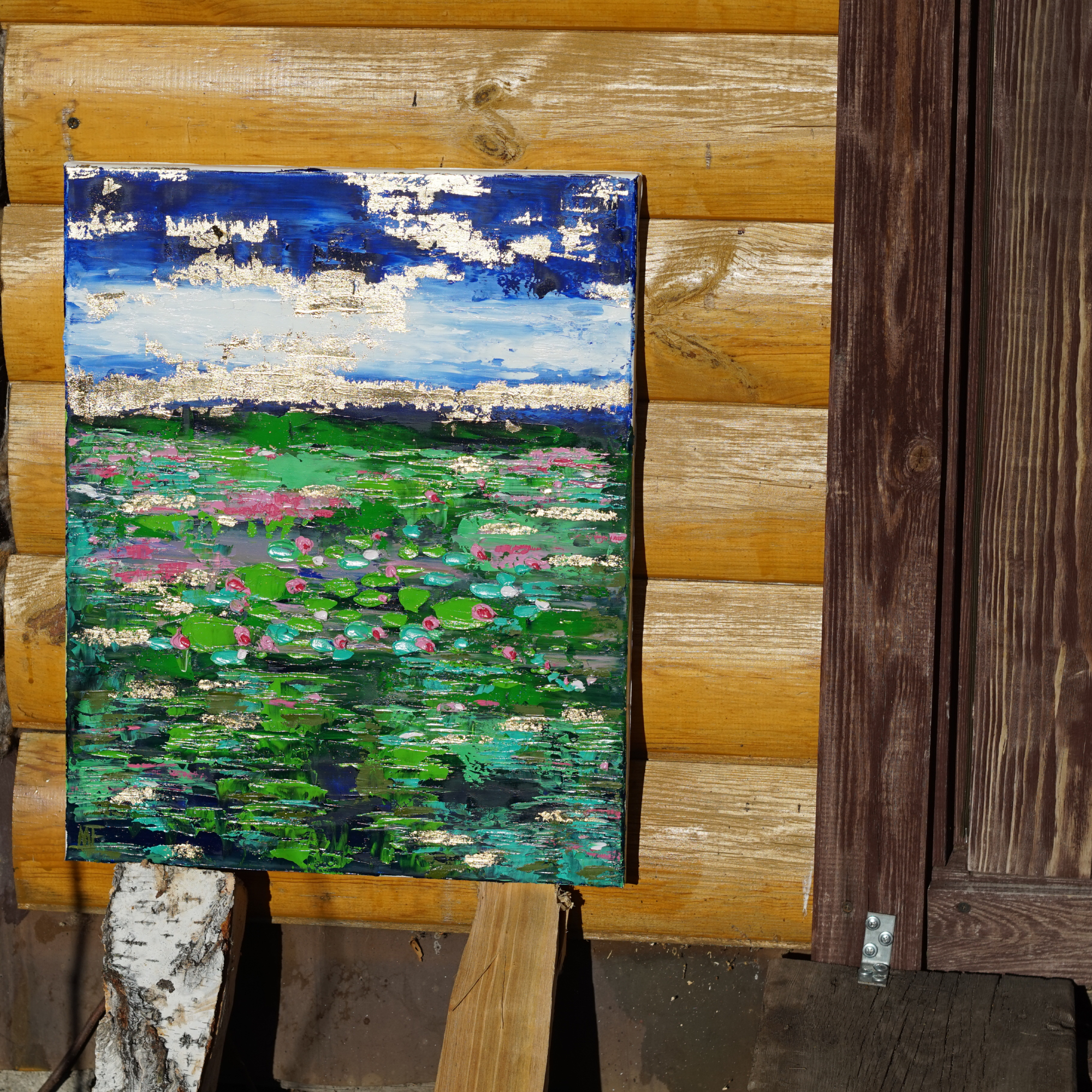 Bring the beauty of nature into your home with this original impasto oil painting. Inspired by a serene pond filled with blooming water lilies, this artwork is created with bold, textured brushstrokes that give it depth and life. Touches of genuine gold leaf shimmer in the sky, capturing the glow of sunlight and adding a sense of elegance.