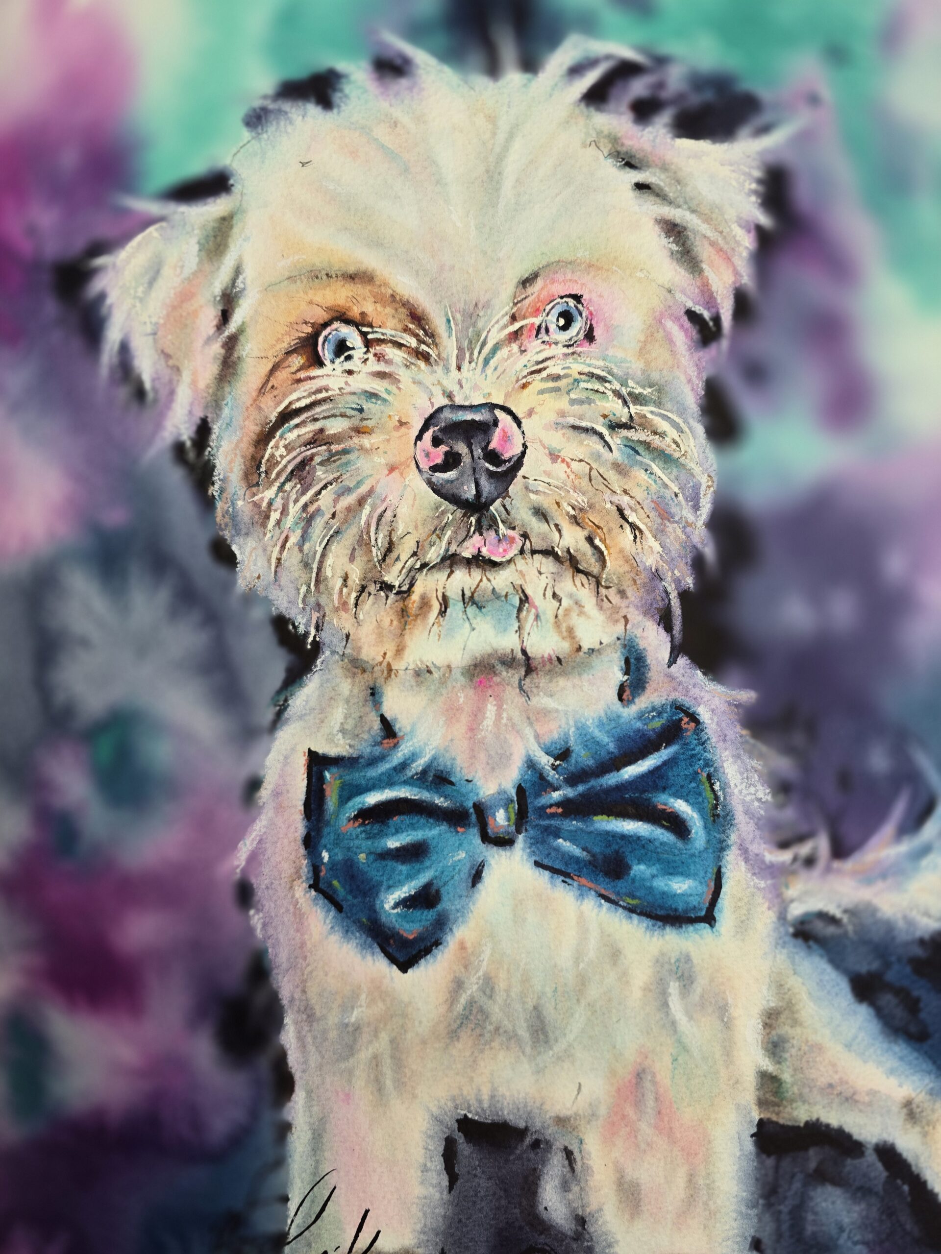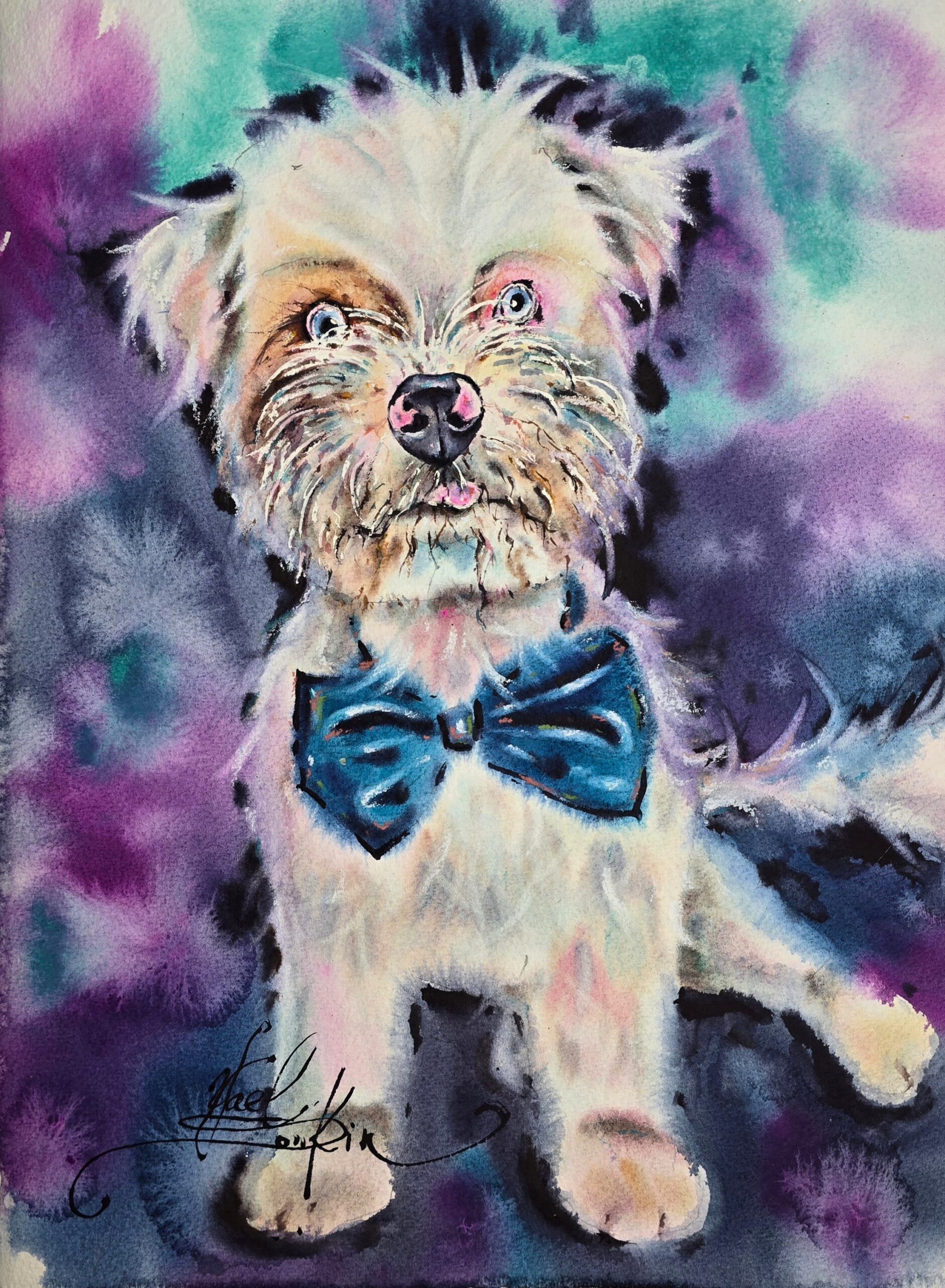 🎨This original watercolor Westiepoo dog portrait is a joyful piece of pet wall art that will brighten up your home. The Westiepoo – a charming mix of West Highland Terrier and Poodle – is captured here with expressive eyes, fluffy fur, and a stylish blue bow .