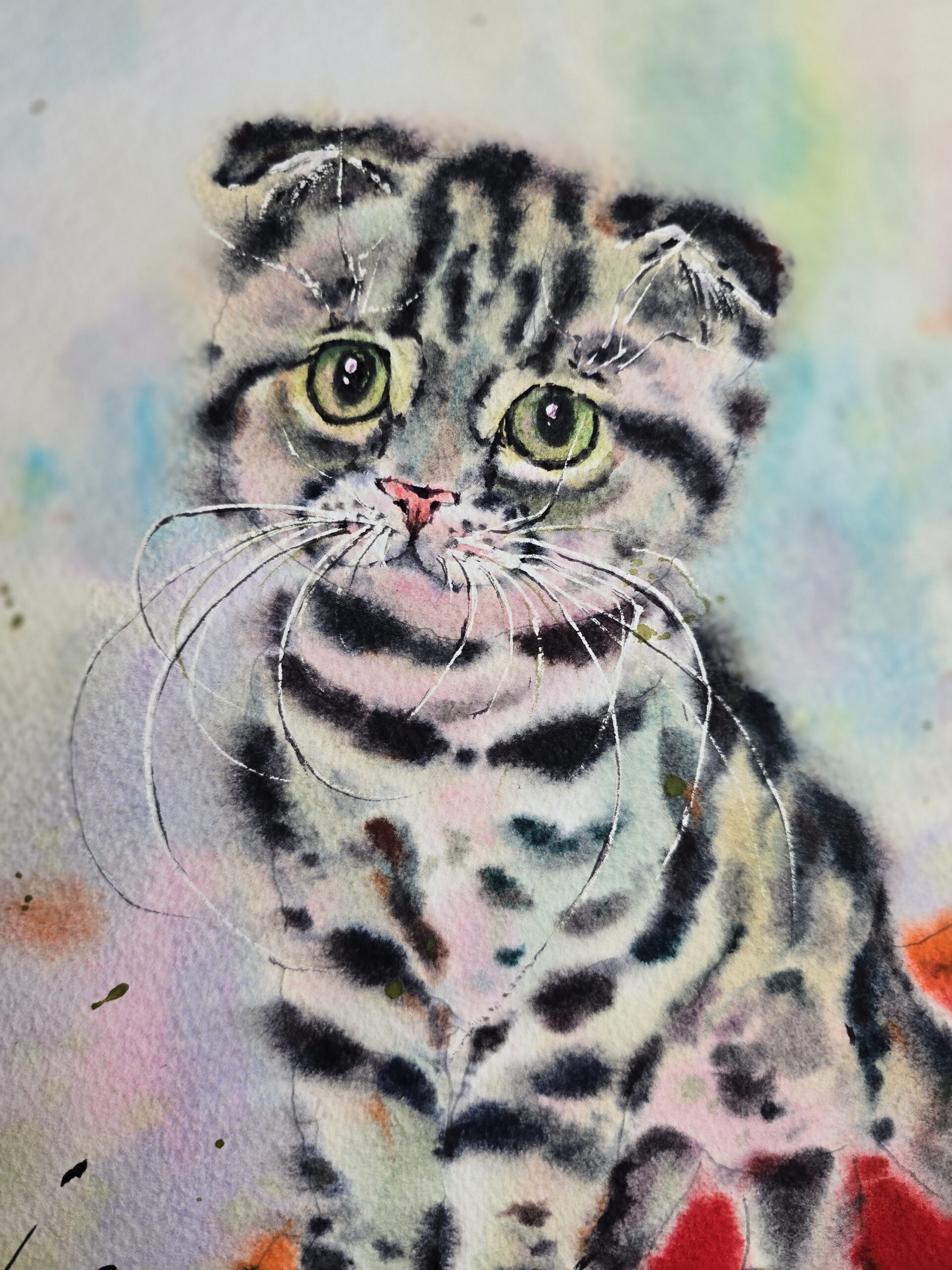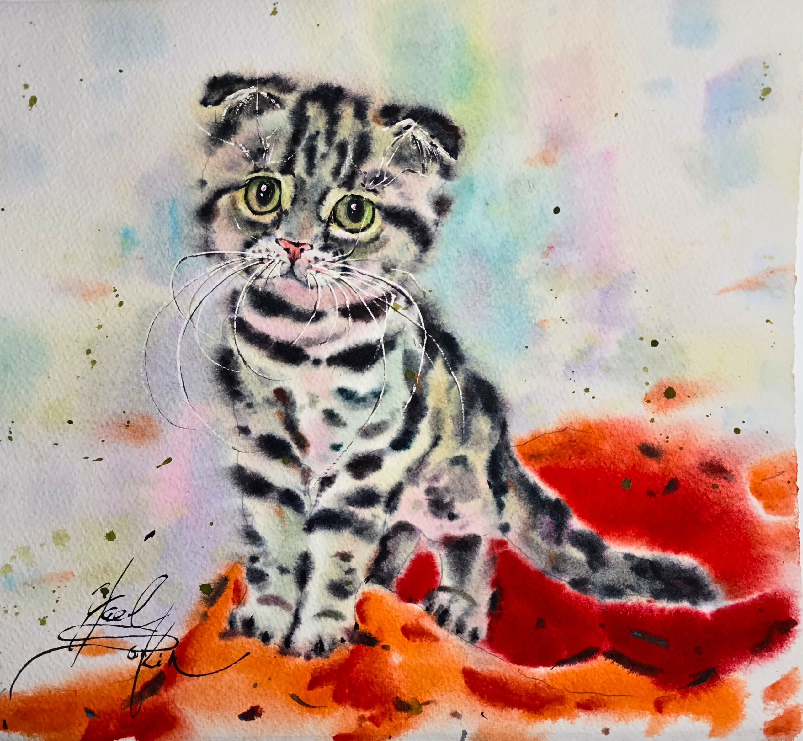 🎨“Whiskers of Wonder“ is an original watercolor painting that captures the charm and innocence of a playful tabby kitten with bright green eyes. Set against a soft, colorful background and a vivid red fabric, this artwork radiates warmth, tenderness, and a sense of joy.