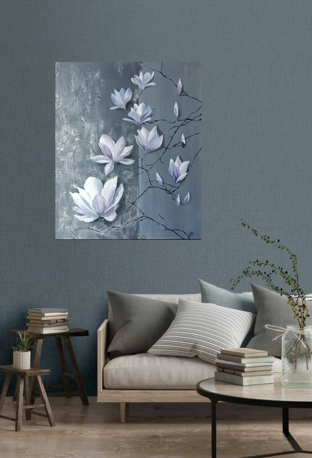 В стиле грубых текстур и воздушной легкости возникает образ, где нежные бело-сиреневые бутоны, так называемые фонарики, вырастают из тонких окрашенных веток. Эта работа приглашает зрителя приблизиться поближе, прислушаться к тихому диалогу между природой и временем и найти в ней свое личное пространство для воспоминаний и надежд.