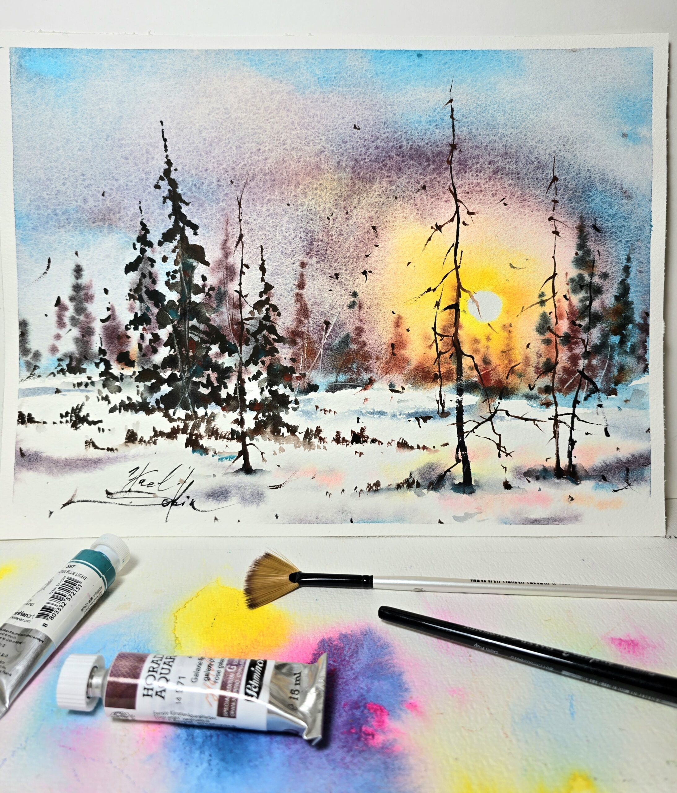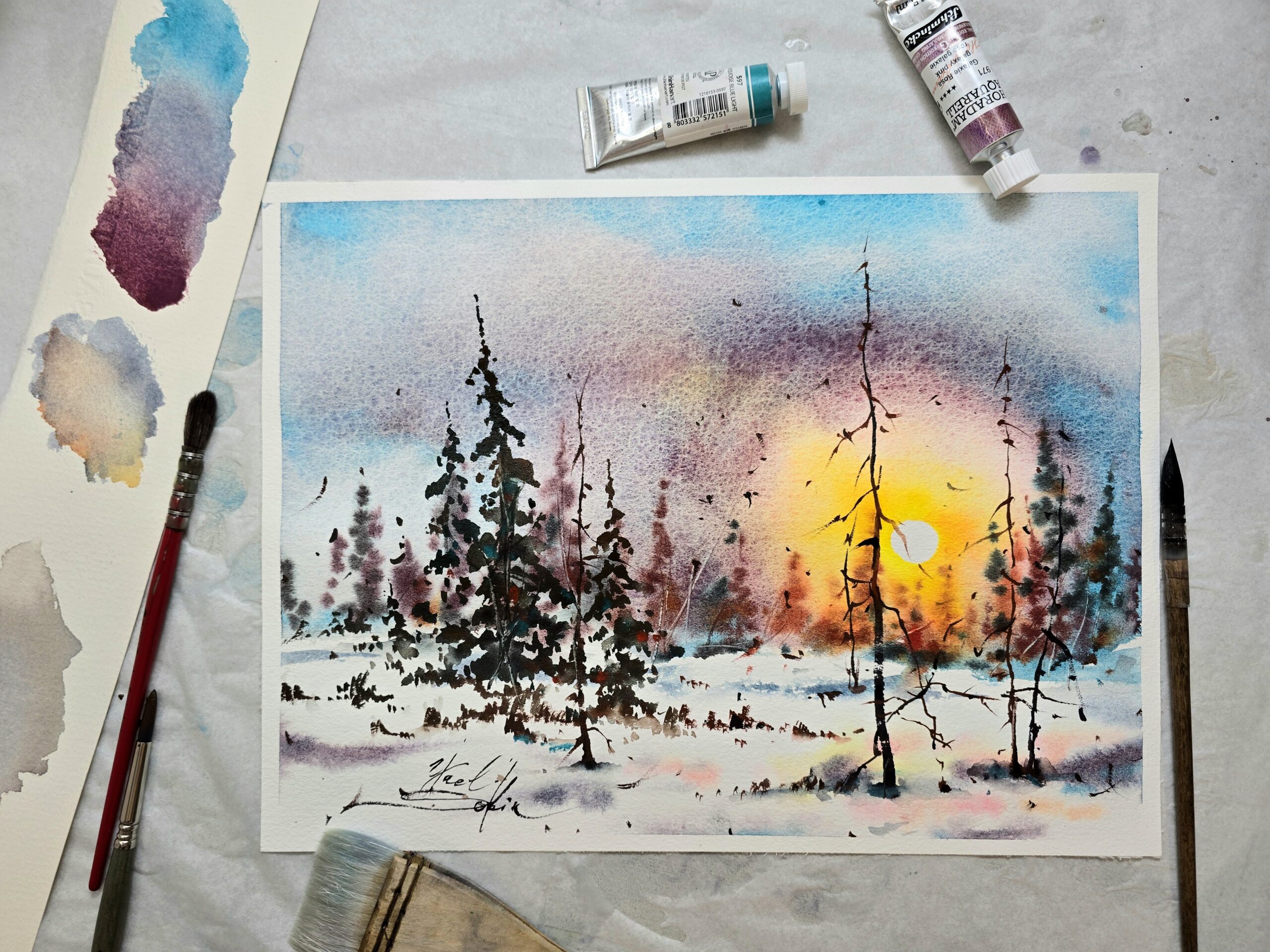 🖌️The warm glow of the sun contrasts with the cool tones of snow, creating a peaceful and atmospheric landscape. Painted with professional watercolors on high-quality paper, this artwork captures the stillness of nature and the quiet poetry of winter.
