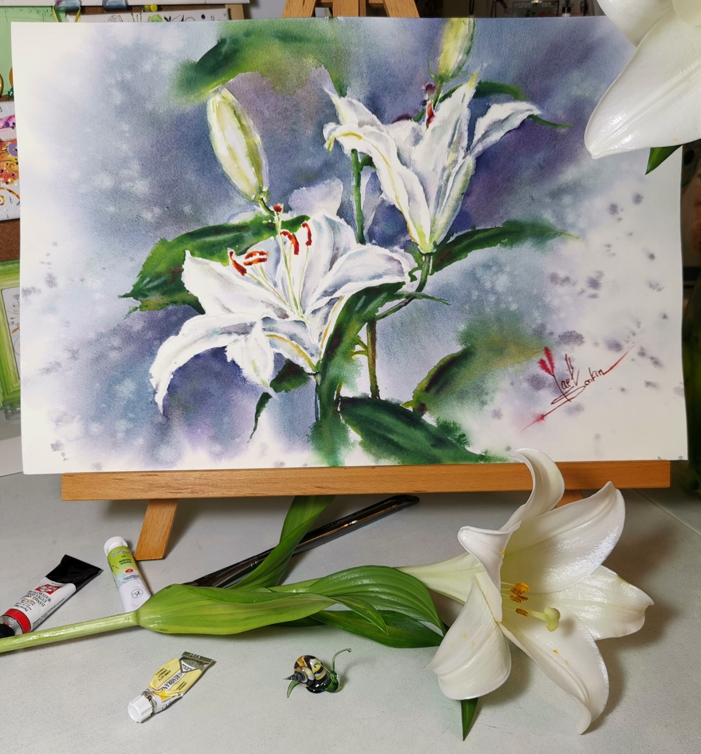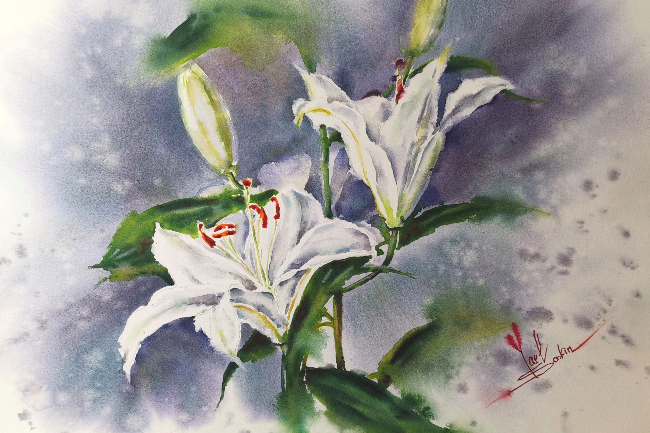 🎨This original watercolor painting captures the timeless beauty of white lilies in full bloom.
