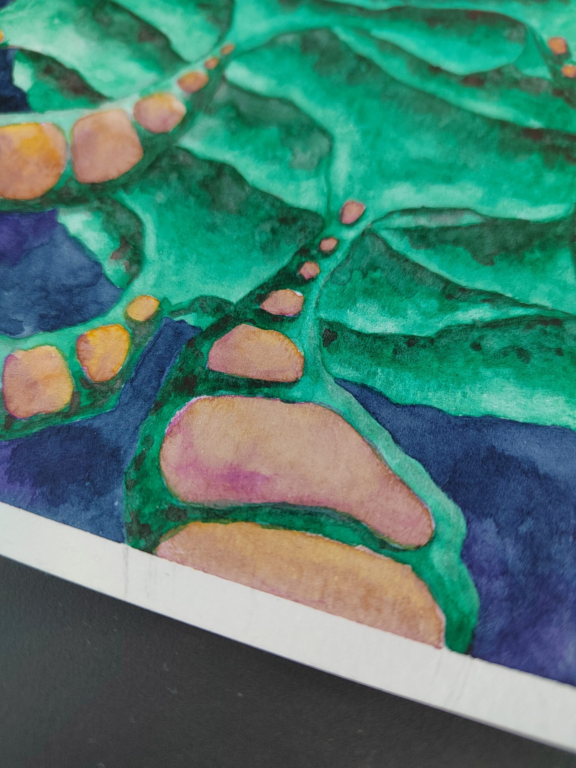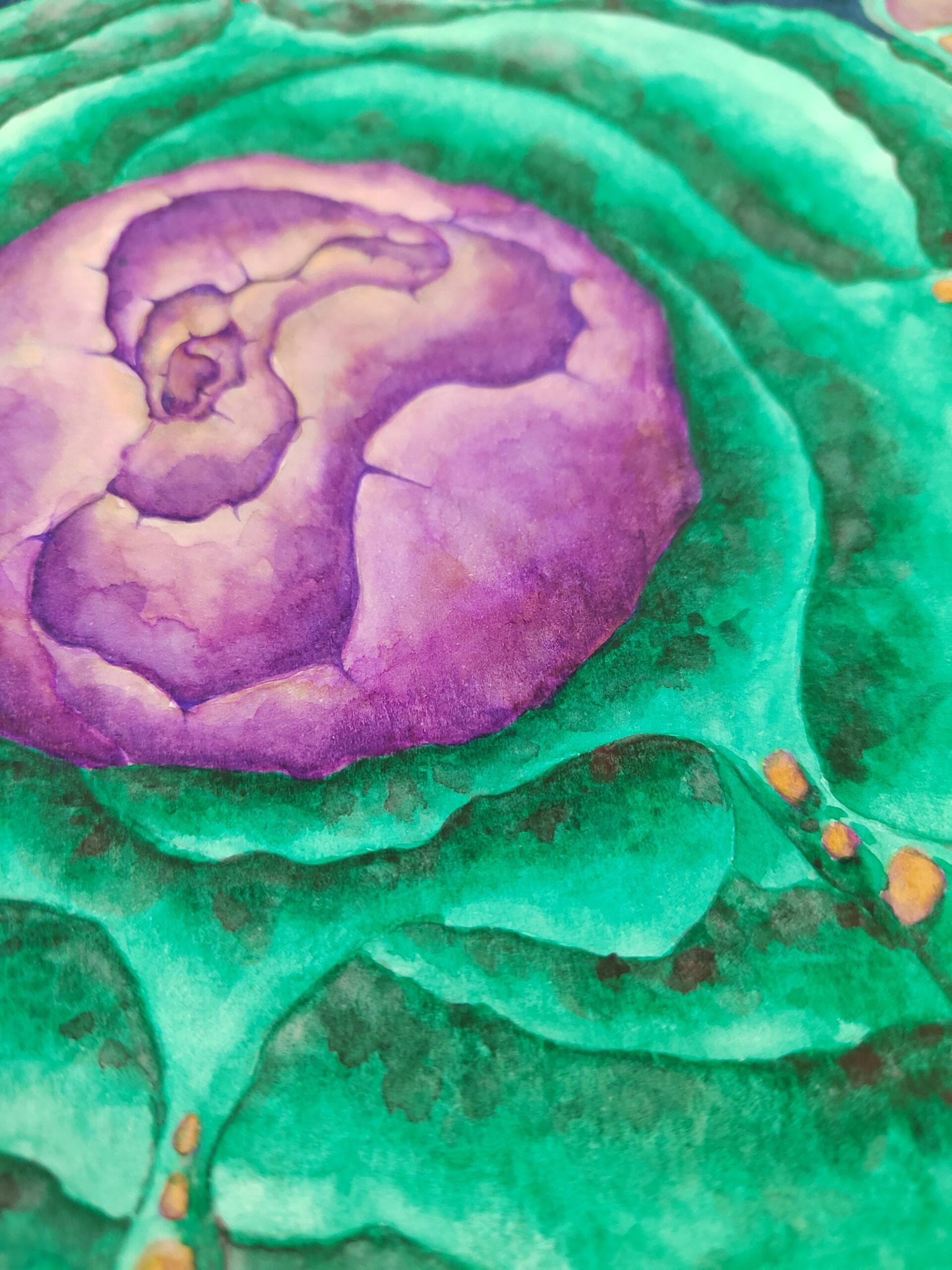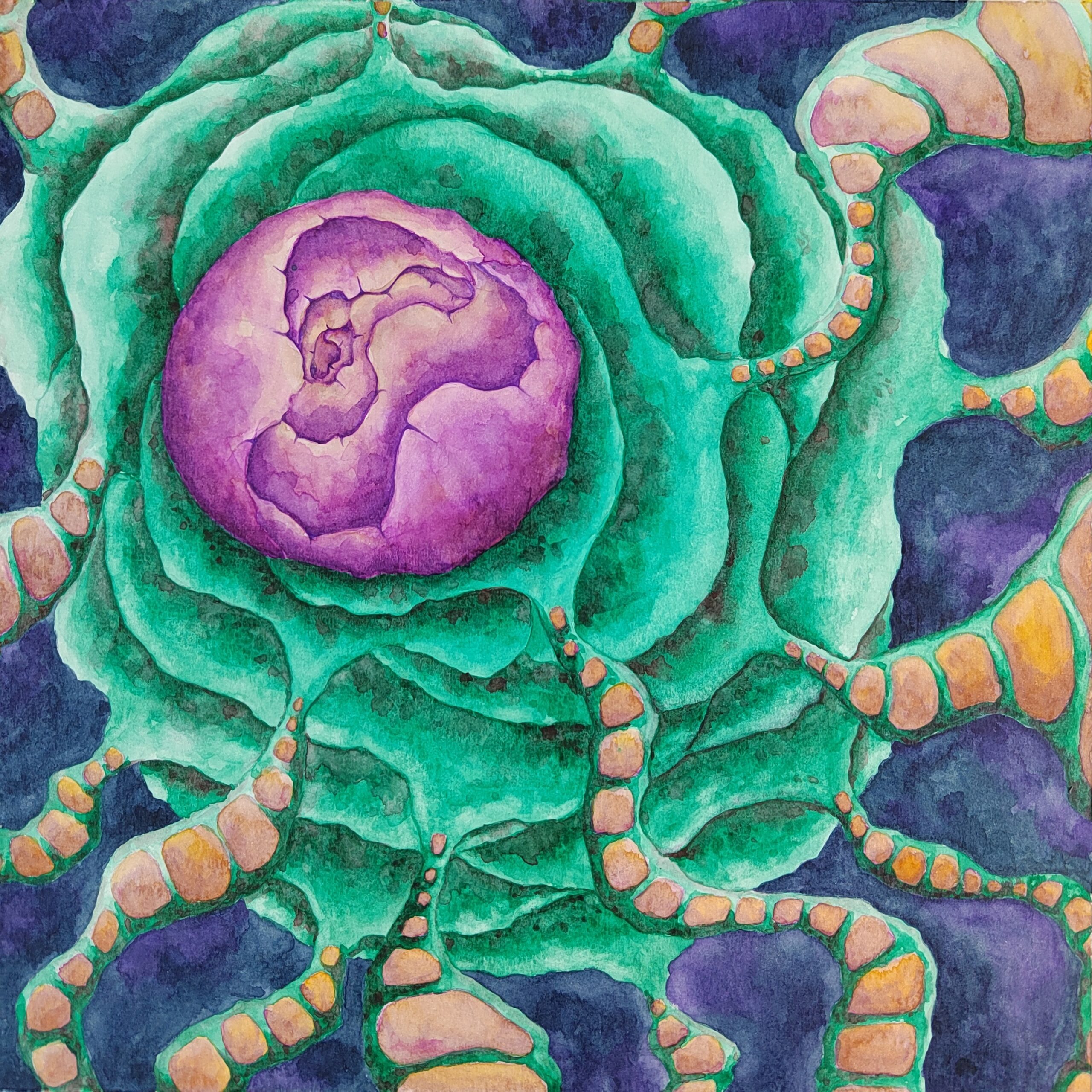 You Are the Universe invites you to explore a cosmic landscape where vibrant colors and organic forms intertwine. At its heart lies a luminous purple core, radiating energy, encircled by rippling green shapes that evoke alien flora or flowing energy fields. Orange pathways thread delicately through the scene, like lifelines or connections binding all things. Set against a deep indigo background, the painting blurs the line between the microscopic and the galactic, offering a meditative reflection on unity, growth, and our place within the vast, mysterious universe.