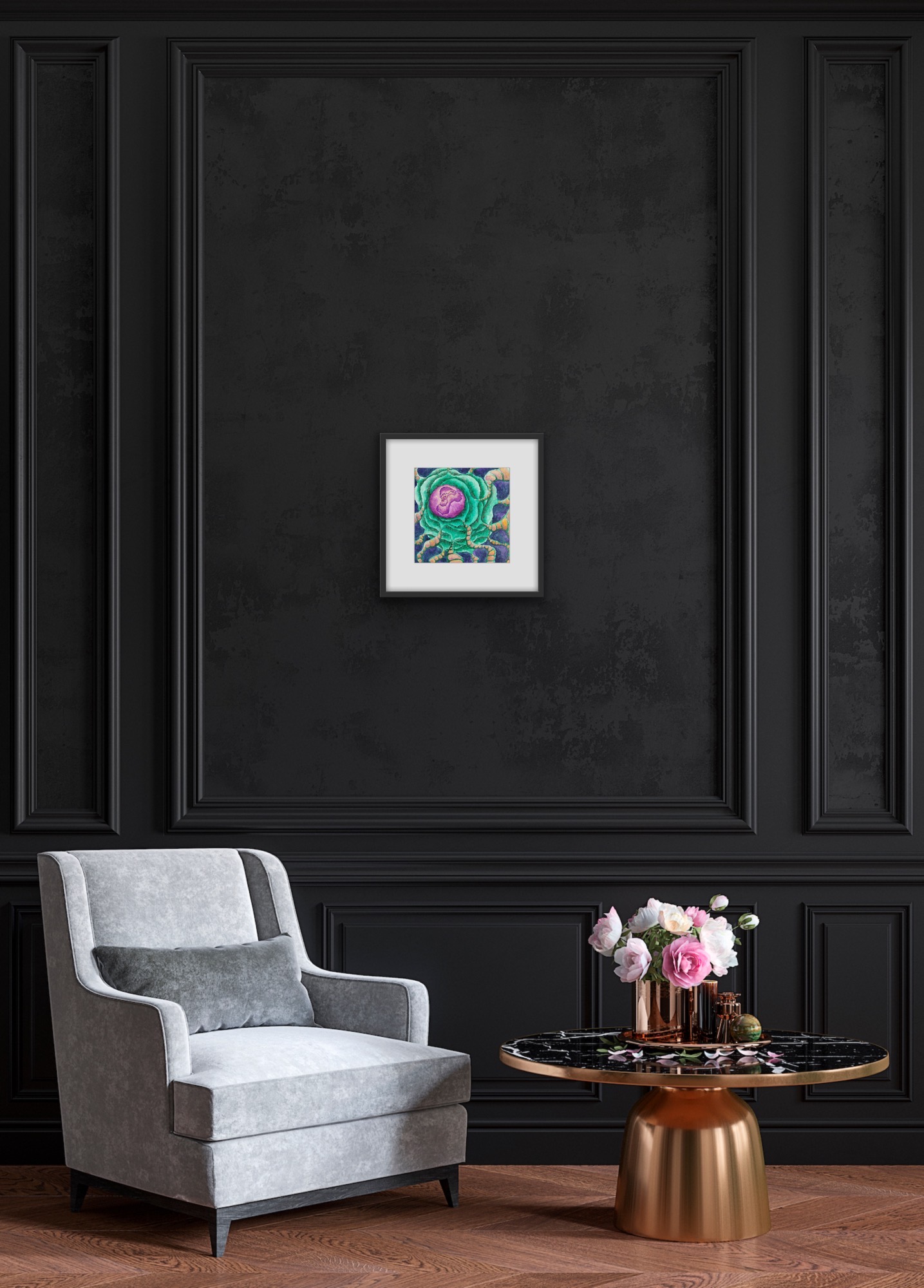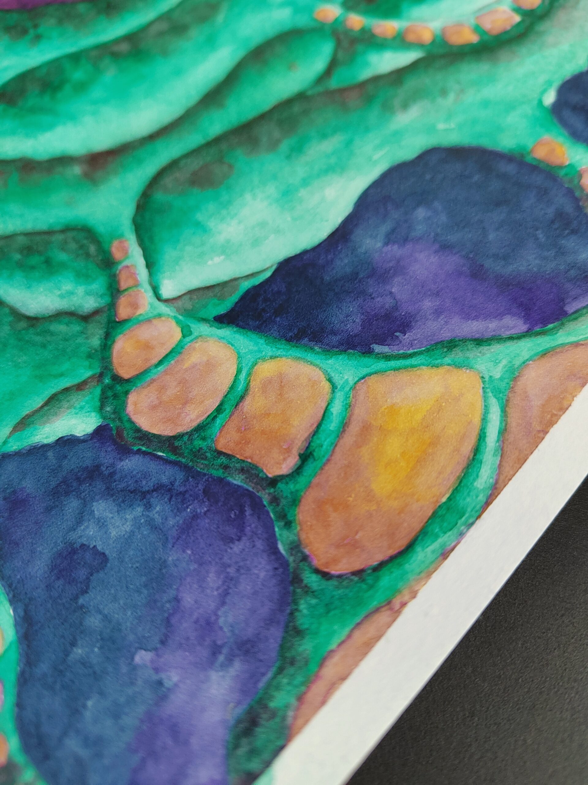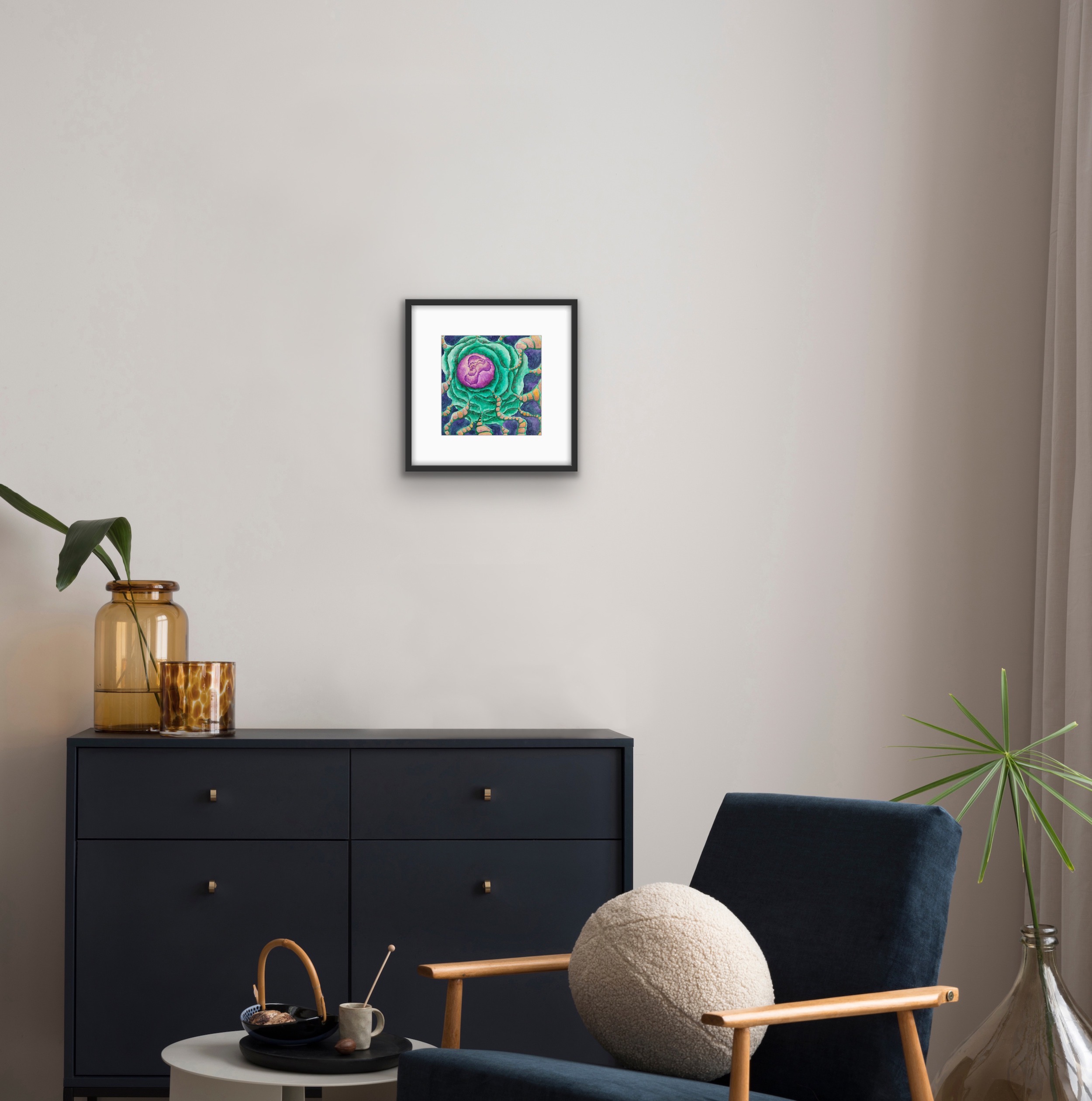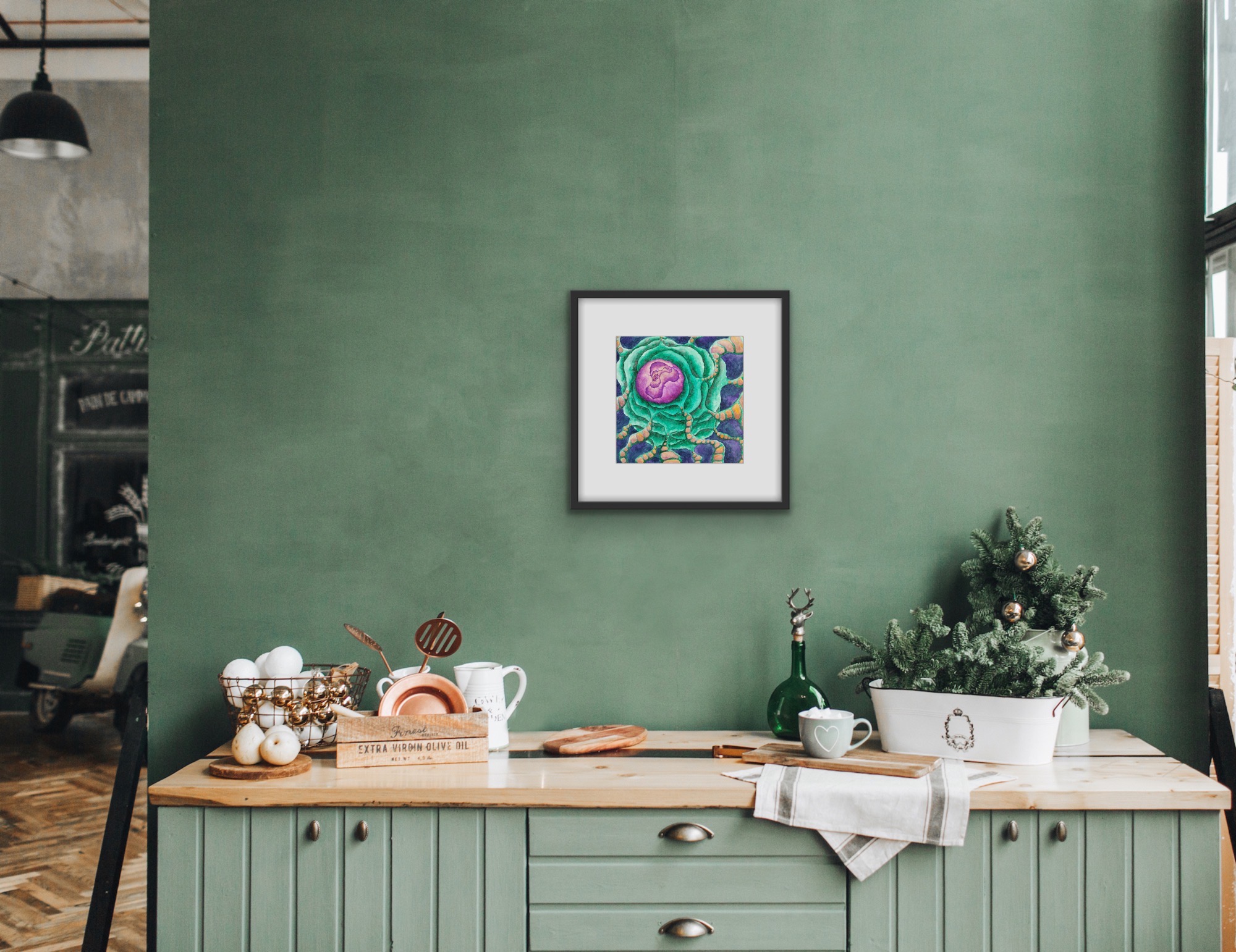 You Are the Universe invites you to explore a cosmic landscape where vibrant colors and organic forms intertwine. At its heart lies a luminous purple core, radiating energy, encircled by rippling green shapes that evoke alien flora or flowing energy fields. Orange pathways thread delicately through the scene, like lifelines or connections binding all things. Set against a deep indigo background, the painting blurs the line between the microscopic and the galactic, offering a meditative reflection on unity, growth, and our place within the vast, mysterious universe.